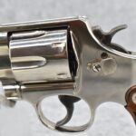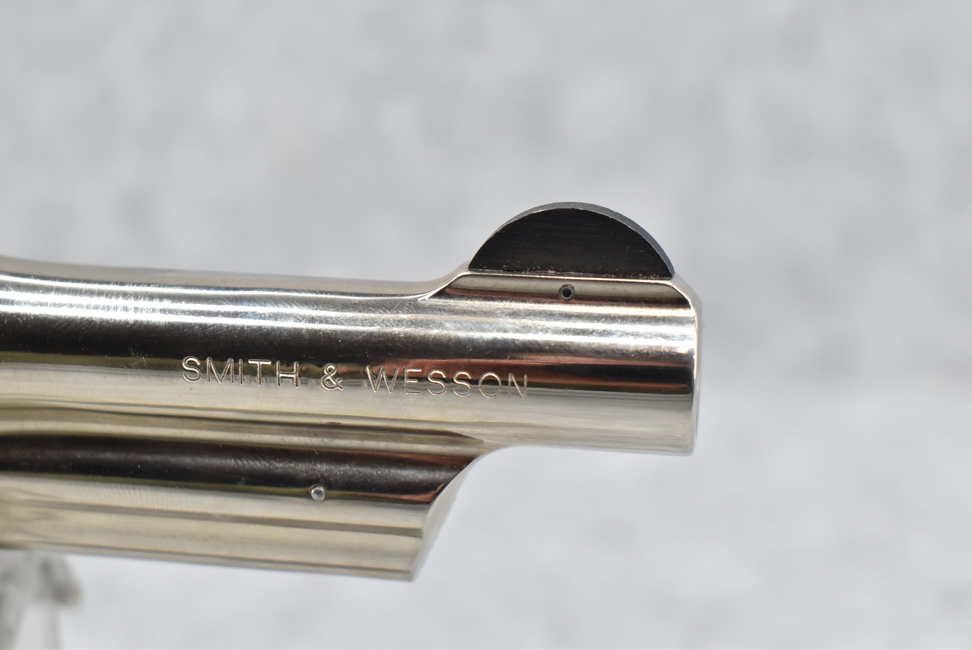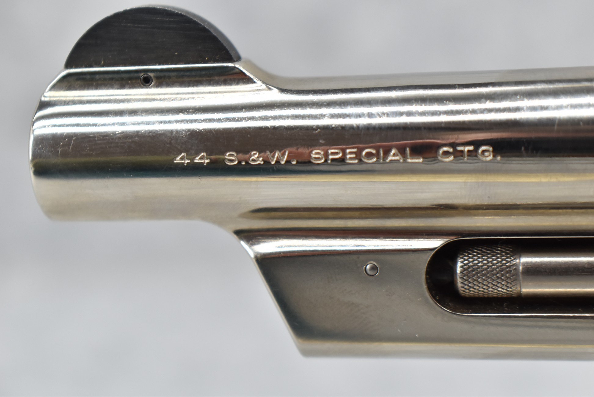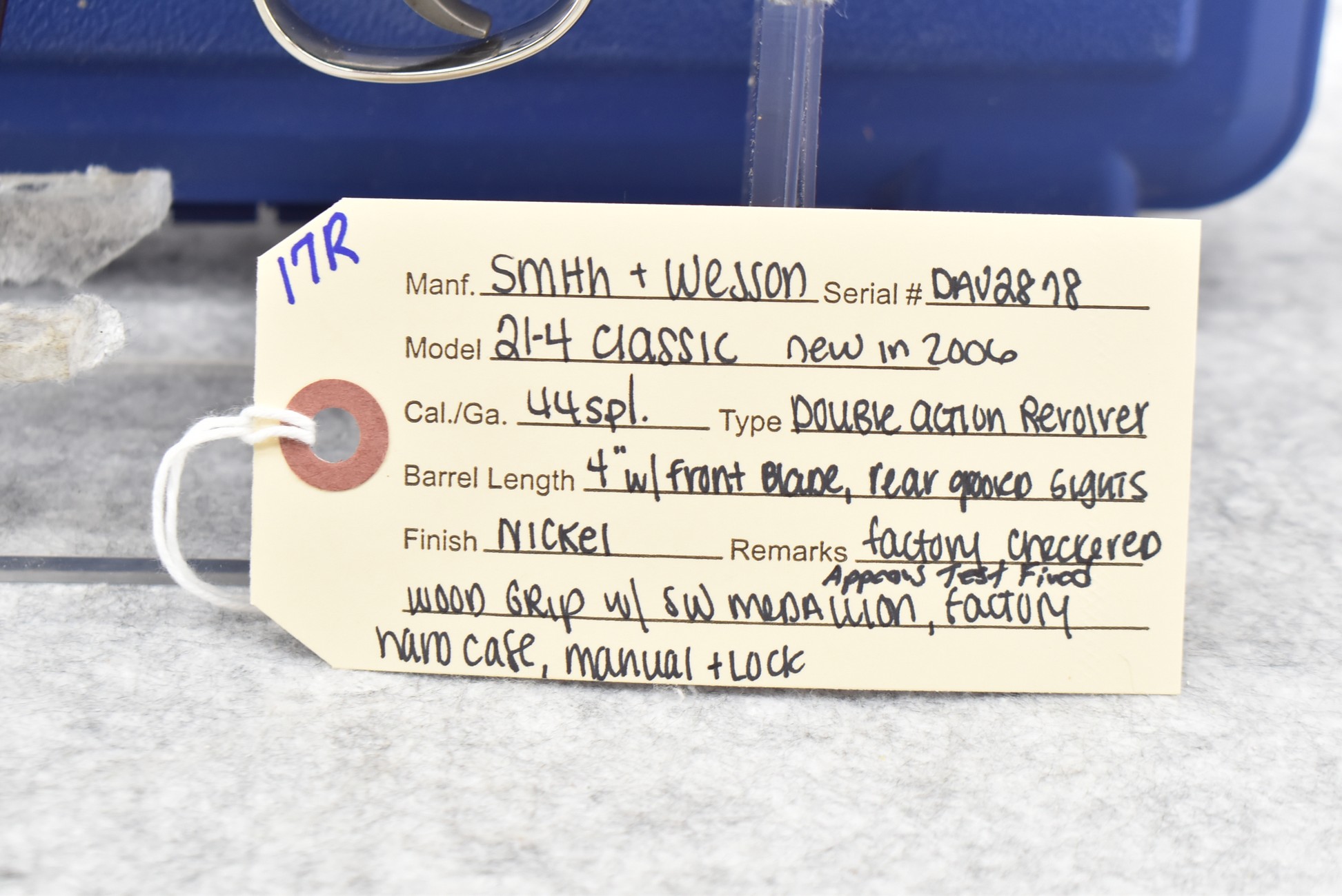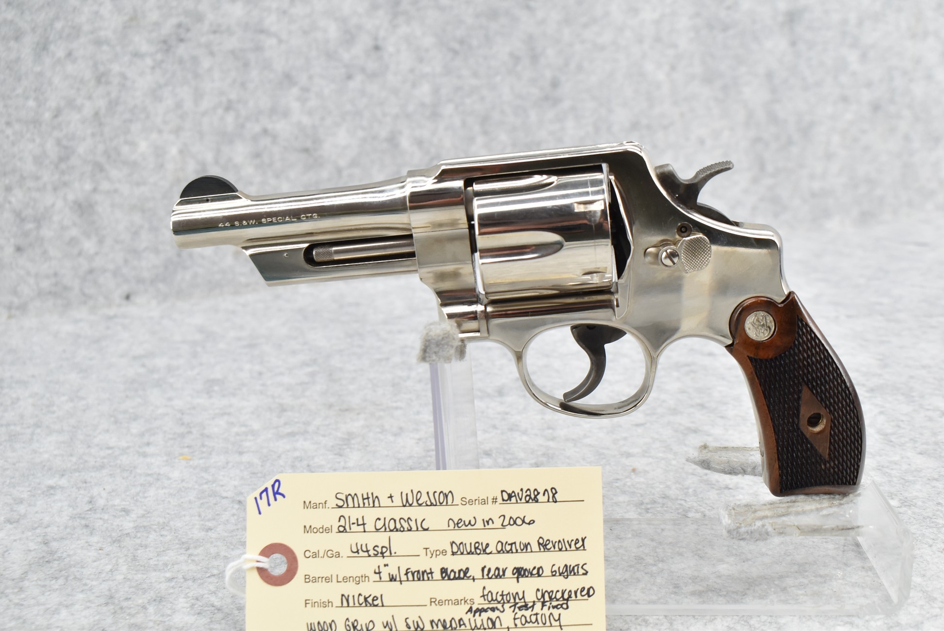17R. Smith & Wesson – Mod. 21-4 Classic – 44 Spl. Cal. Double Action Revolver – w/4” Barrel w/Front Blade & Rear Grooved Sights – Nickel Finish – w/Factory Checkered Wood Grip w/S&W Medallion – Appears Test Fired w/Factory Hard Case & Manual – New in 2006