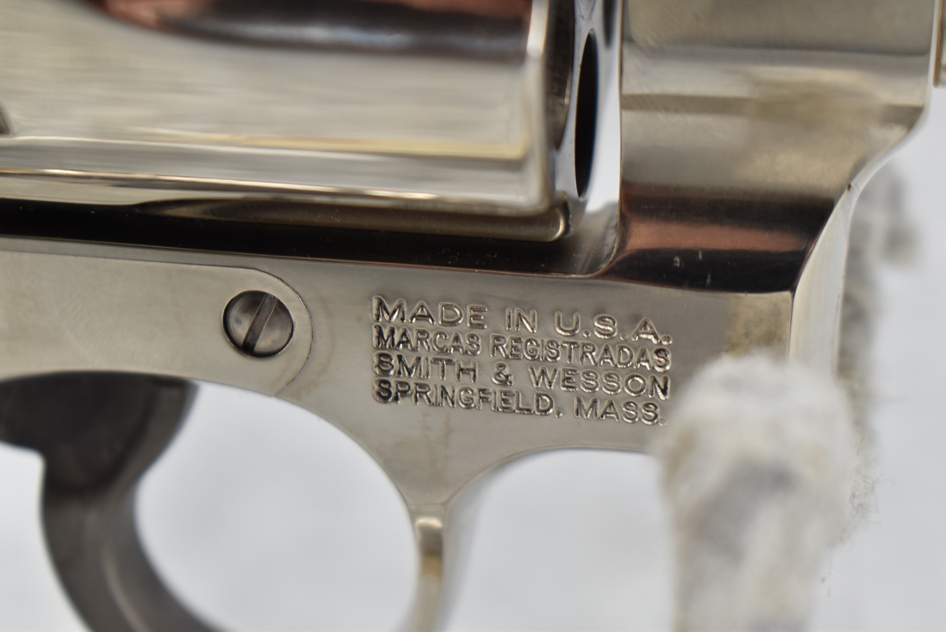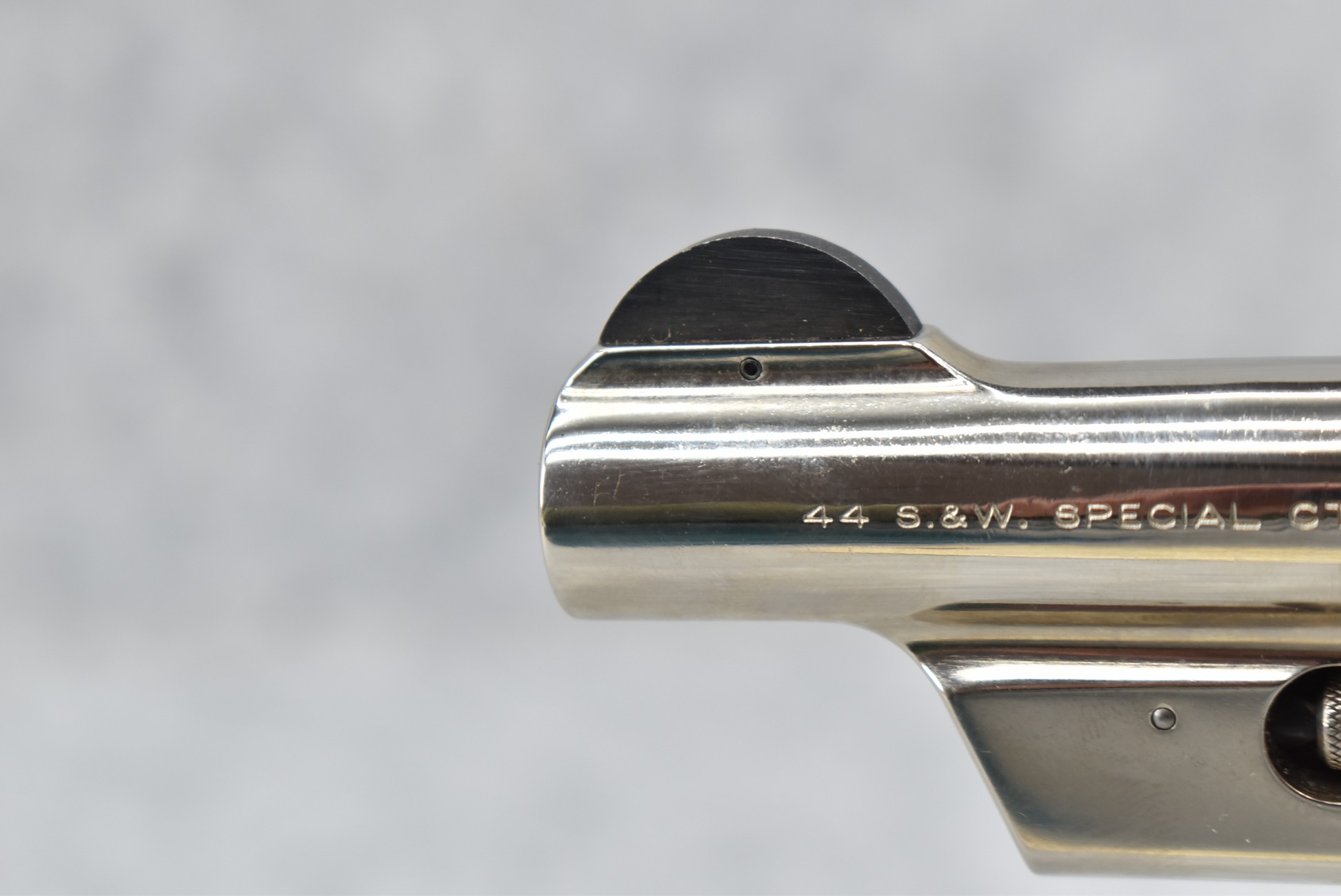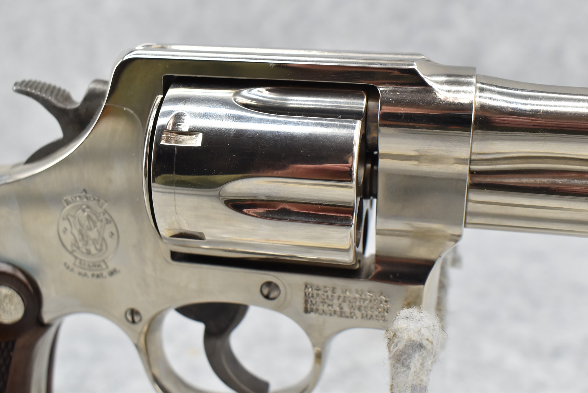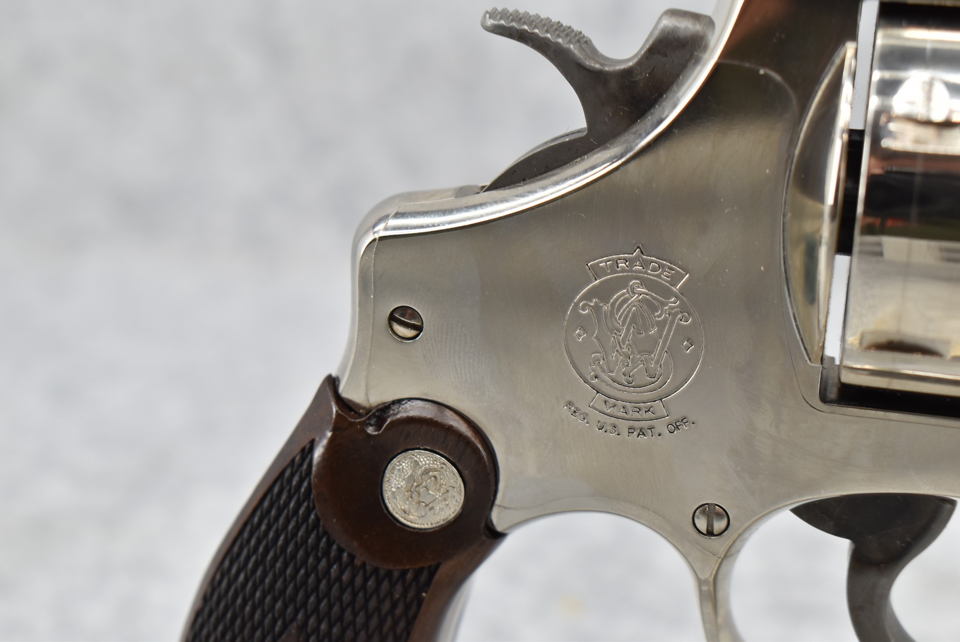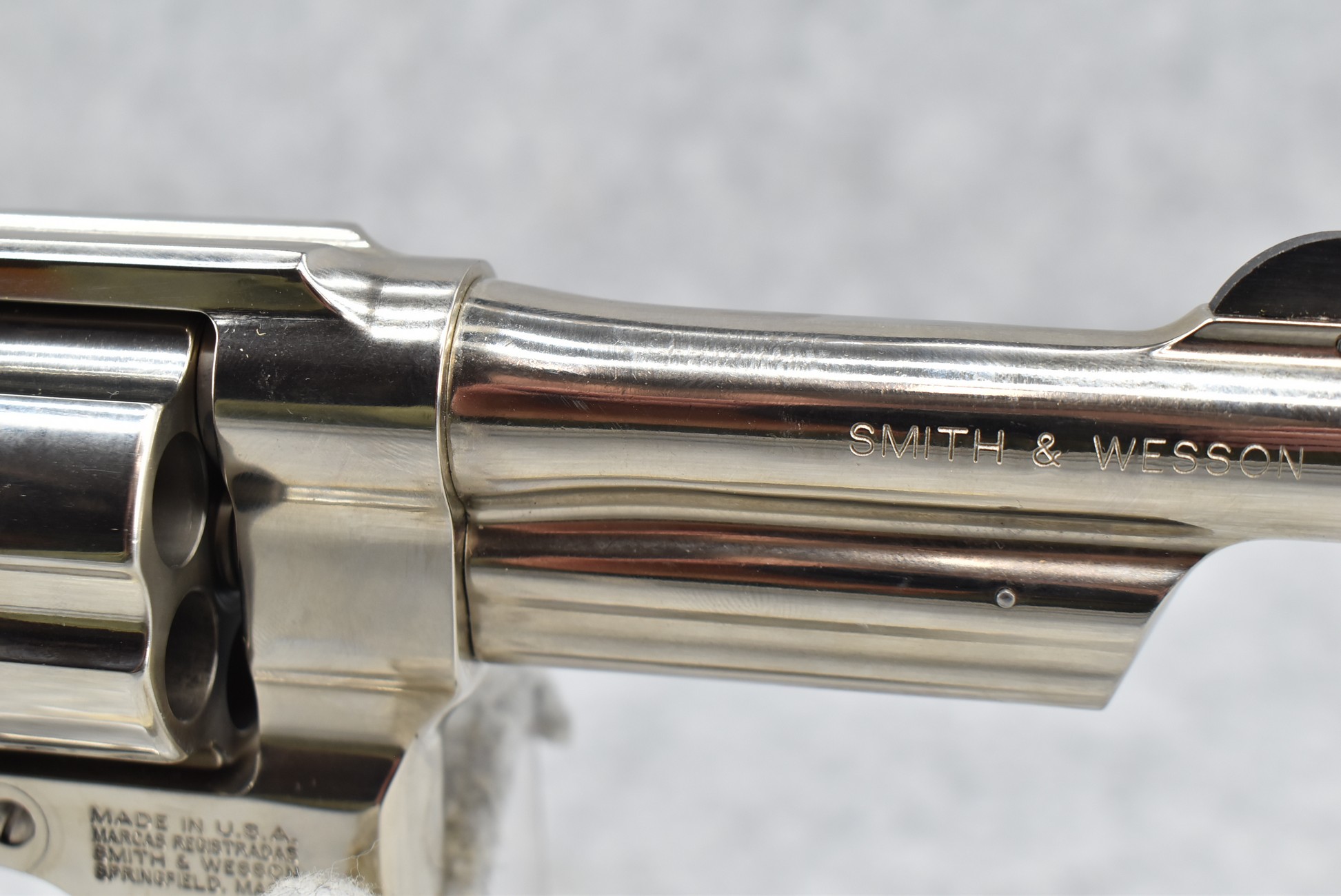 17R. Smith & Wesson – Mod. 21-4 Classic – 44 Spl. Cal. Double Action Revolver – w/4” Barrel w/Front Blade & Rear Grooved Sights – Nickel Finish – w/Factory Checkered Wood Grip w/S&W Medallion – Appears Test Fired w/Factory Hard Case & Manual – New in 2006