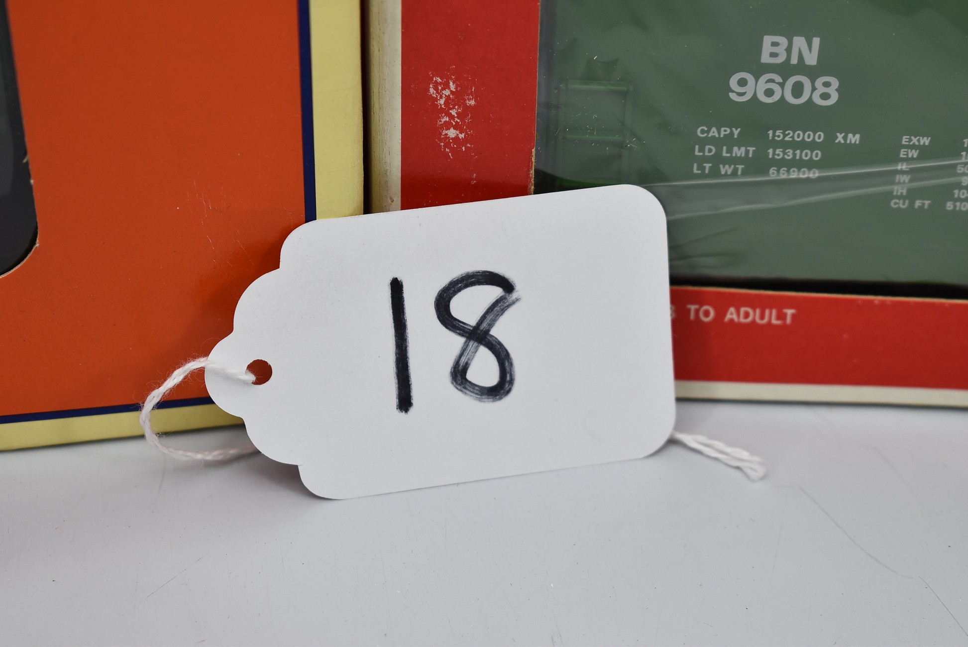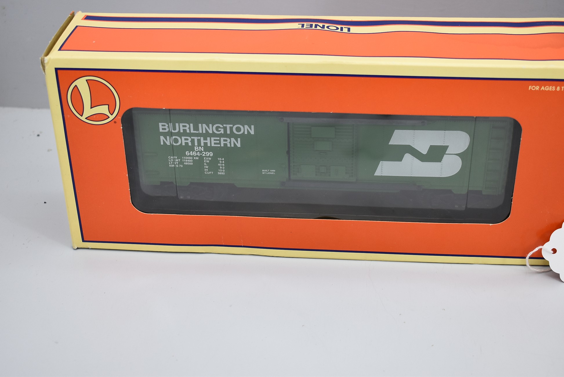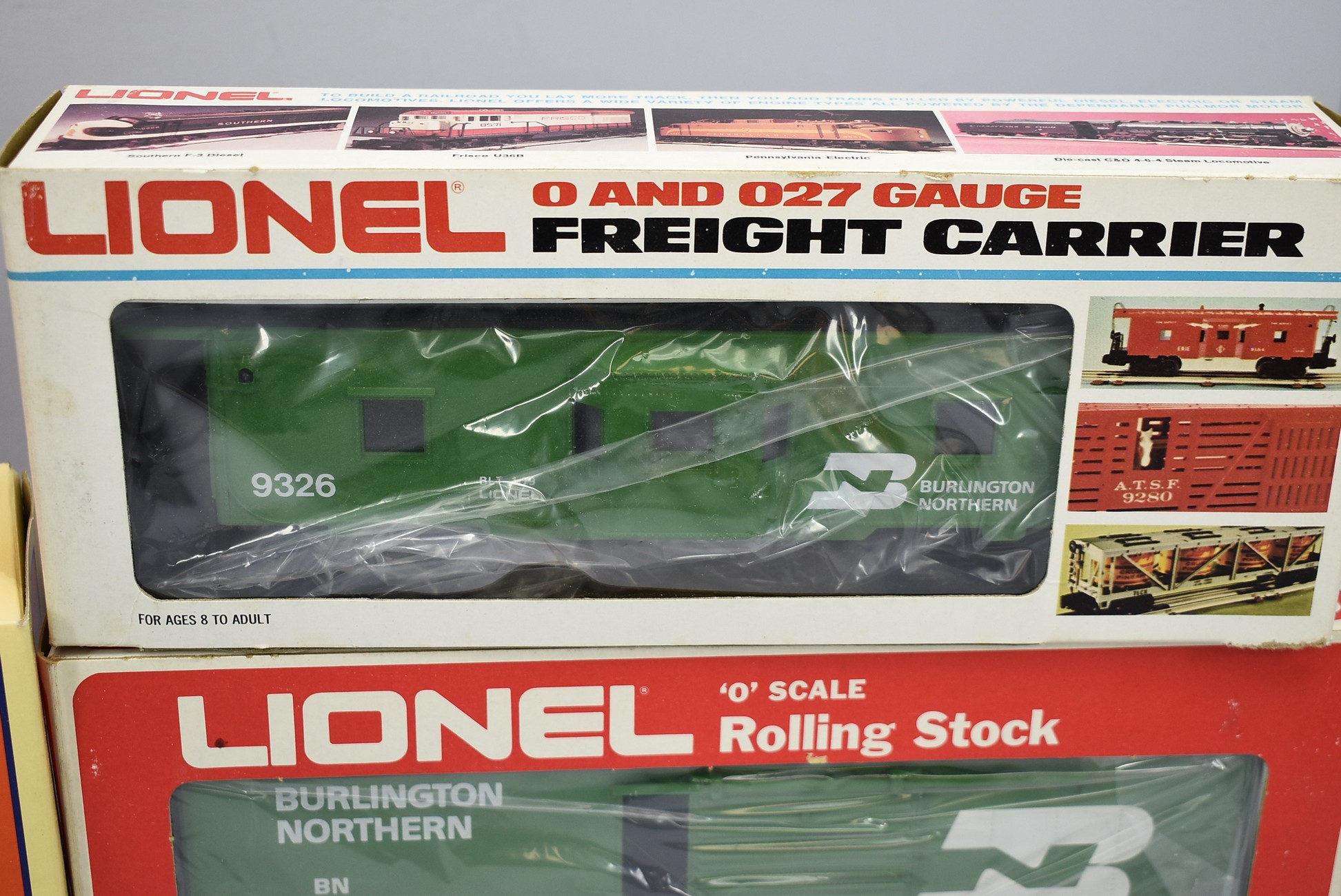 18. Lot of 3 Lionel O-Gauge Train Cars – Including Burlington Northern Bay Window Caboose 6-9326, Burlington Northern Hi-Cube 6-9608, and Burlington Northern Boxcar 6-29251 – All w/Boxes