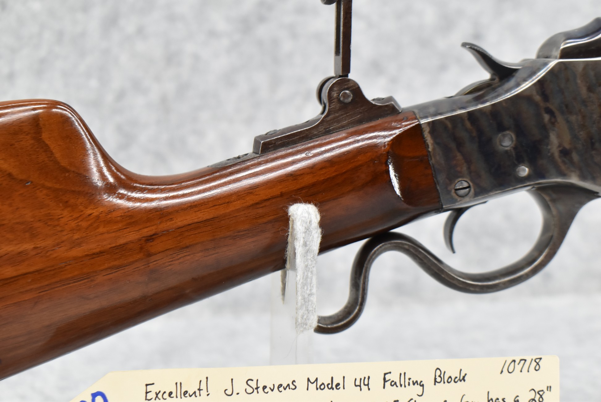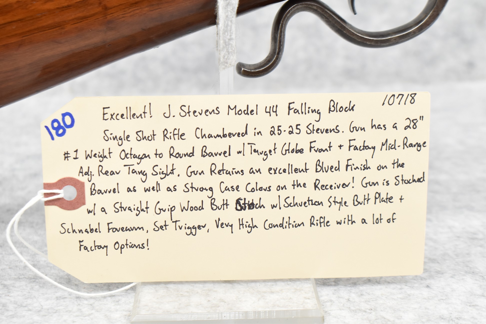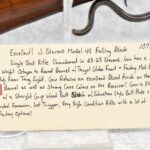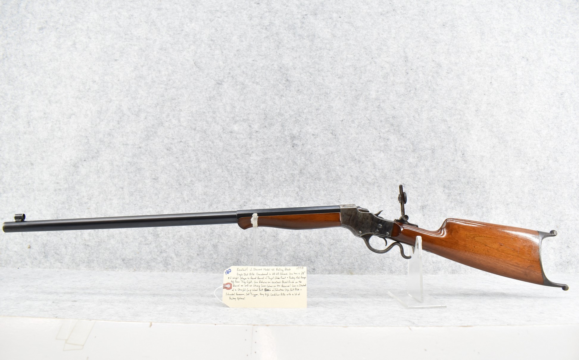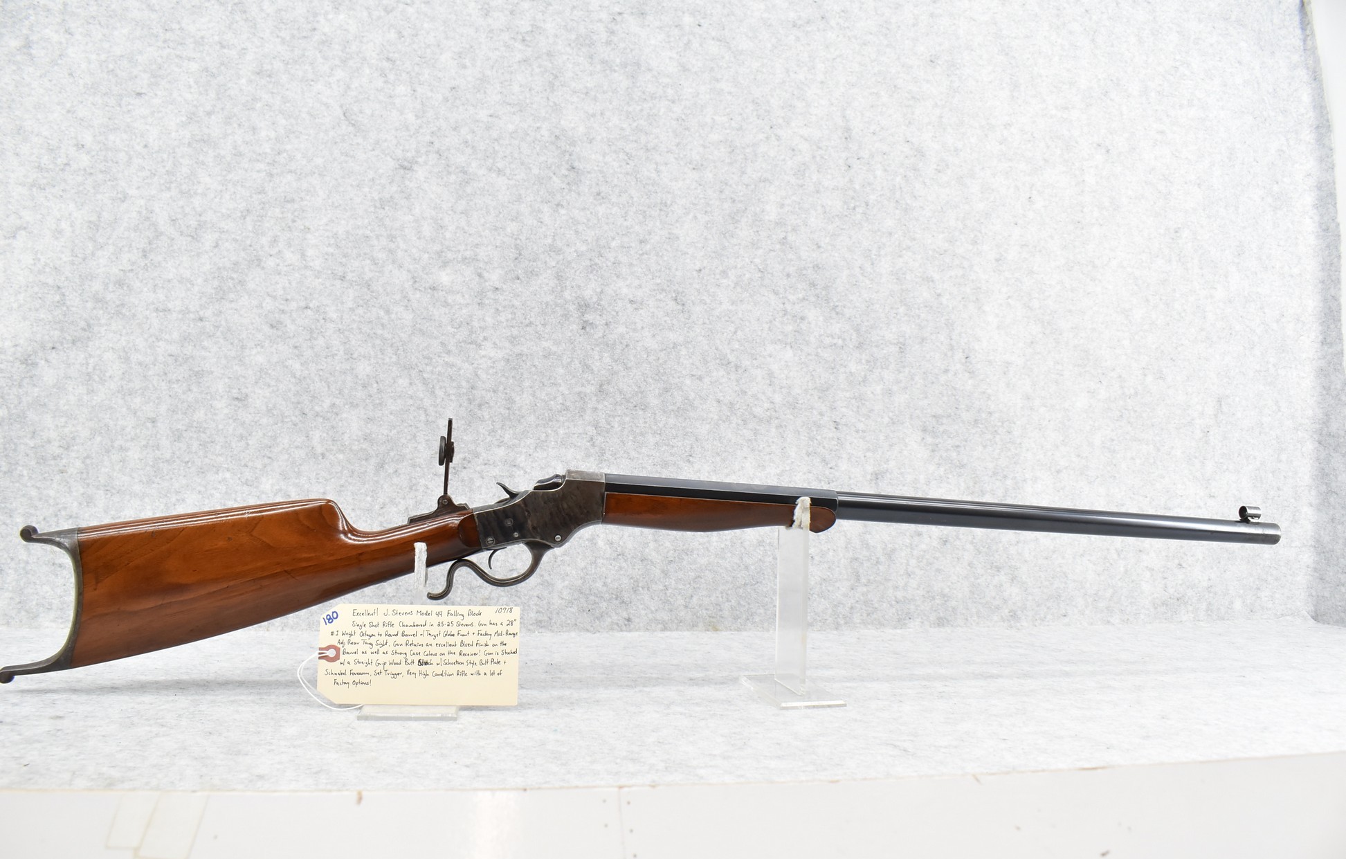 180. Excellent! J. Stevens – Mod. 44 Falling Block – Single Shot Rifle Chambered in 25-25 Stevens – Gun Has a 28” #1 Weight Octagon to Round Barrel w/Target Globe Front (No Rear Dovetail for Rear Barrels Sight) & Factory Mid-Range Adj. Rear Tang Sight – Gun Retains an Excellent Blued Finish on the Barrel as Well as Strong Case Colors on the Receiver! – Gun is Stocked w/a Straight Grip Wood Butt Stock w/Schuetzen Style Butt Plate & Schnabel Wood Forearm – w/Set Trigger – Serial #10718 – Very High Condition Rifle w/a Lot of Factory Options!