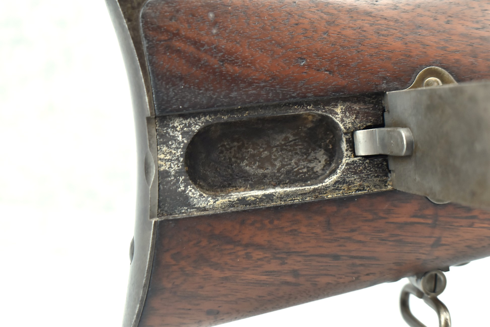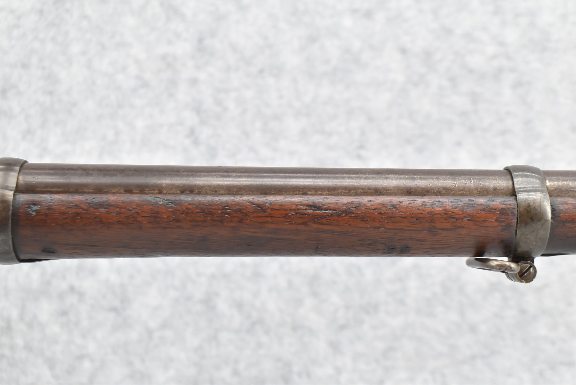 181. Sharps Rifle – New Model 1859 Military Rifle – 52 Cal. Breech Loading Percussion Rifle – w/30” Barrel w/Blade Front & Adj. Rear Ladder Type Sights – Brown/Gray Finish – w/Straight Grip Wood Stock & ¾ Length Wood Forearm w/Metal Butt Plate, Patch Box & Sling Loops – w/Faint Stock Cartouche – w/Double Set Triggers