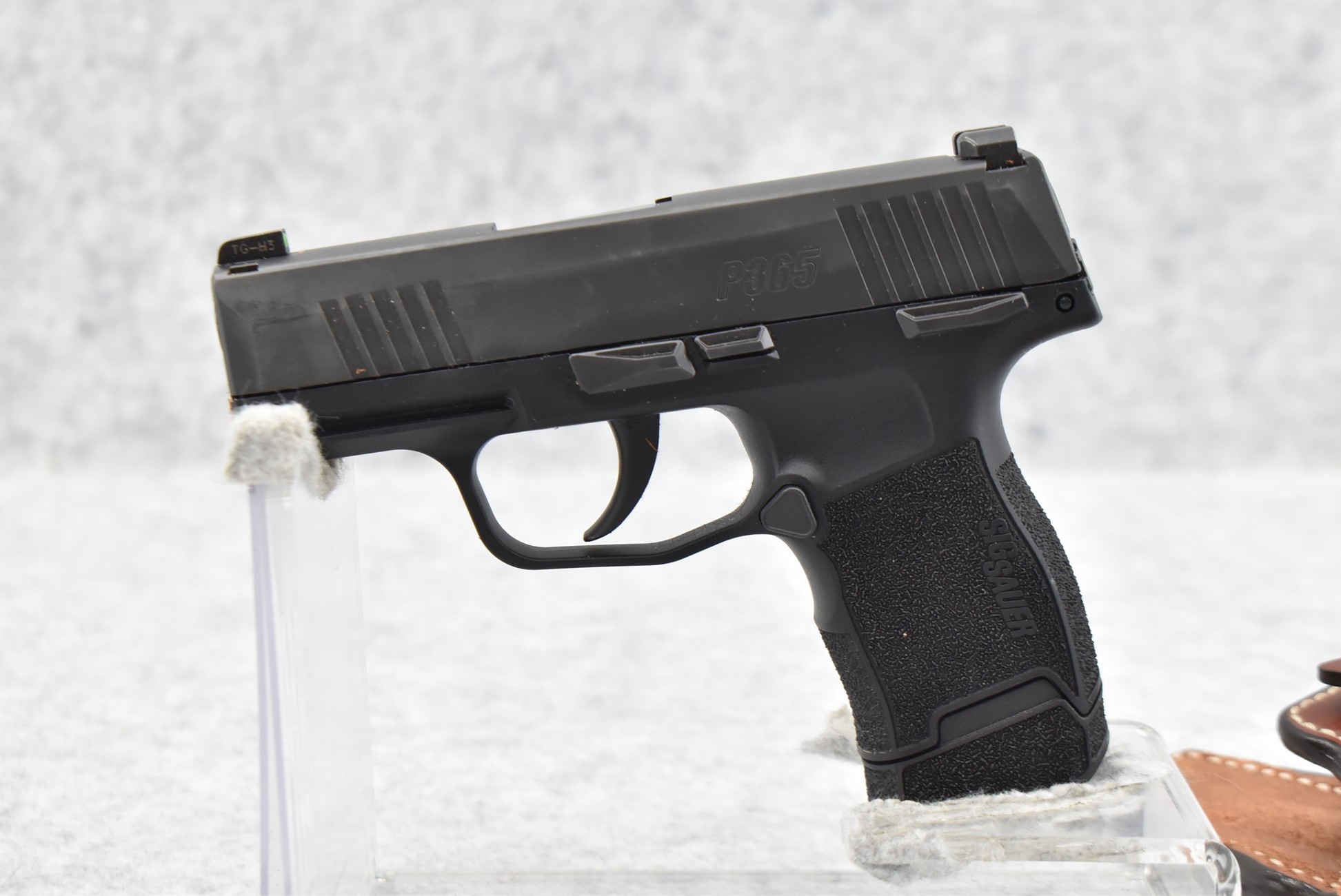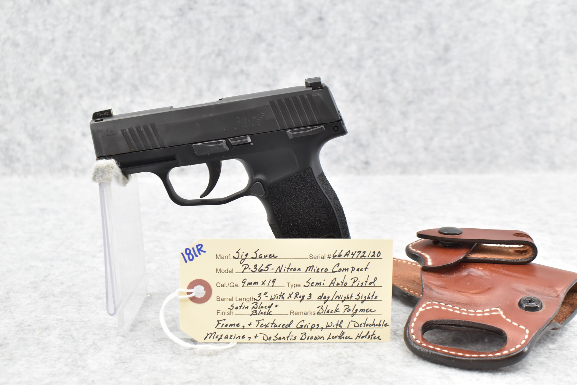 181R. Sig Sauer – Mod. P-365 Nitron Micro Compact – 9mm Cal. Semi-Auto Pistol – w/3” Barrel w/X-Ray 3-Dot Day/Night Sights – Satin Blued Finish – w/Black Polymer Frame and Textured Grips – w/1 Detachable Magazine – w/Desantis Brown Leather Holster