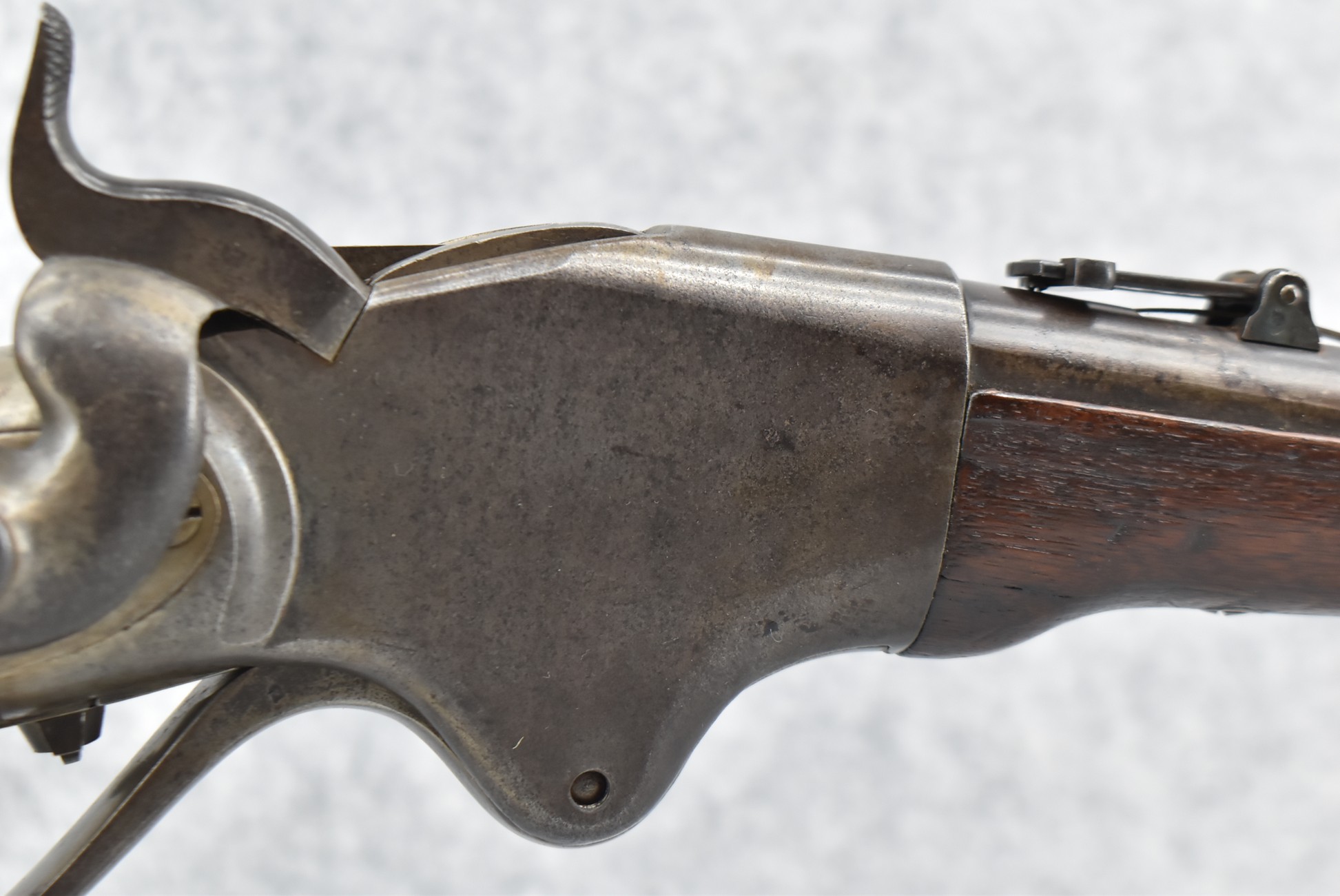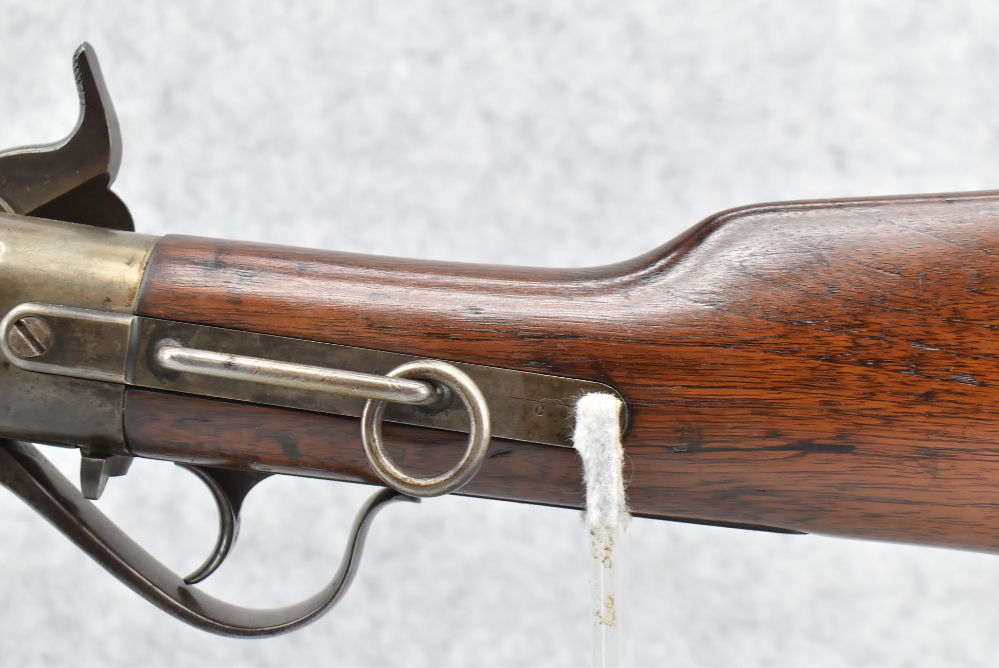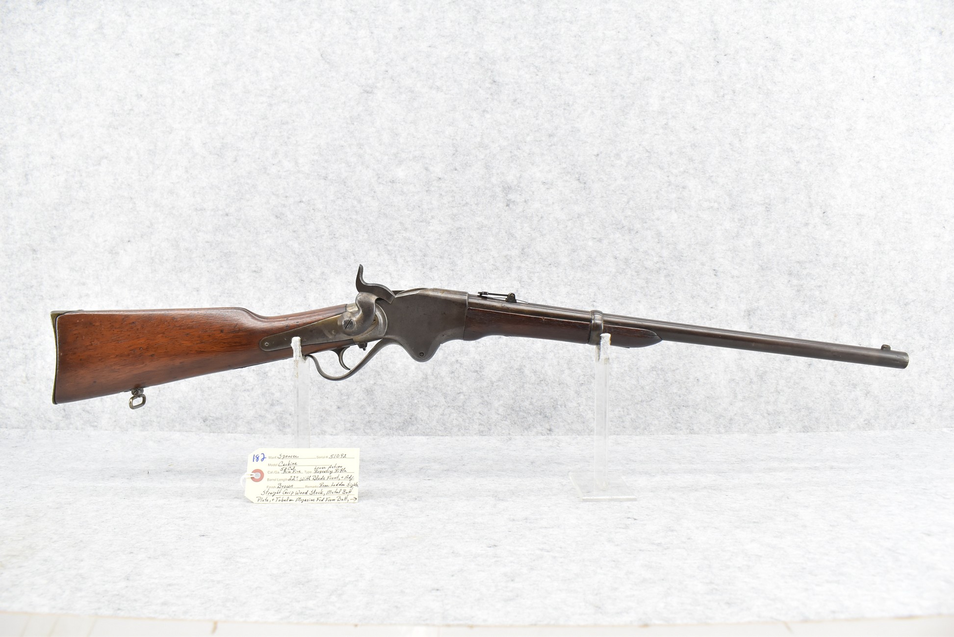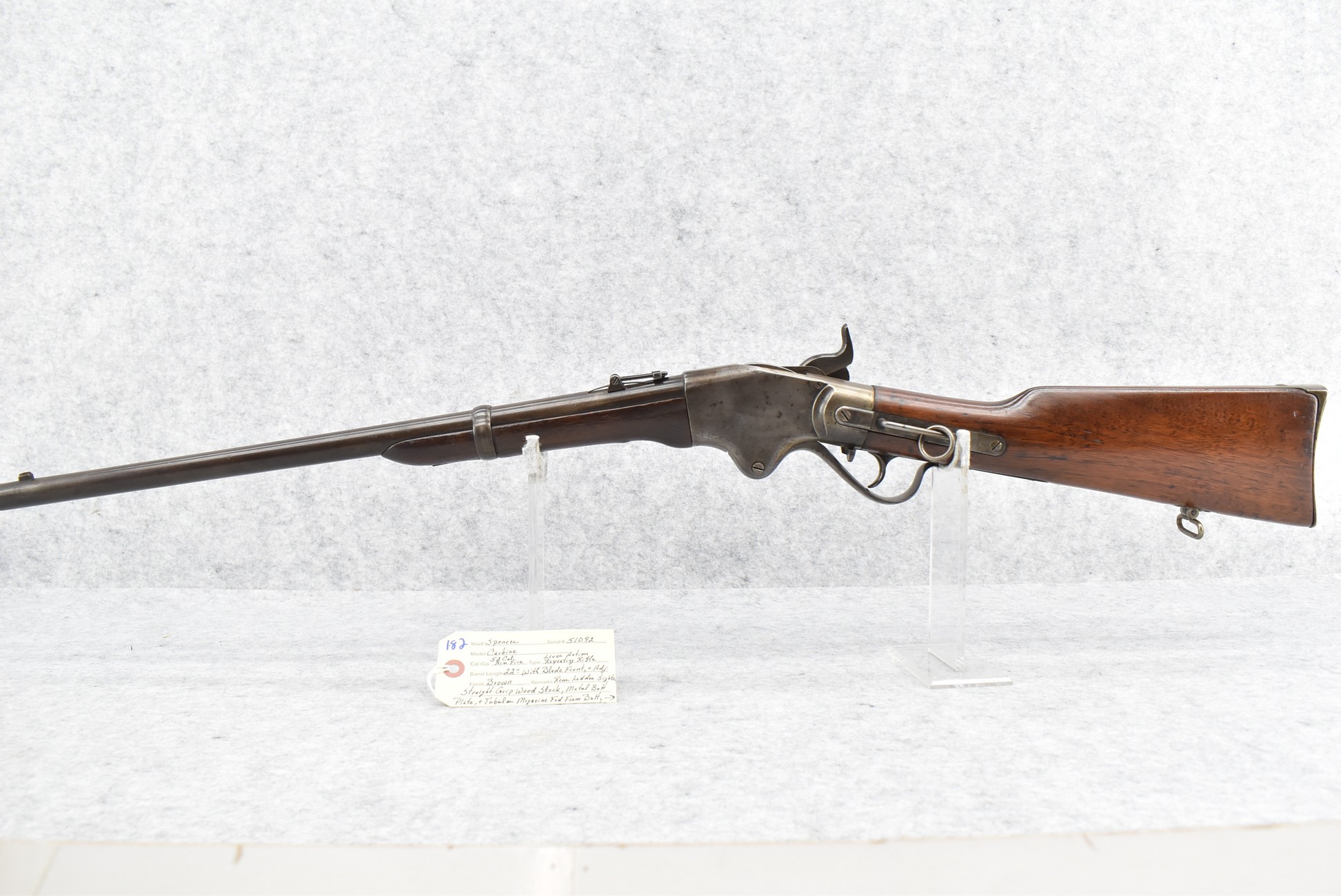 182. Spencer – Mod. Carbine – 52 Cal. RF Lever Action Repeating Rifle – w/22” Barrel w/Blade Front & Adj Rear Ladder Sights – Brown Finish – w/Straight Grip Wood Stock w/Metal Butt Plate & Tubular Magazine Fed Front Butt – w/Saddle Ring & Mounting Loop – Approx. 144,500 Rifles & Carbine Mfg.