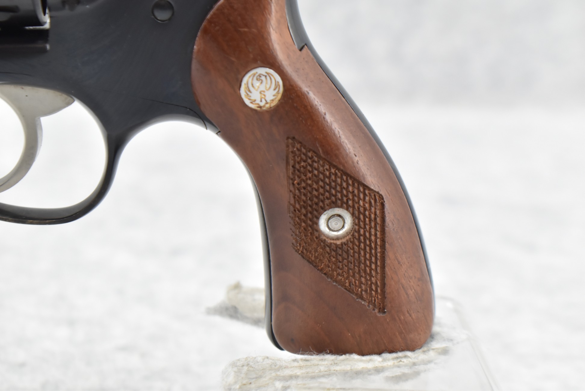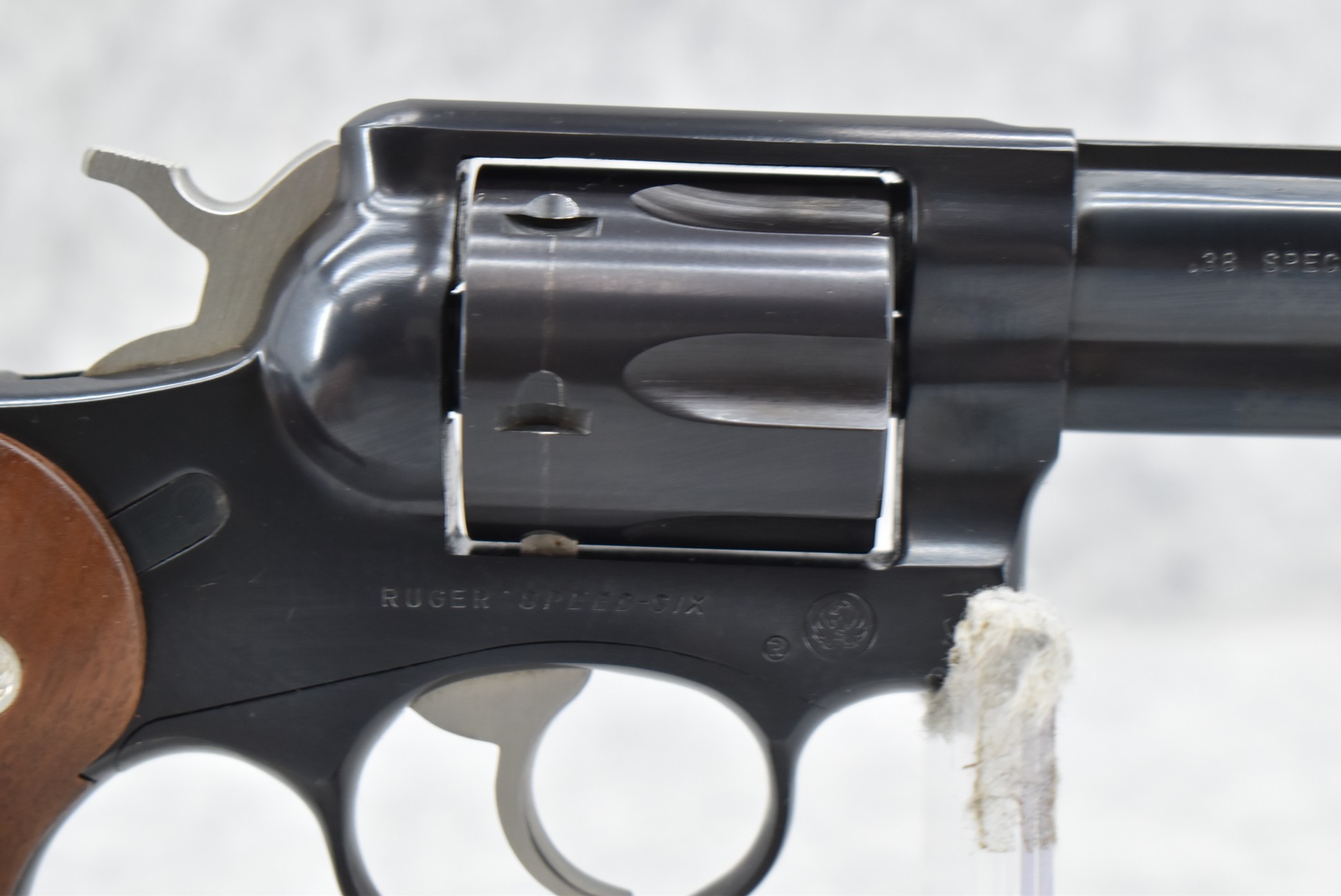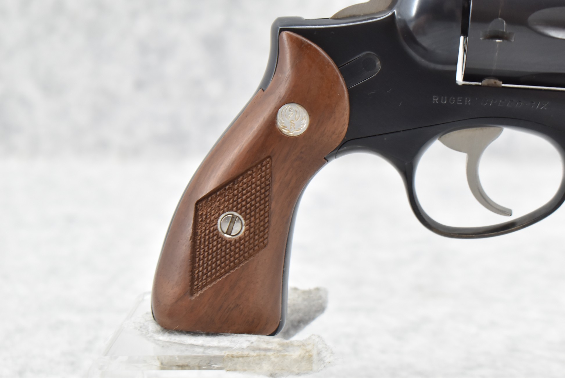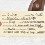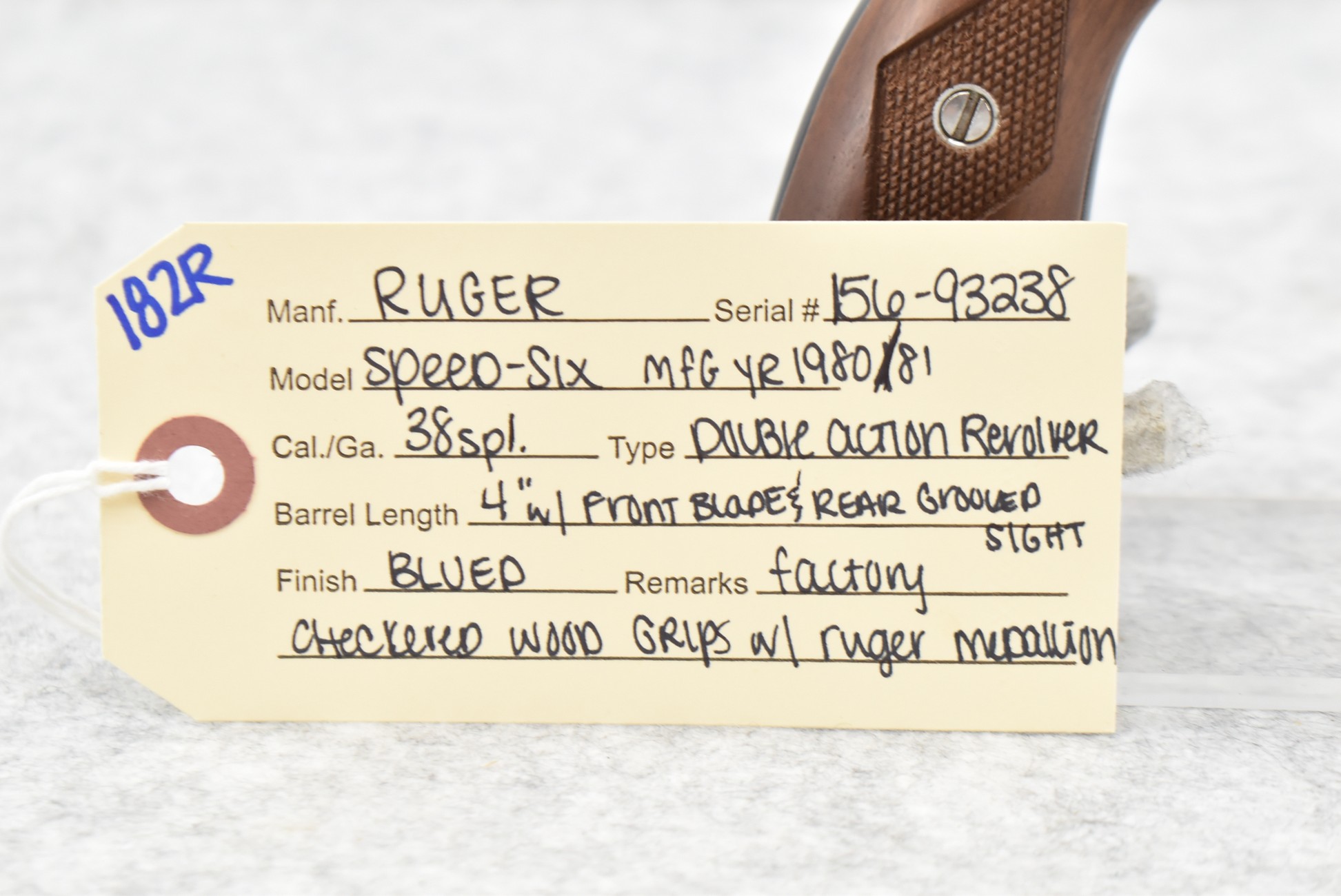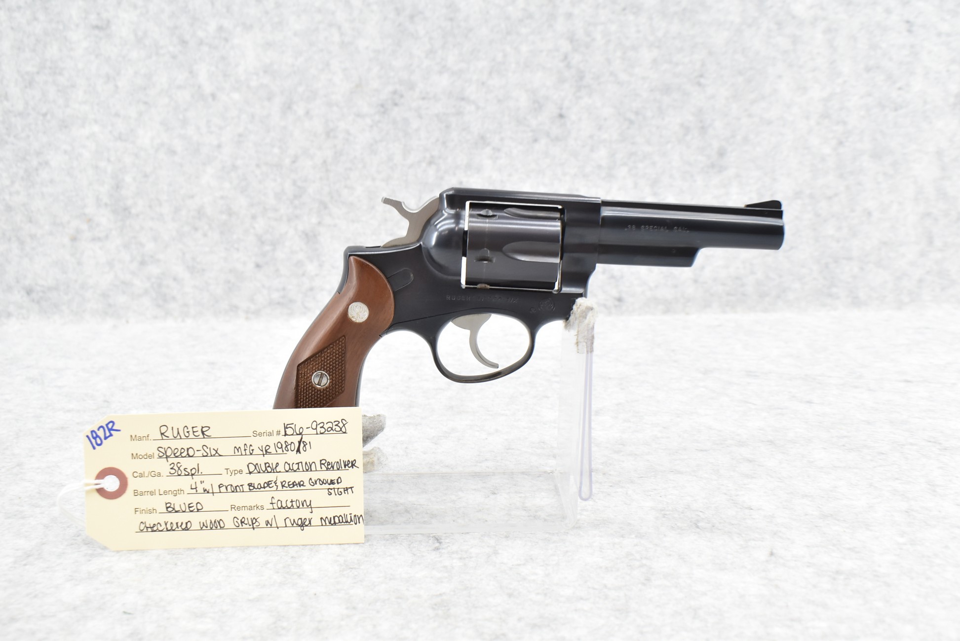 182R. Ruger – Mod. Speed Six – 38 Spl. Cal. Double Action Revolver – w/4” Barrel w/Blade Front and Rear Grooved Sights – Blued Finish – w/Factory Checkered Wood Grips w/Ruger Medallion – Manufactured 1980/81