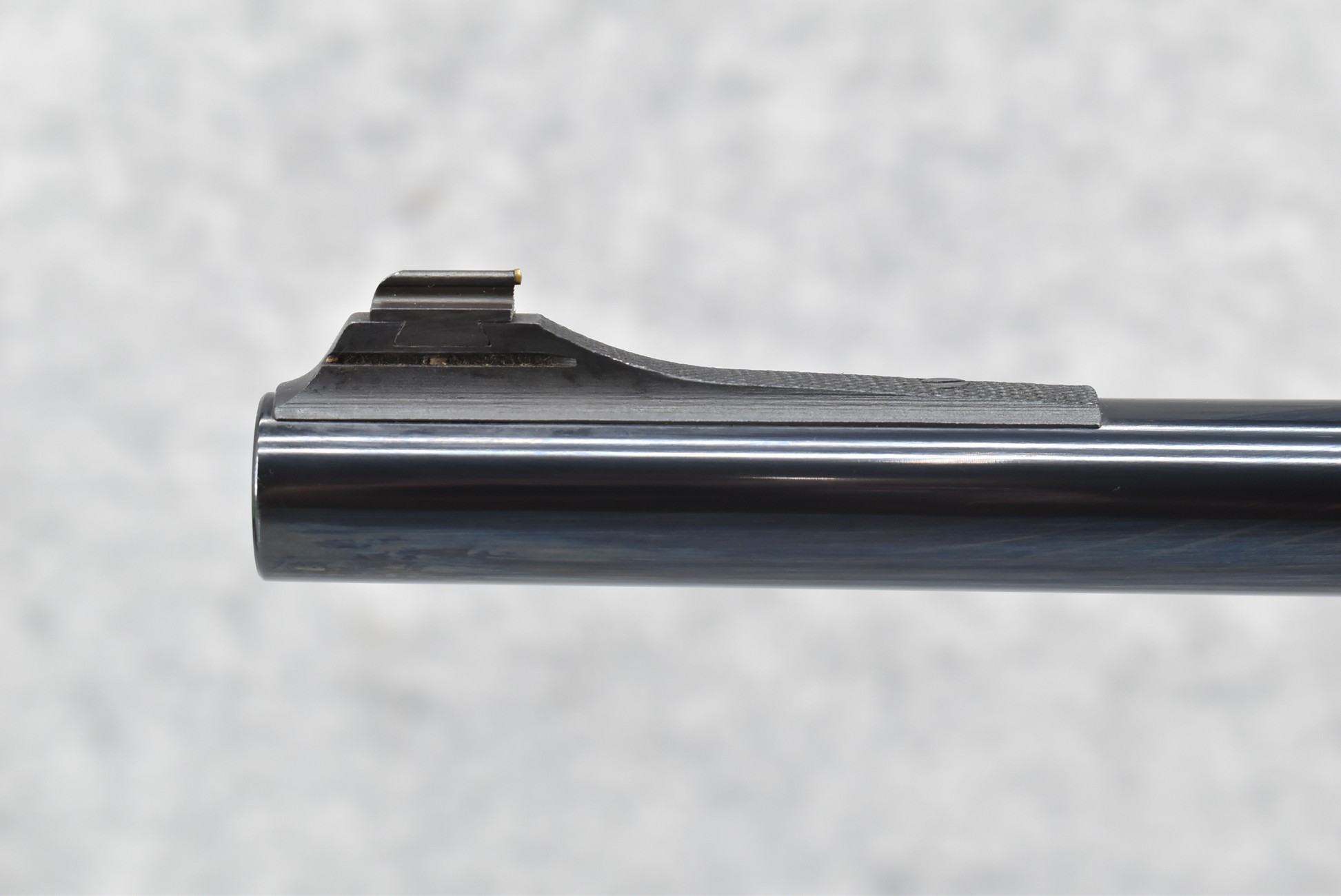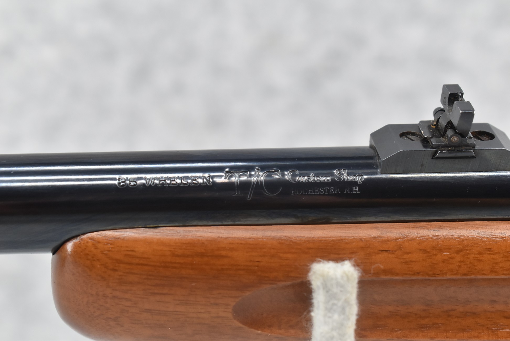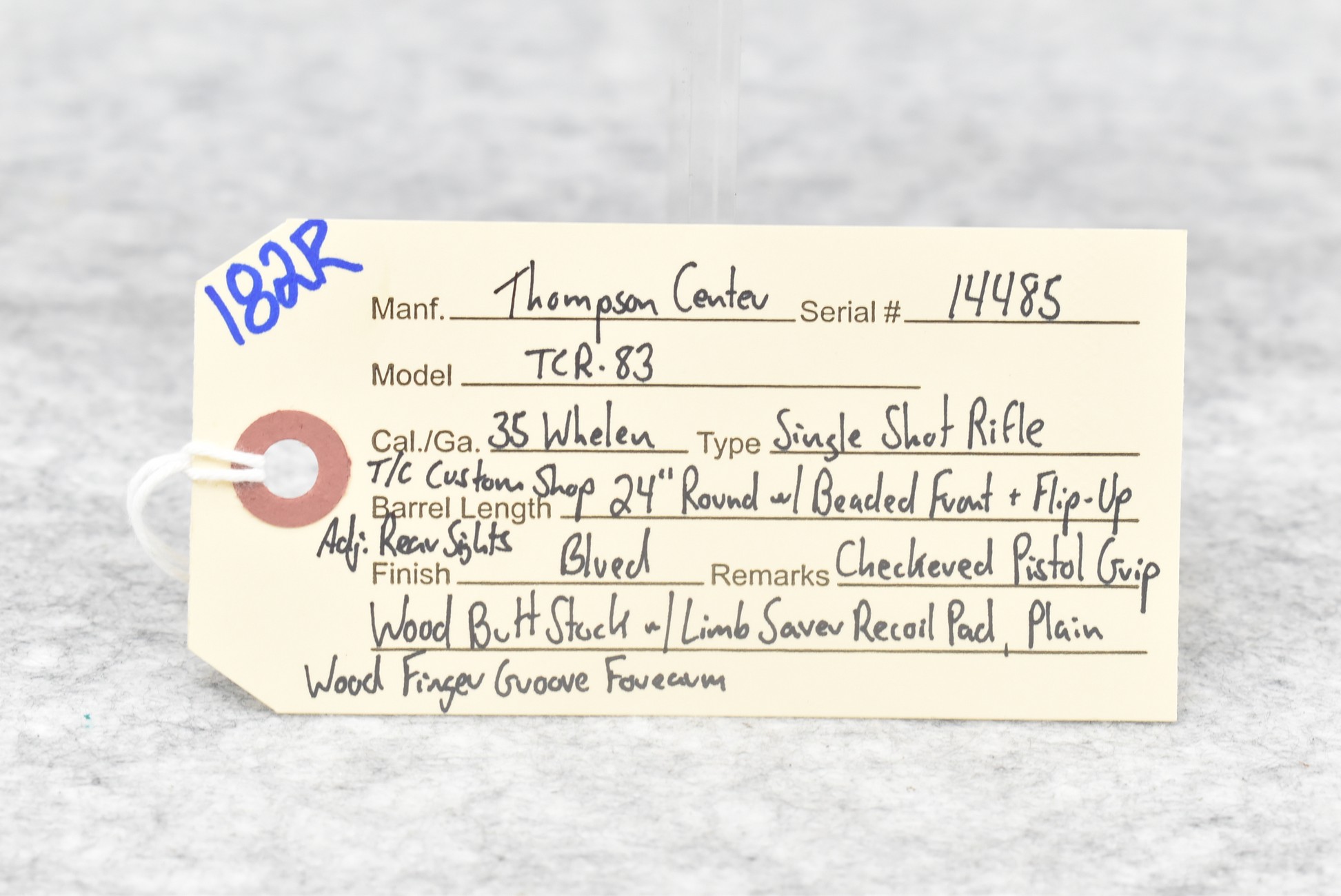182R. Thompson Center – Mod. TCR-83 – 35 Whelen Cal. Single Shot Rifle – w/24” T/C Custom Shop Round Barrel w/Beaded Front & Flip-Up Adj. Rear Sights – Blued Finish – w/Checkered Pistol Grip Wood Butt Stock w/Plain Wood Finger Groove Forearm & Limb Saver Recoil Pad