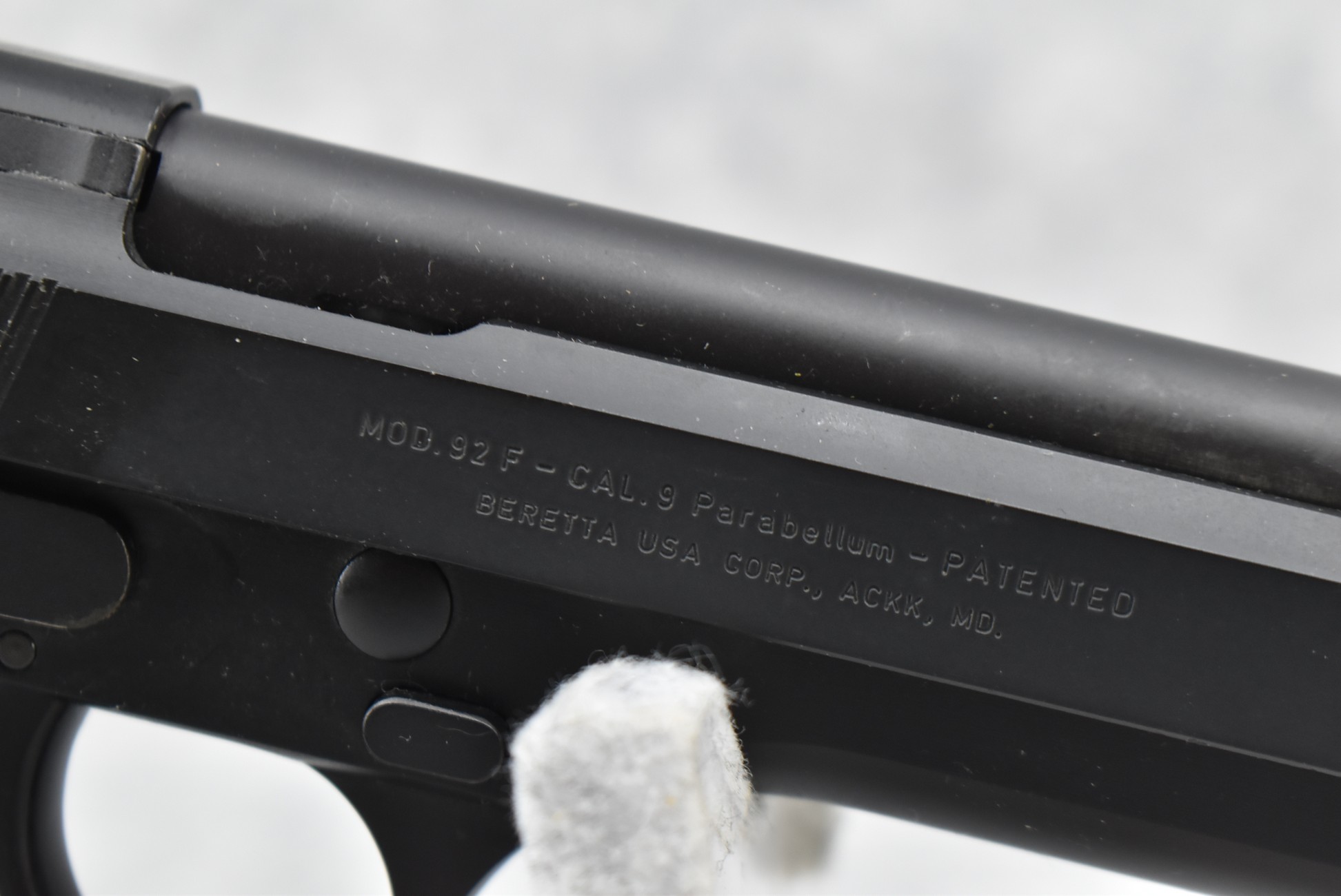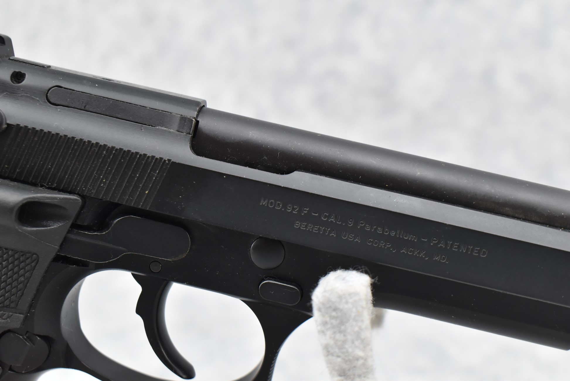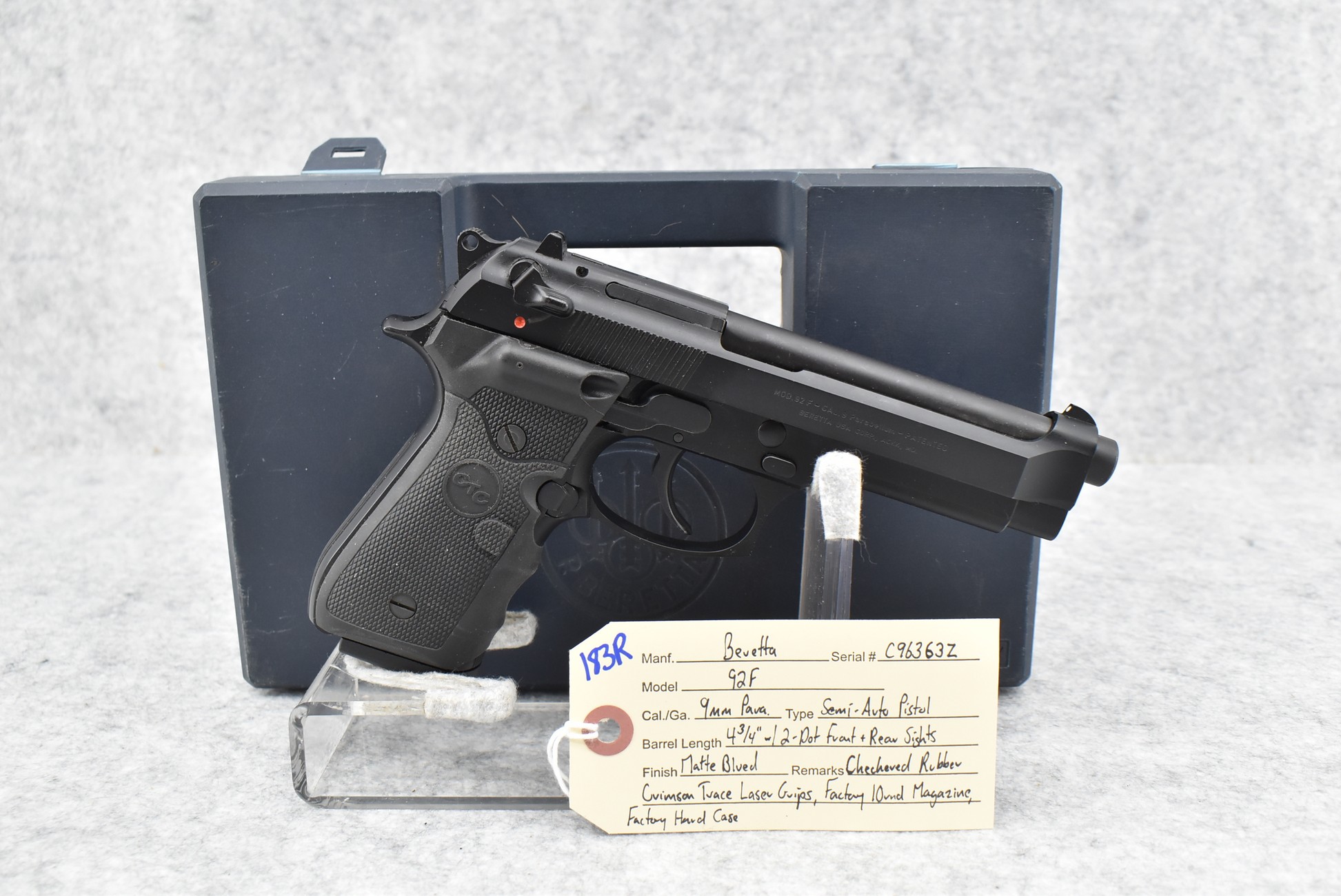 183R. Beretta – Mod. 92F – 9mm Para Cal. Semi-Auto Pistol – w/4 ¾” Barel w/2-Dot Front & Rear Sights – Matte Blued Finish – w/Checkered Rubber Crimson Trace Laser Grips – w/Factory 10Rd Magazine – w/Factory Hard Case