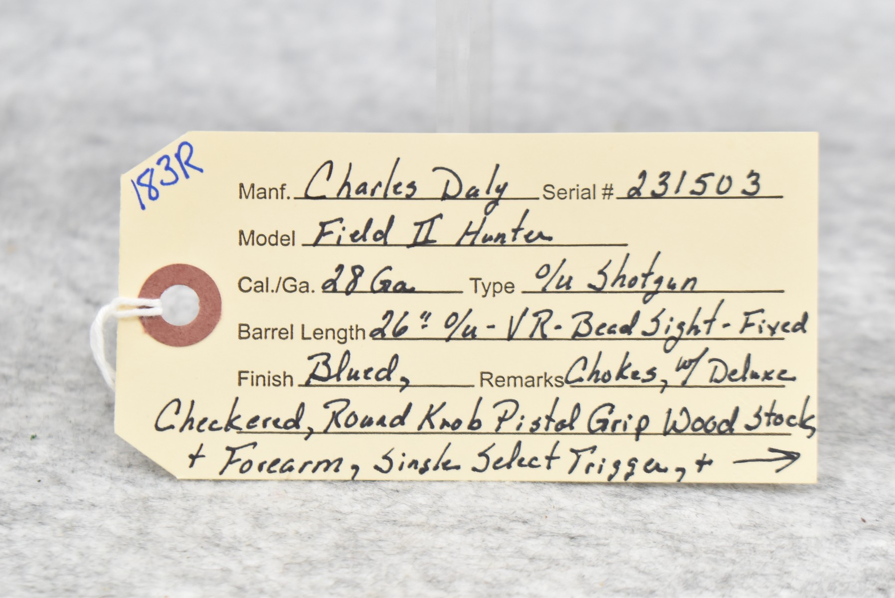 183R. Charles Daly – Mod. Field II Hunter – 28ga. Over-Under Shotgun – w/26 Vent-Rib Barrel w/Bead Sight & Fixed Choke – Blued Finish – w/Deluxe Checkered Round Knob Pistol Grip Wood Stocks w/Factory Butt Plate – w/Single Select Trigger