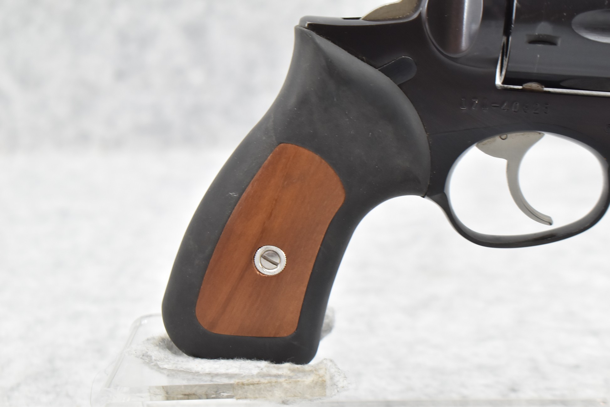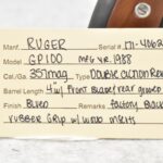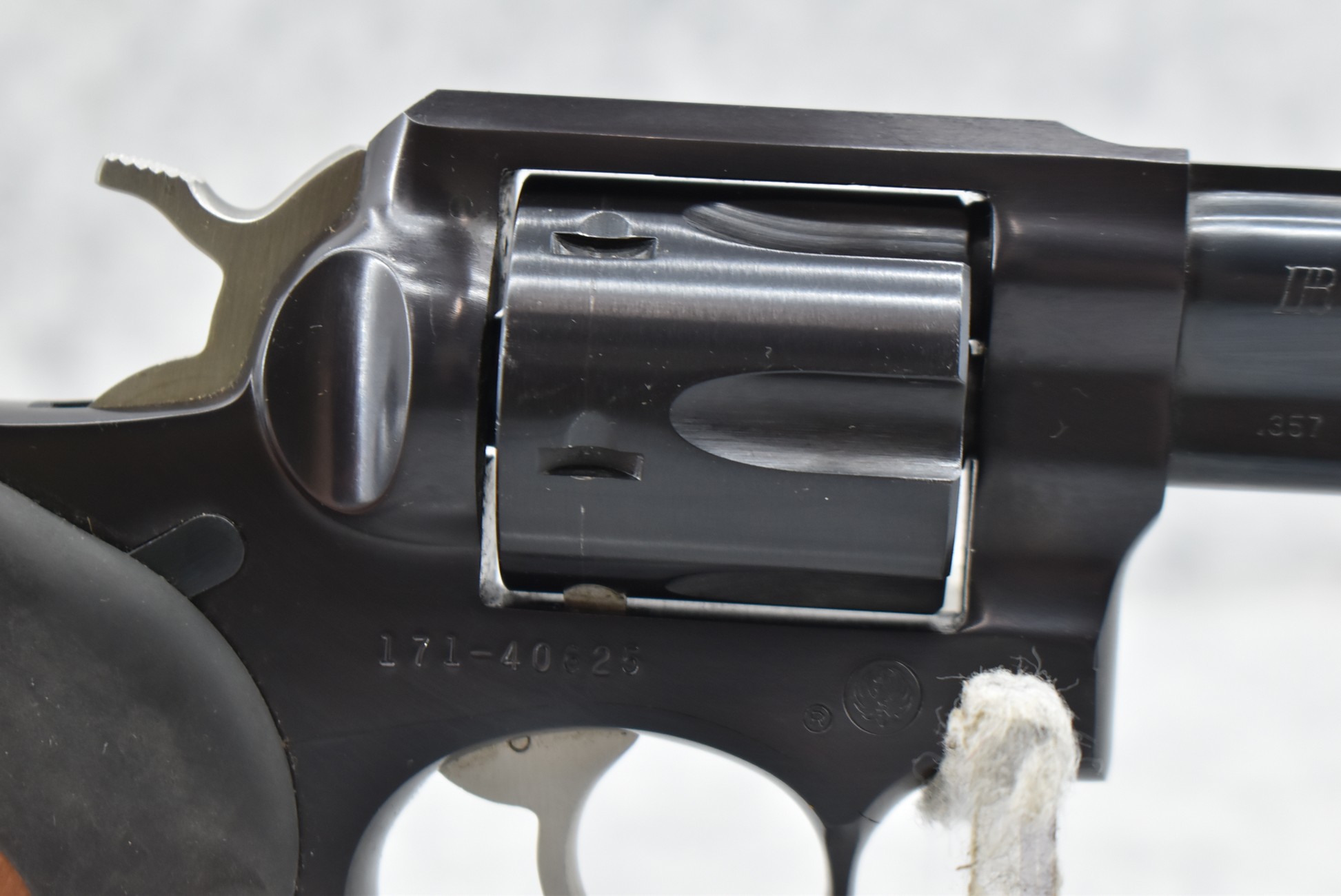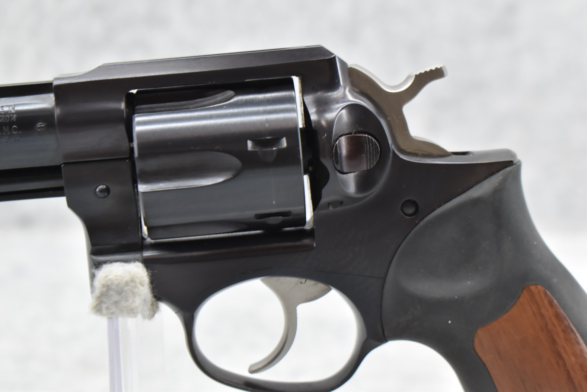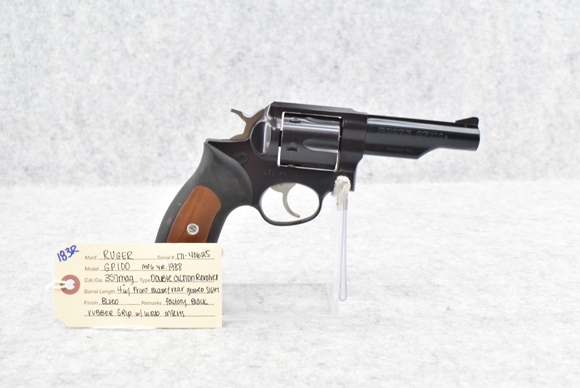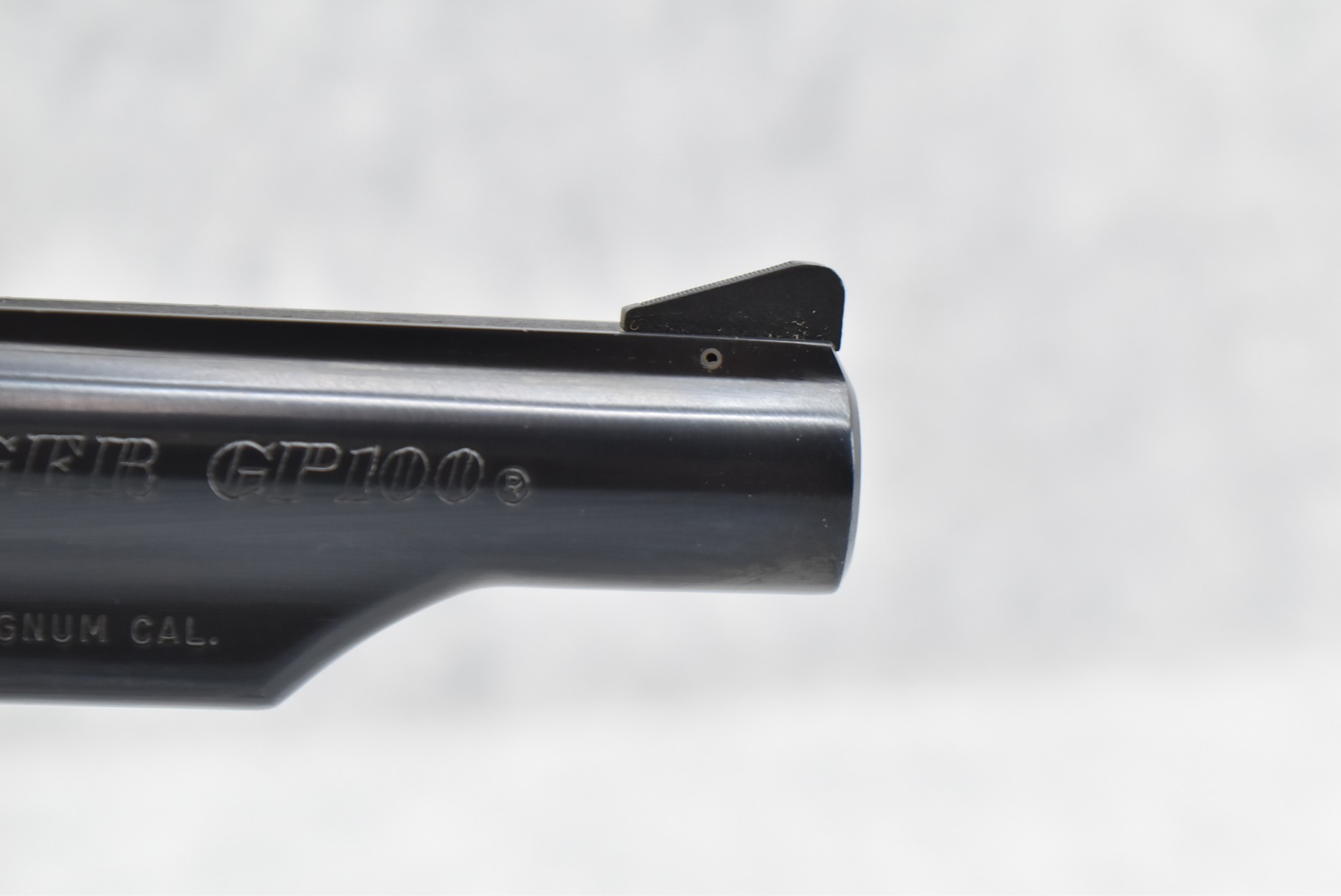 183R. Ruger – Mod. GP100 – 357 Mag. Cal. Double Action Revolver – w/4” Barrel w/Blade Front and Rear Grooved Sights – Blued Finish – w/Factory Black Rubber Grip w/Wood Inserts – Manufactured 1988