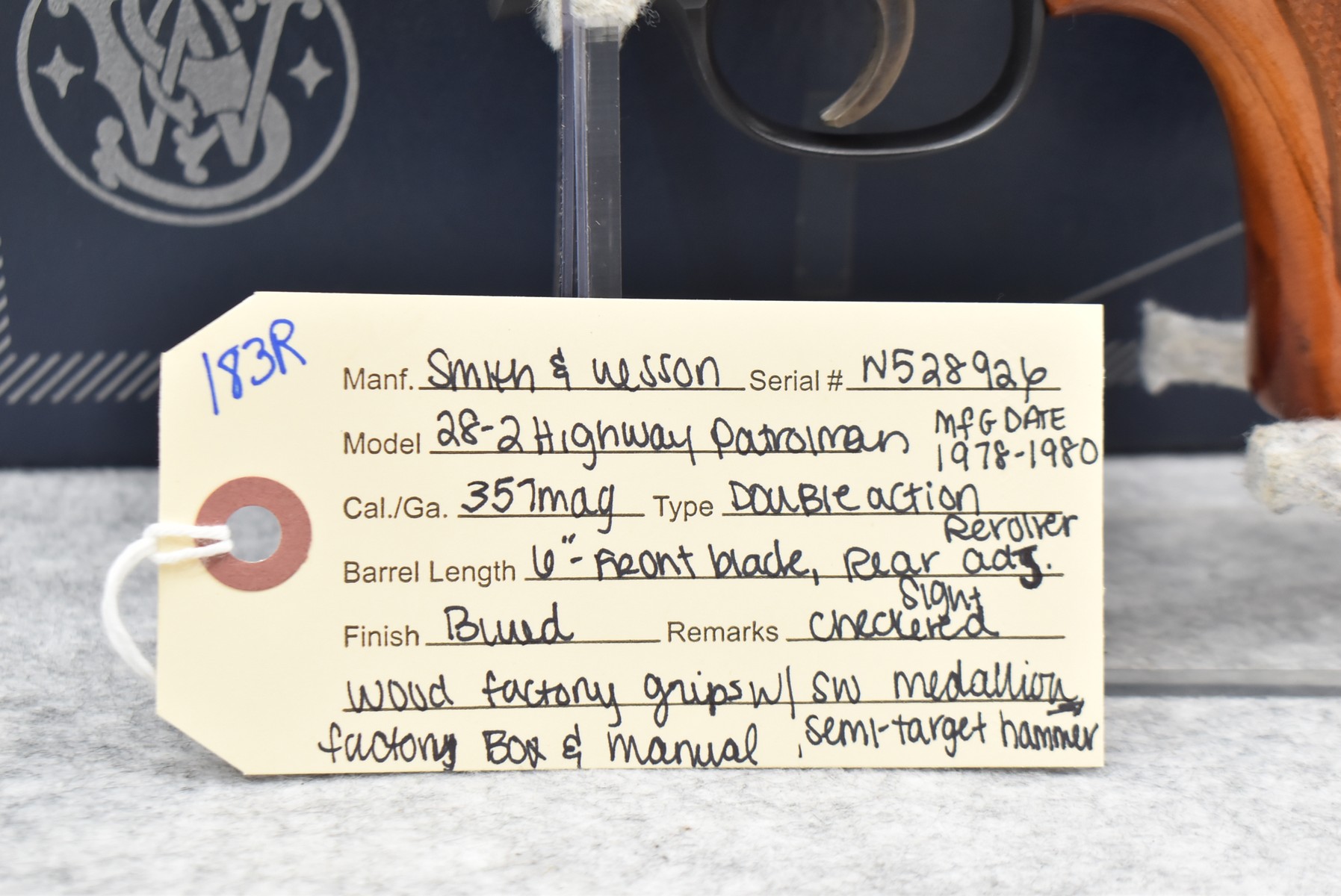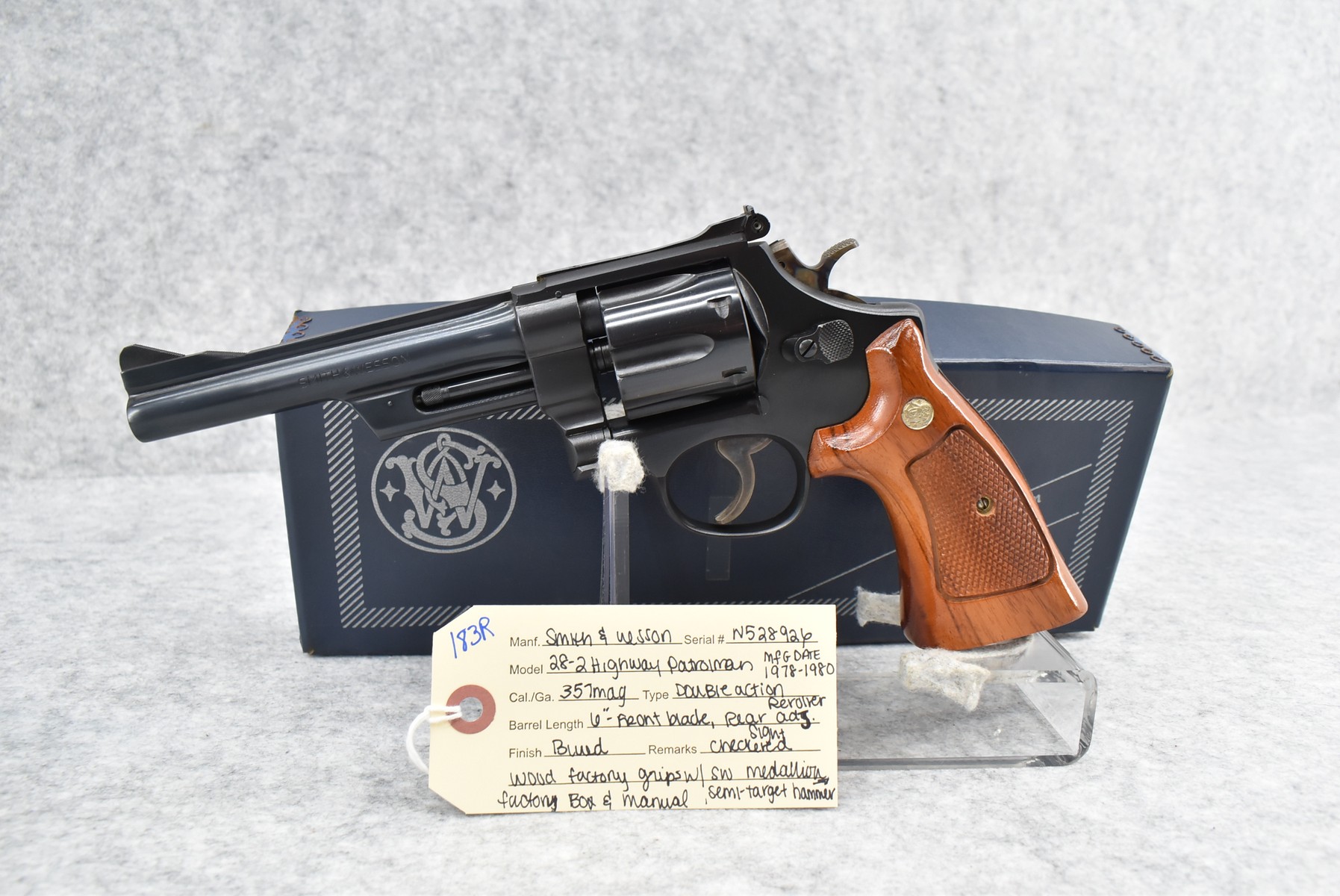 183R. Smith & Wesson – Mod. 28-2 Highway Patrolman – 357 Mag. Cal. Double Action Revolver – w/6” Barrel w/Front Blade & Rear Adj. Sights – Blued Finish – w/Checkered Wood Factory Grips w/S&W Medallion – w/Factory Box & Manual – Mfg. Between 1978-1980