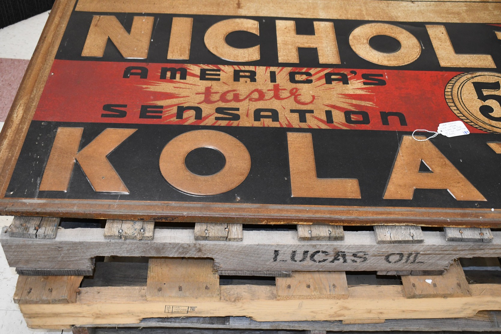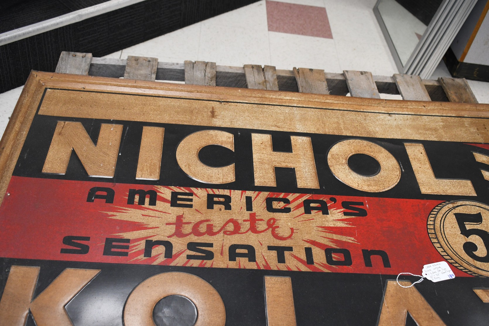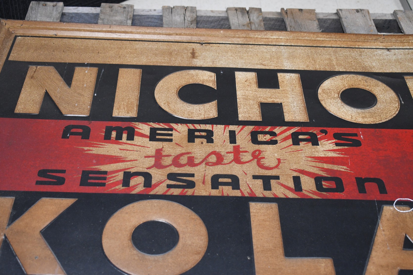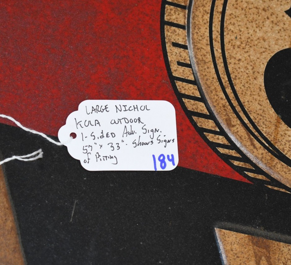 184. Large Nichol Kola America’s Taste Sensation Tin Sign – Measures 57” x 33” – Sign Shows Evidence of Surface Pitting – Will Not Ship, Pickup Only or You Must Arrange Your Own Shipping!