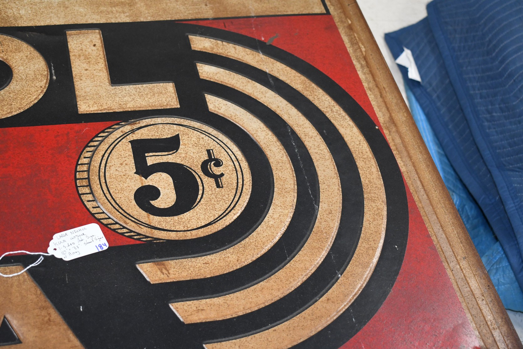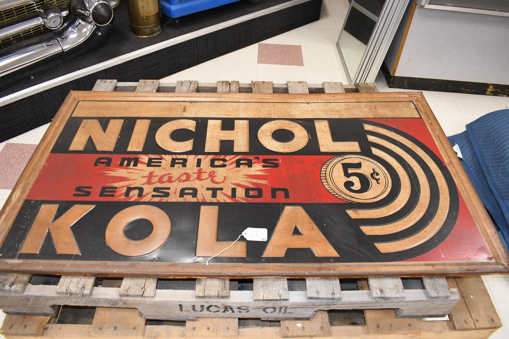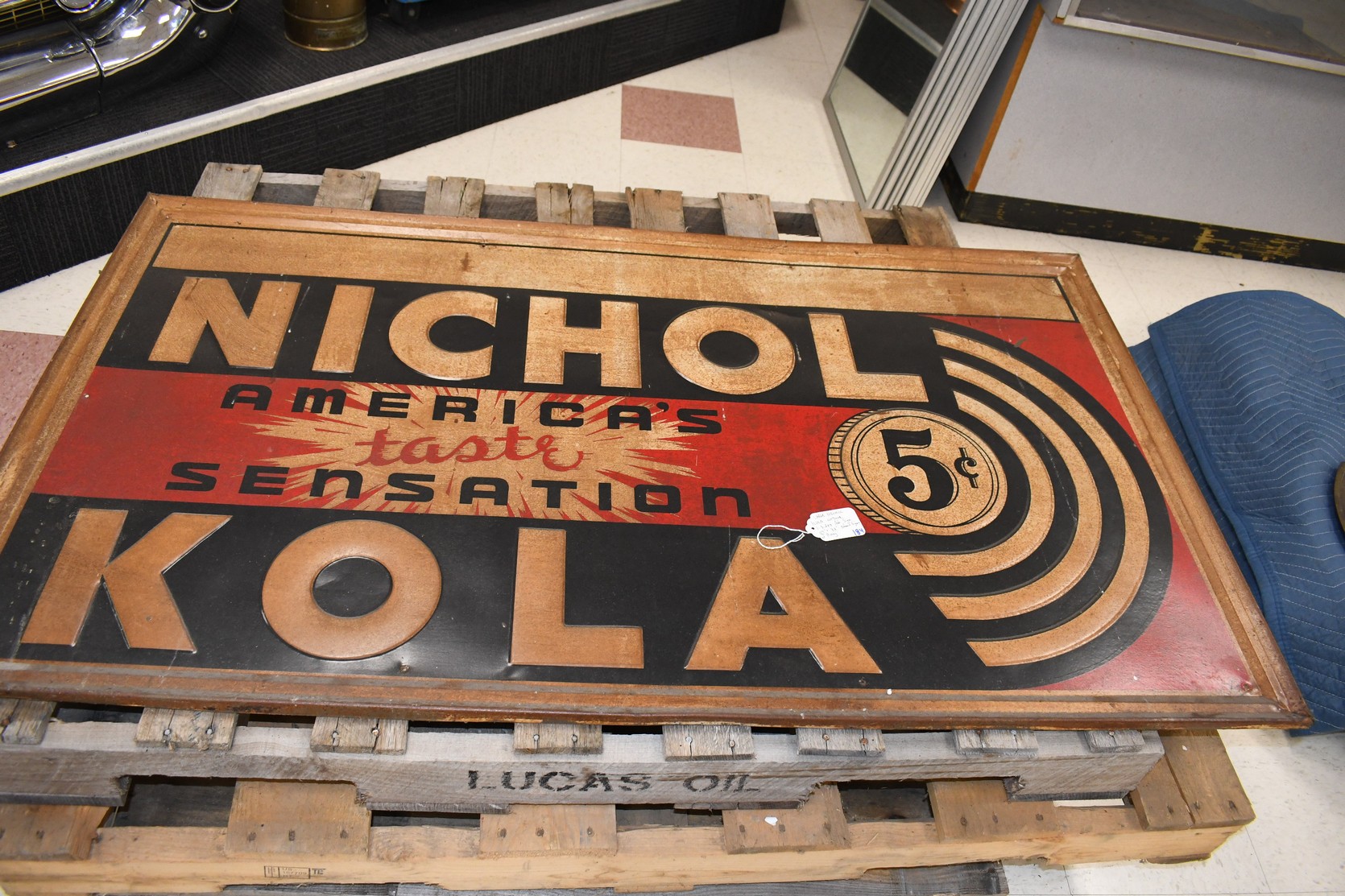 184. Large Nichol Kola America’s Taste Sensation Tin Sign – Measures 57” x 33” – Sign Shows Evidence of Surface Pitting – Will Not Ship, Pickup Only or You Must Arrange Your Own Shipping!