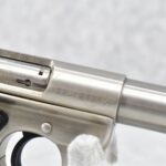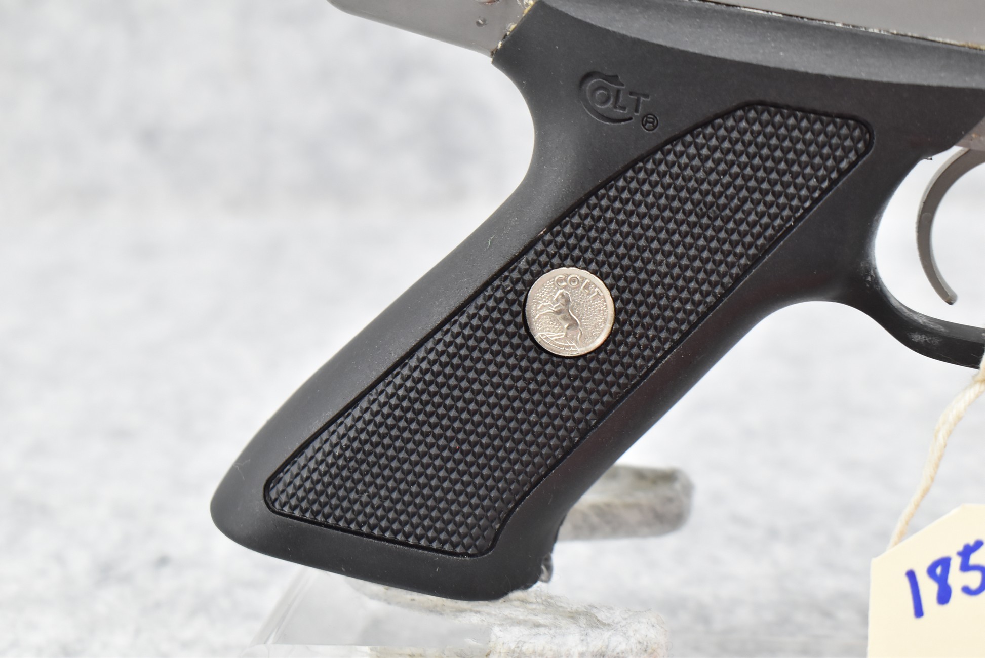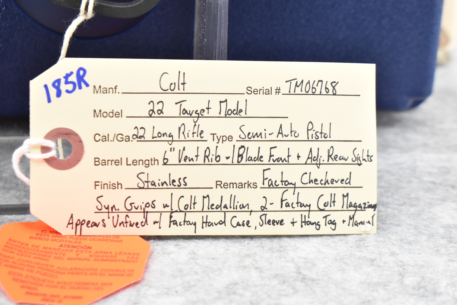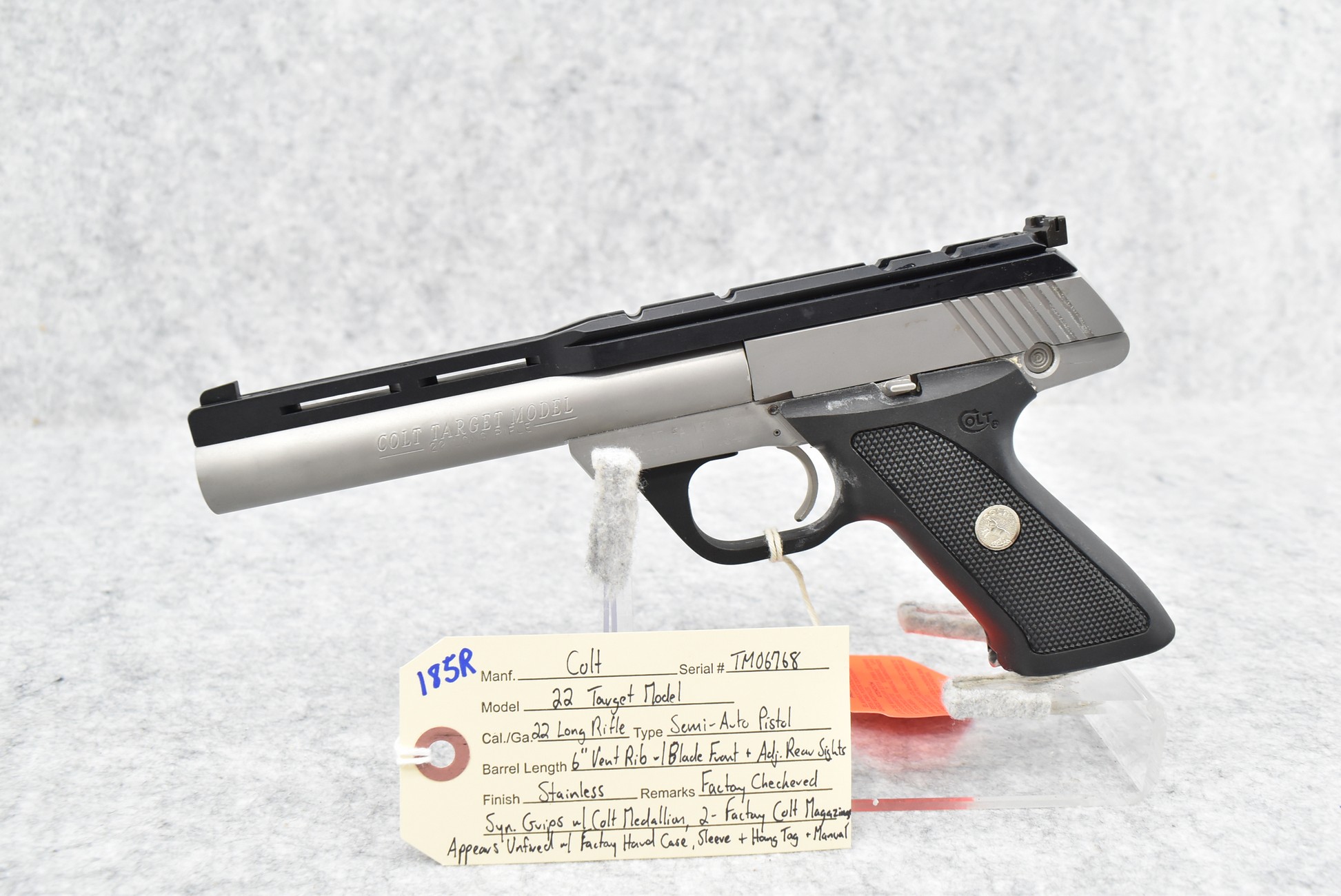 185R. Colt – Mod. 22 Target Model – 22 Long Rifle Cal. Semi-Auto Pistol – w/6” Vent-Rib Barrel w/Blade Front & Adj. Rear Sights – Stainless Finish – w/Factory Checkered Synthetic Grips w/Colt Medallion – w/2 Factory Colt Magazines – Appears Unfired w/Factory Hard Case, Sleeve, Hang Tag & Manual