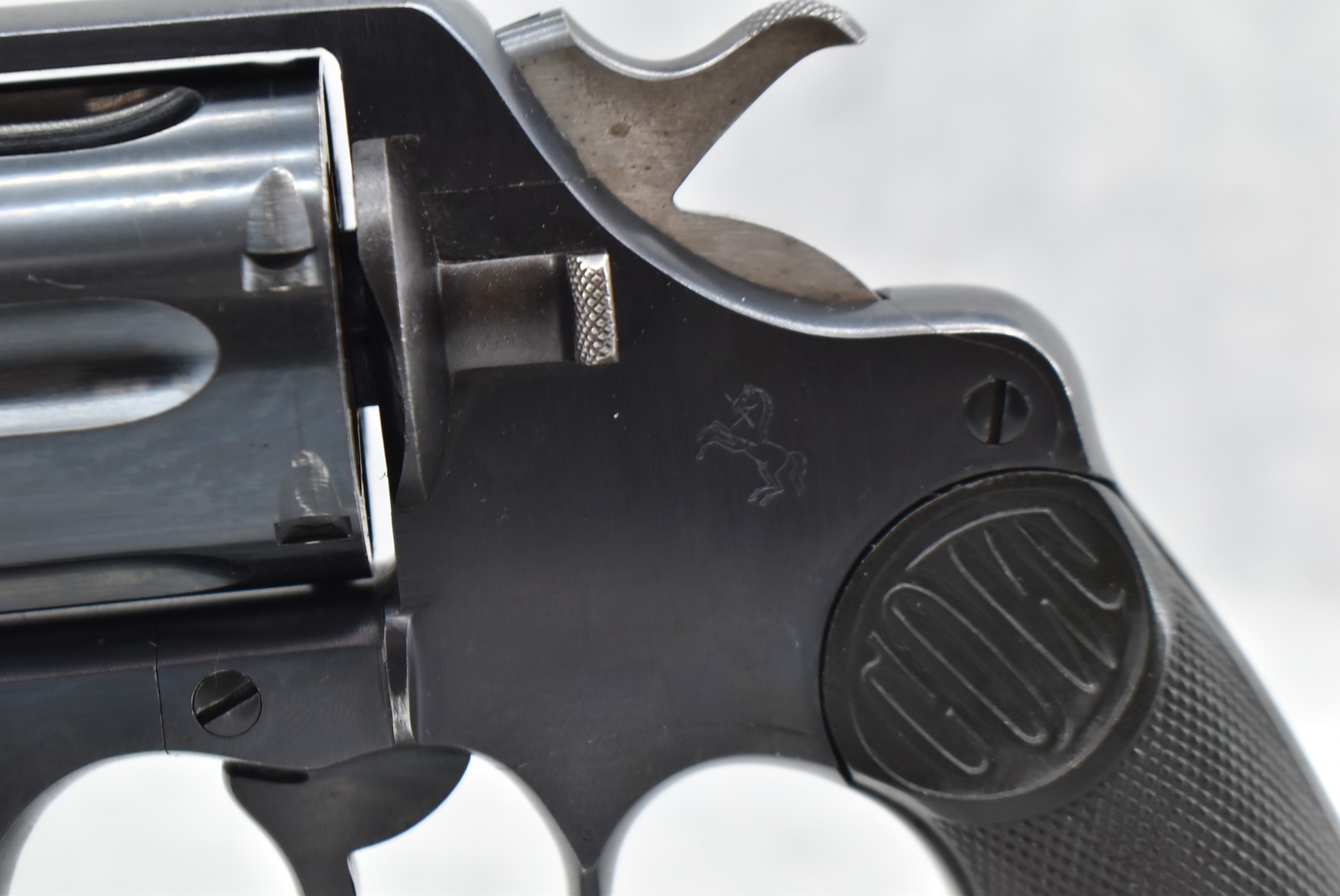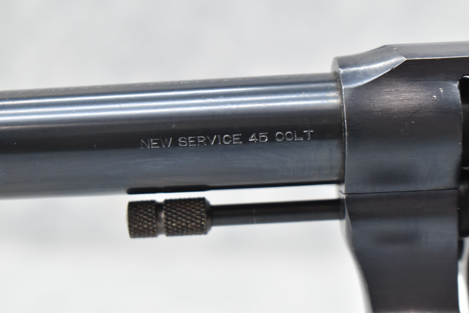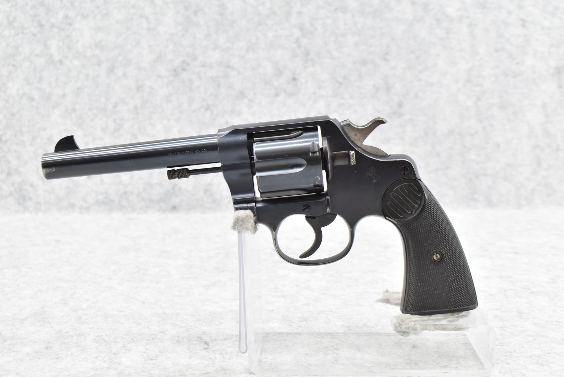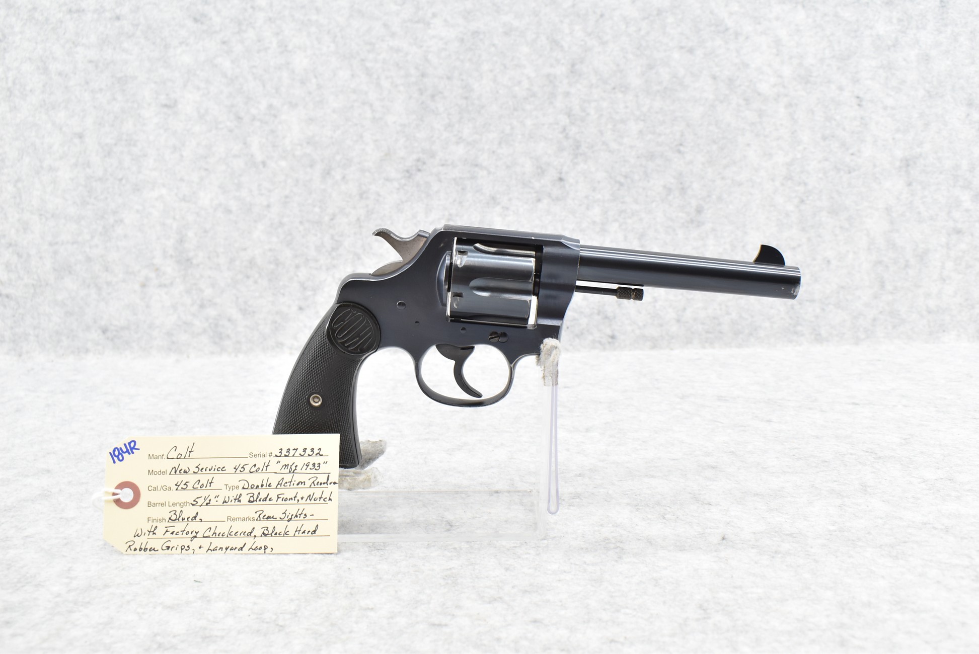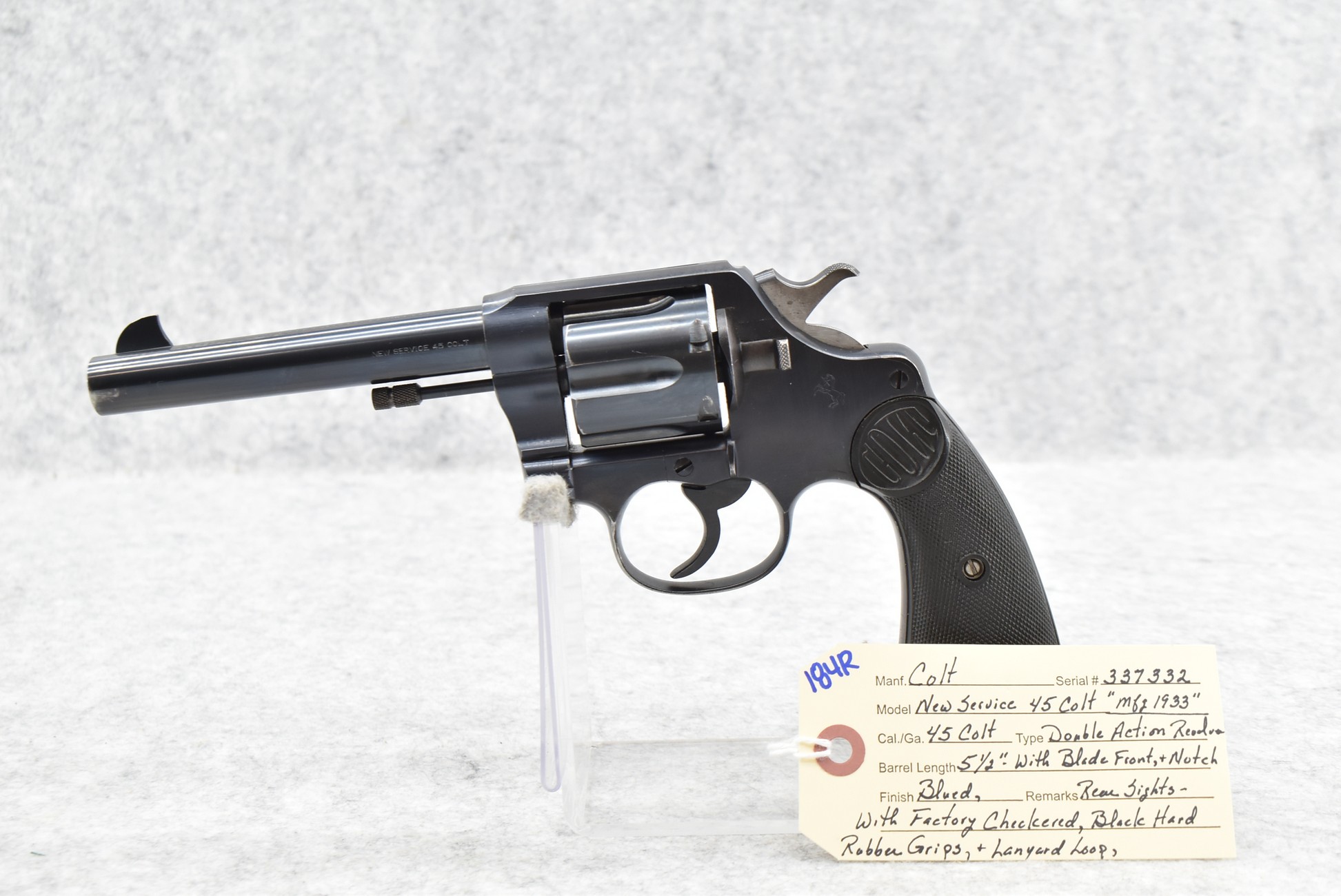 184R. Colt – Mod. New Service – 45 Colt Cal. Double Action Revolver – w/5½” Barrel w/Blade Front and Rear Notch Sights – Blued Finish – w/Factory Checkered Black Hard Rubber Grips w/Lanyard Loop – Manufactured 1933