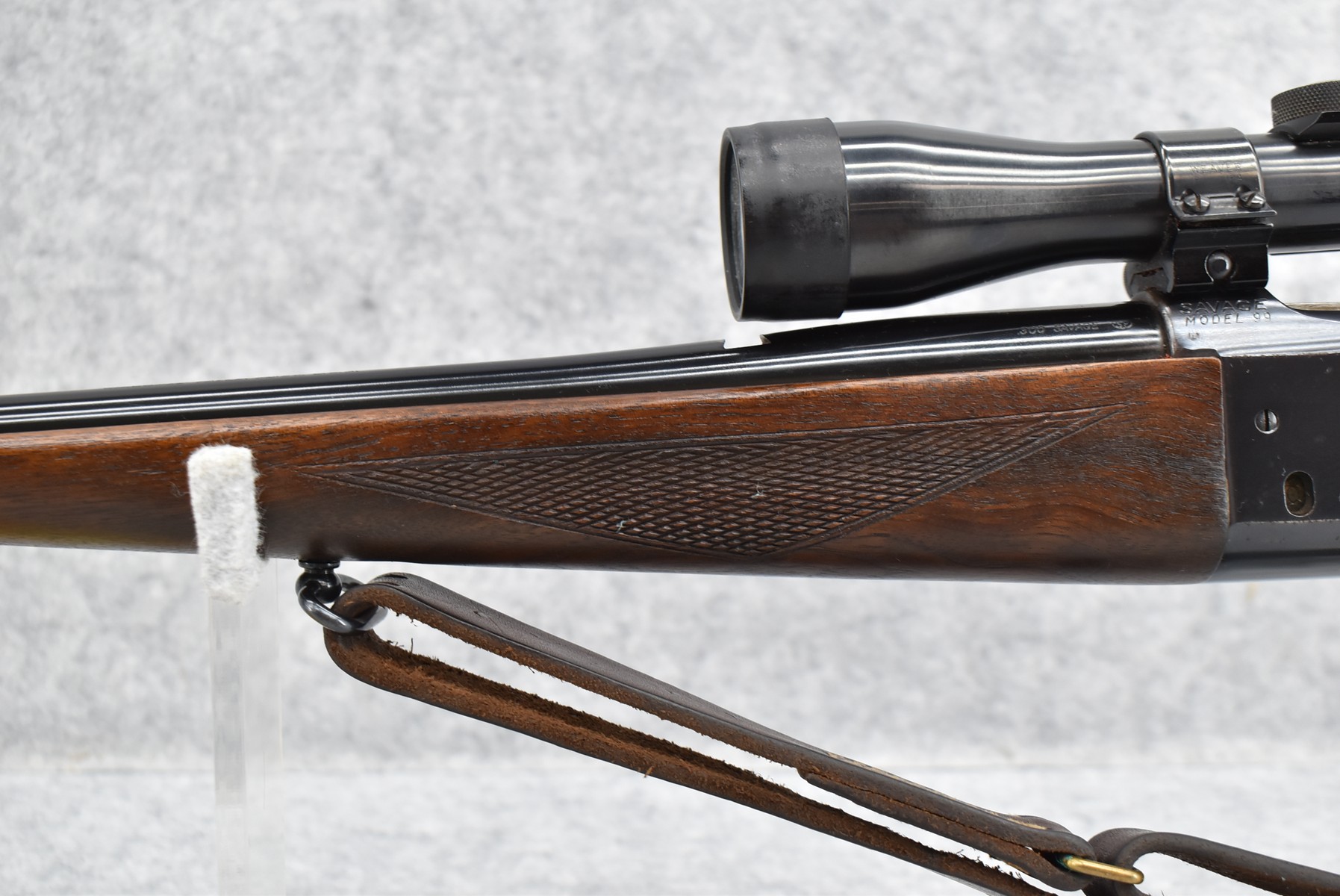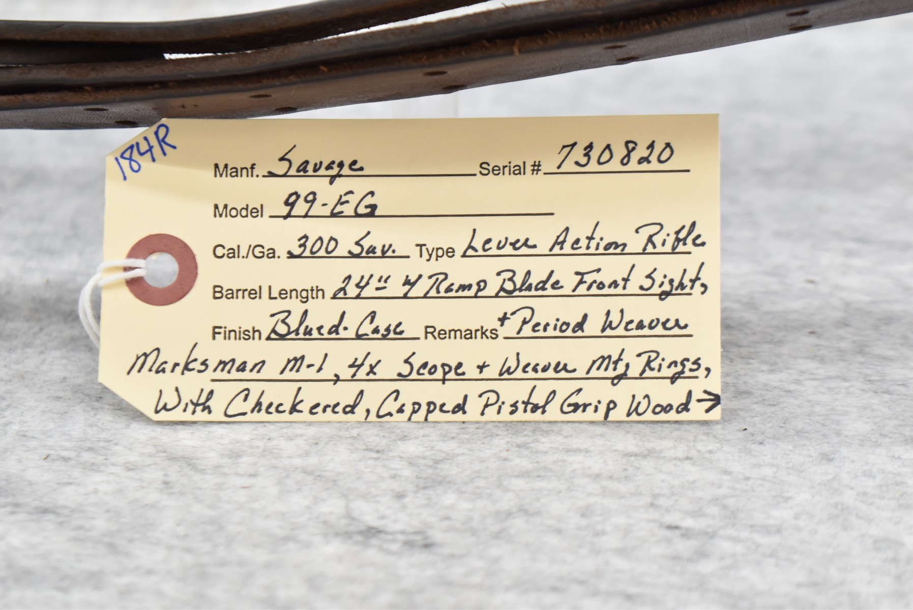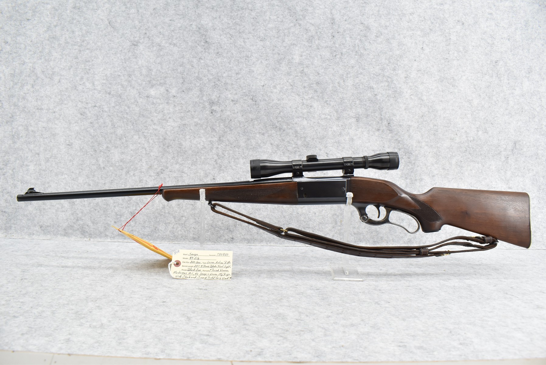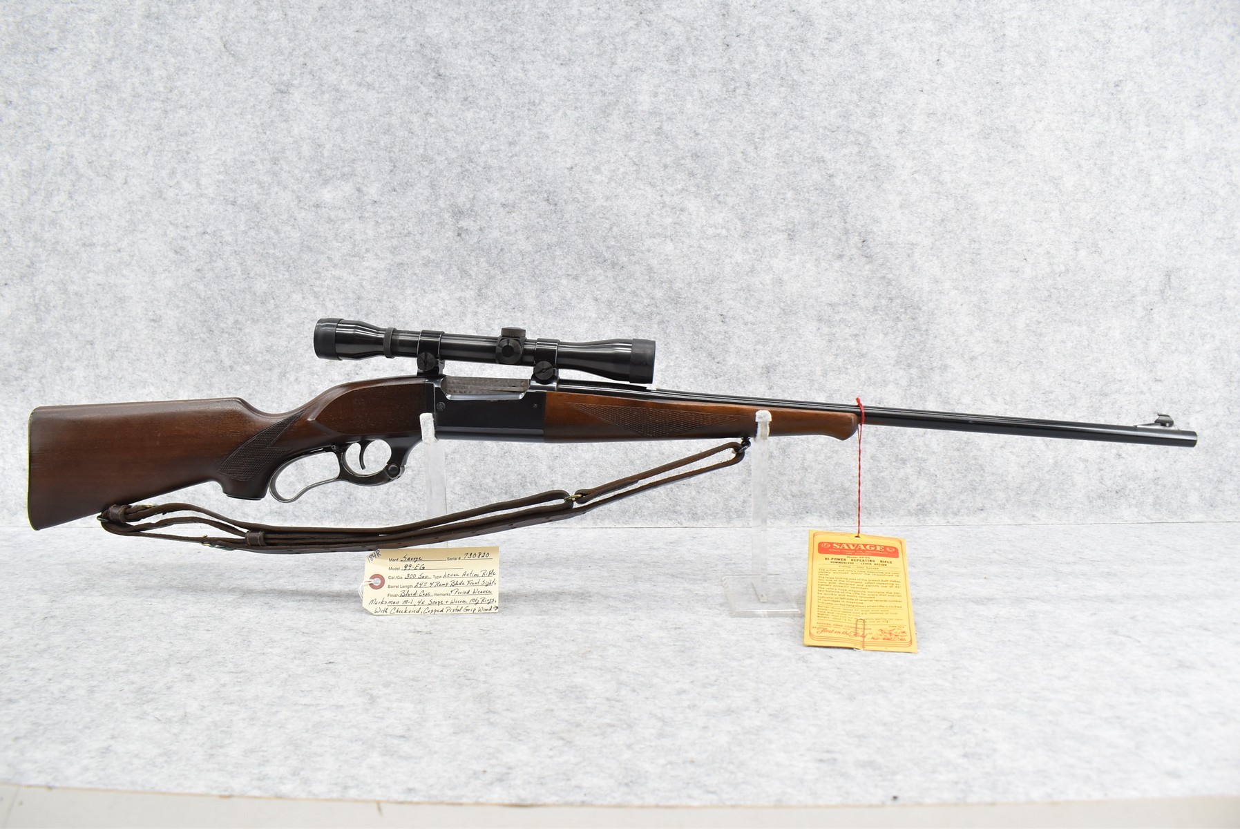184R.     Savage – Mod. 99-EG – 300 Sav. Cal. Lever Action Rifle – w/24” Barrel w/Ramp Blade Front Sight – Blued Finish w//Case Hardened Lever – w/Checkered Capped Pistol Grip Wood Stocks w/Factory Metal Butt Plate – w/Military Style Leather Sling – w/Period Weaver Marksman M-1 4x Scope & Weaver Mounting Rings – w/Factory Hang Tag Envelope, Manual & Rear Sights