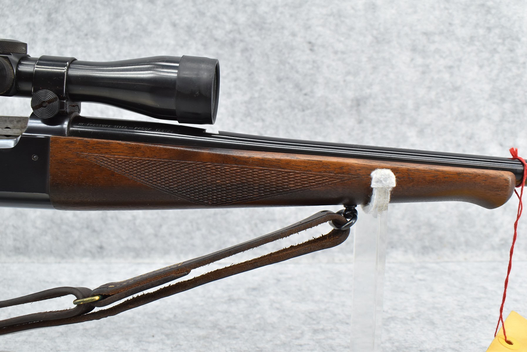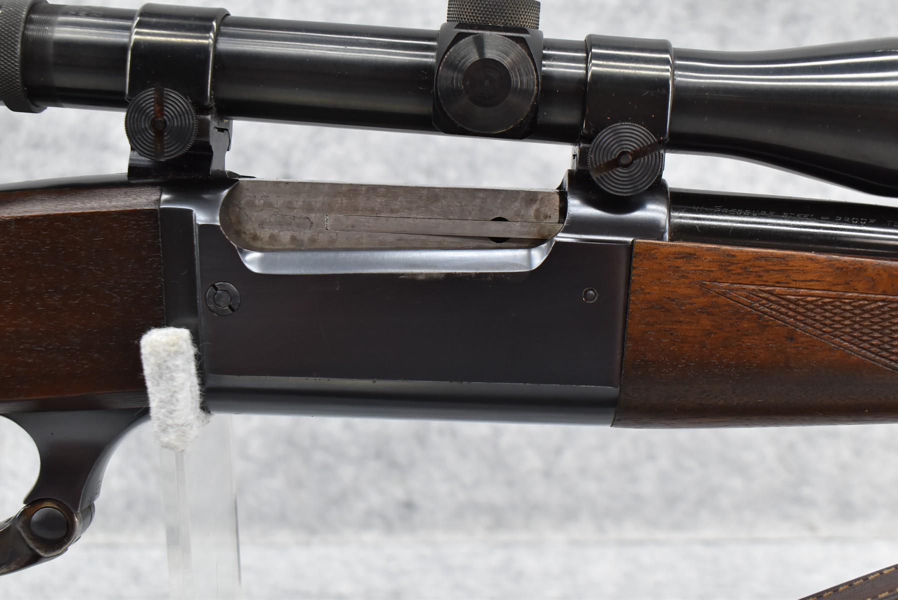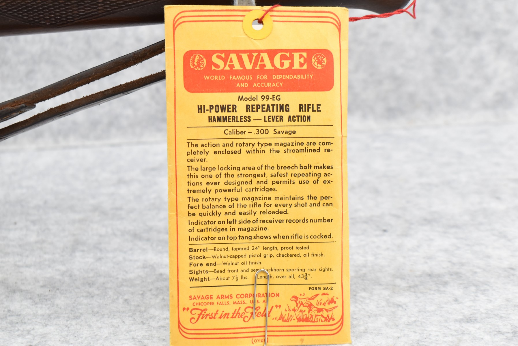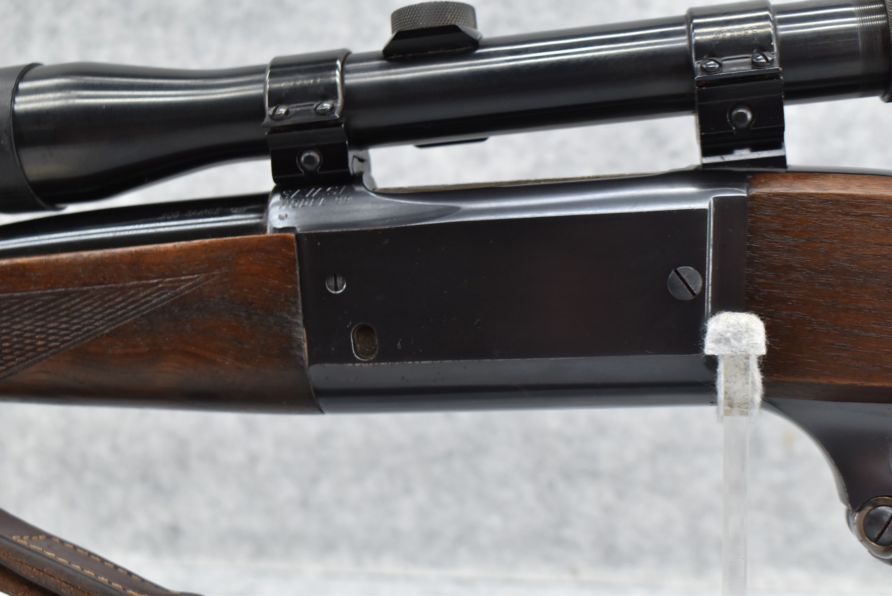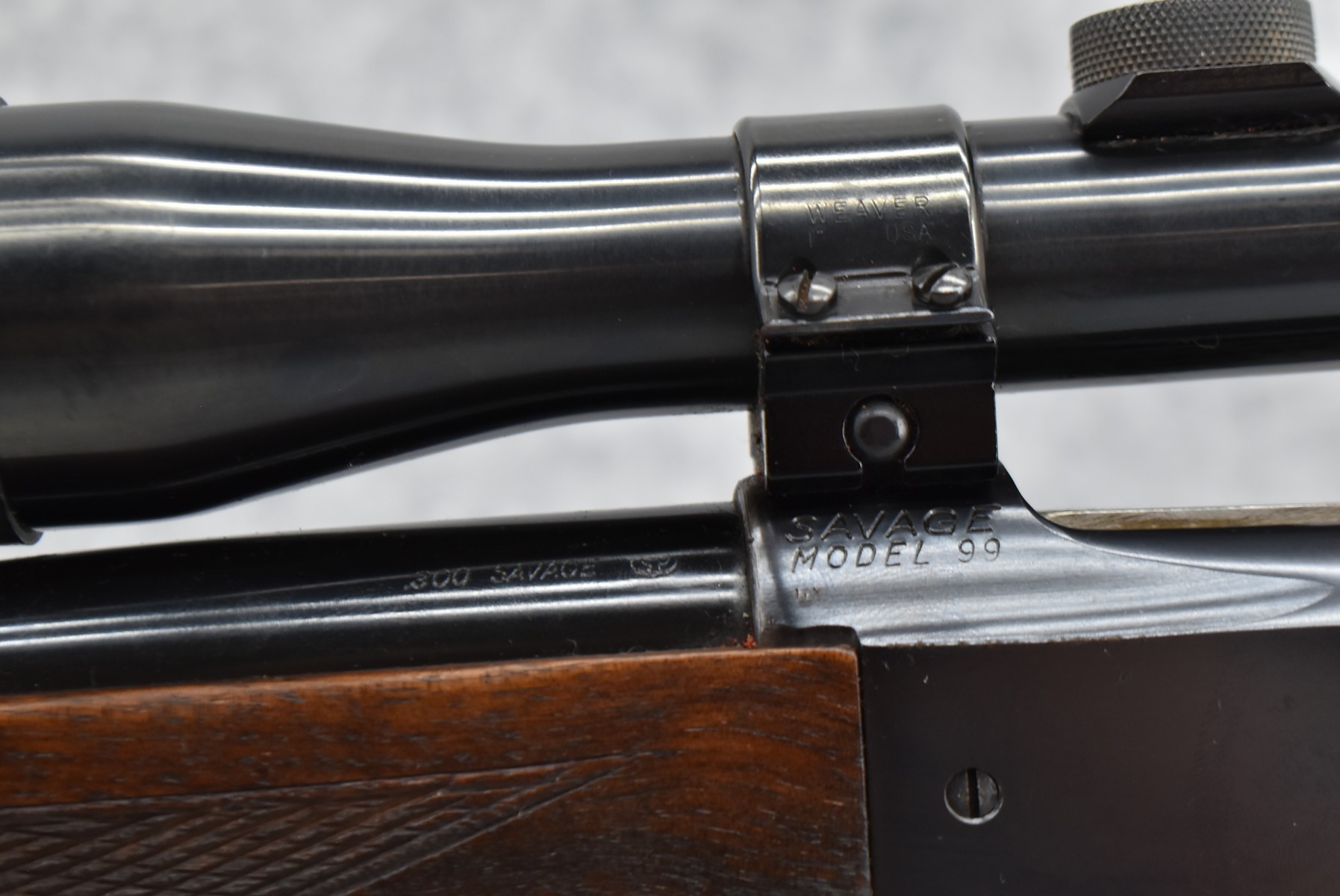 184R.     Savage – Mod. 99-EG – 300 Sav. Cal. Lever Action Rifle – w/24” Barrel w/Ramp Blade Front Sight – Blued Finish w//Case Hardened Lever – w/Checkered Capped Pistol Grip Wood Stocks w/Factory Metal Butt Plate – w/Military Style Leather Sling – w/Period Weaver Marksman M-1 4x Scope & Weaver Mounting Rings – w/Factory Hang Tag Envelope, Manual & Rear Sights