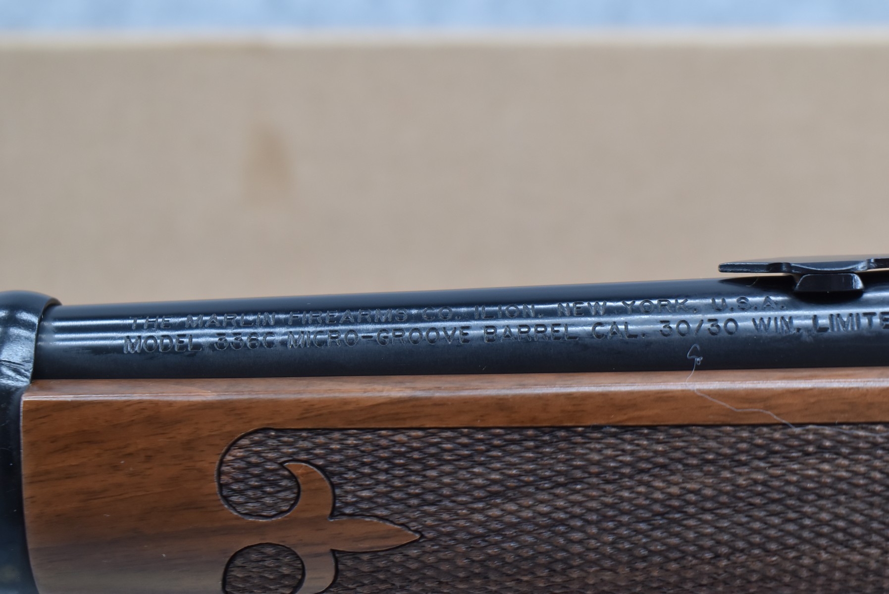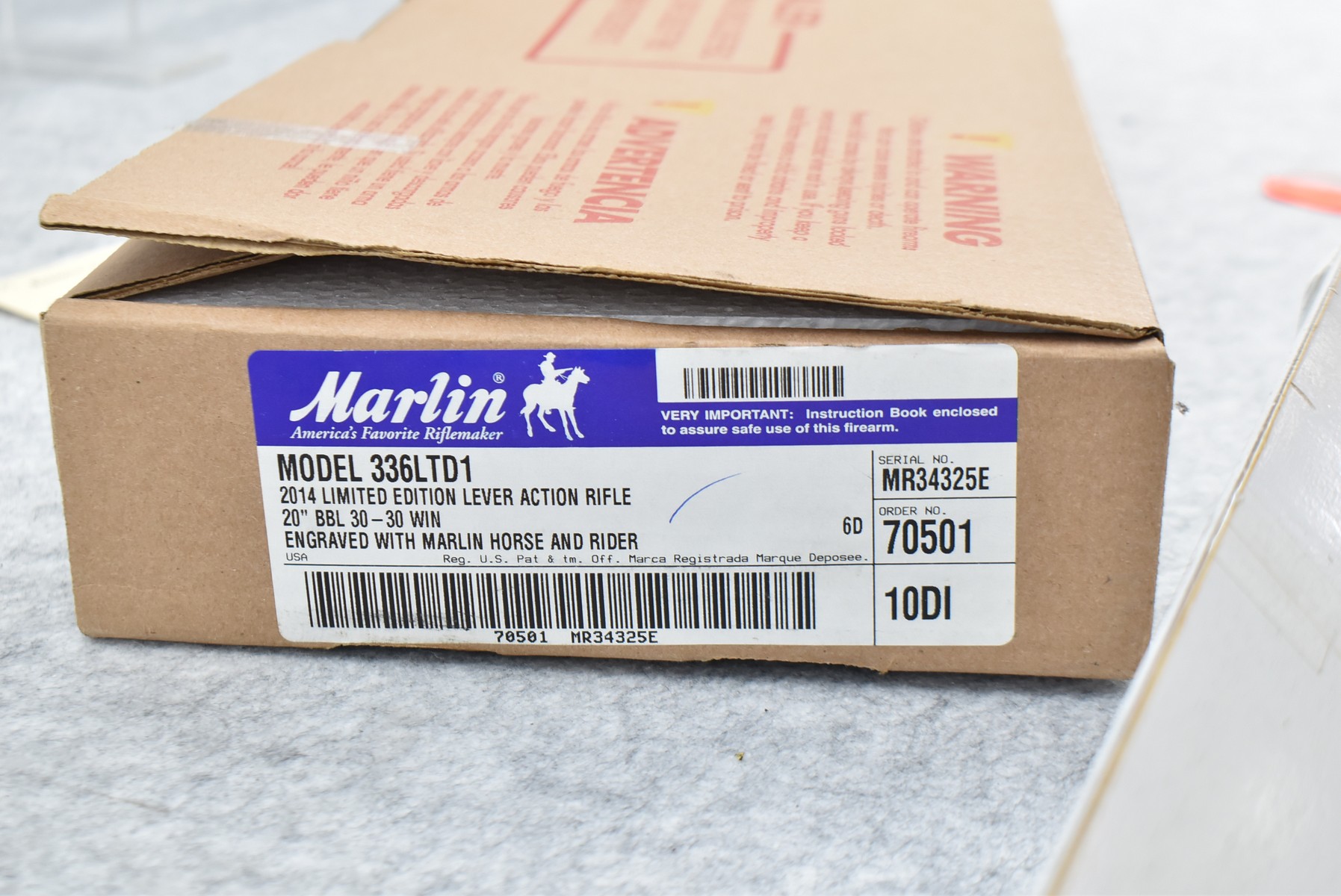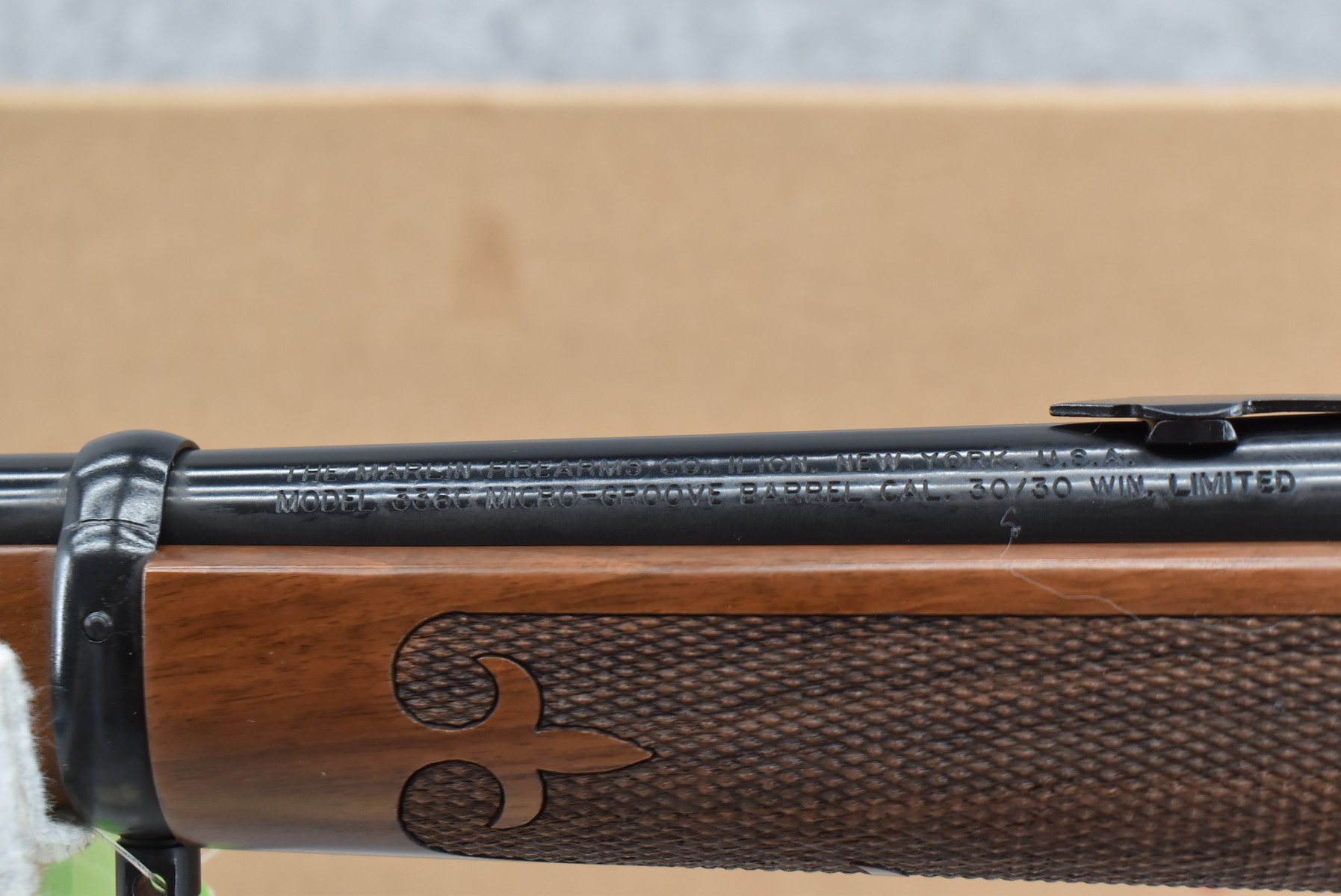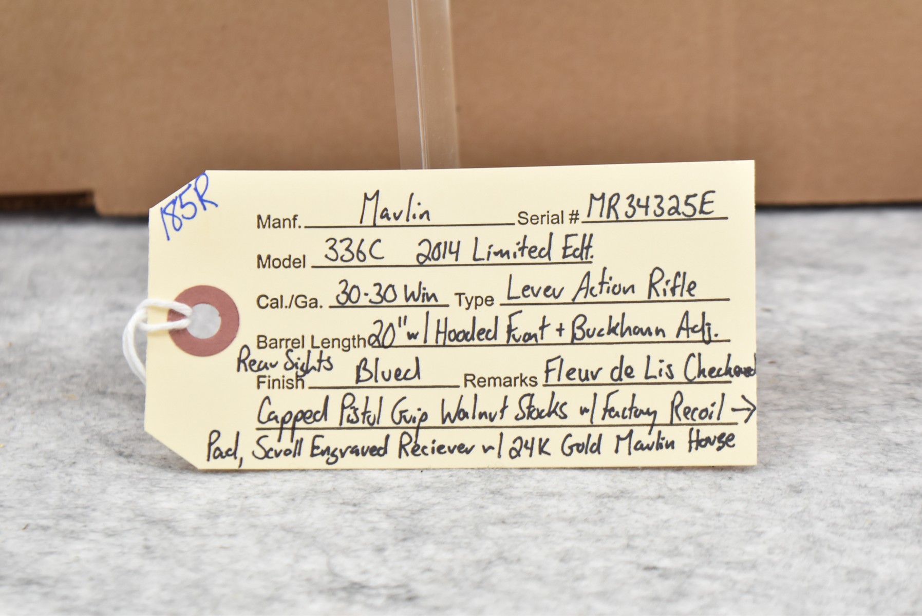 185R.     Marlin – Mod. 336C – 2014 Limited Edition – 30-30 Win. Cal. Lever Action Rifle – w/20” Barrel w/Hooded Front & Buckhorn Adj. Rear Sights – Blued Finish – w/Scroll Engraved Receiver w/24K Gold Marlin Horse & Rider Inlay on Left Side of Receiver – w/Fleur de Lis Checkered Capped Pistol Grip Walnut Stocks w/Factory Recoil Pad – New & Unfired w/Factory Box & Manual – Limited Number Mfg. in 2014 Only!