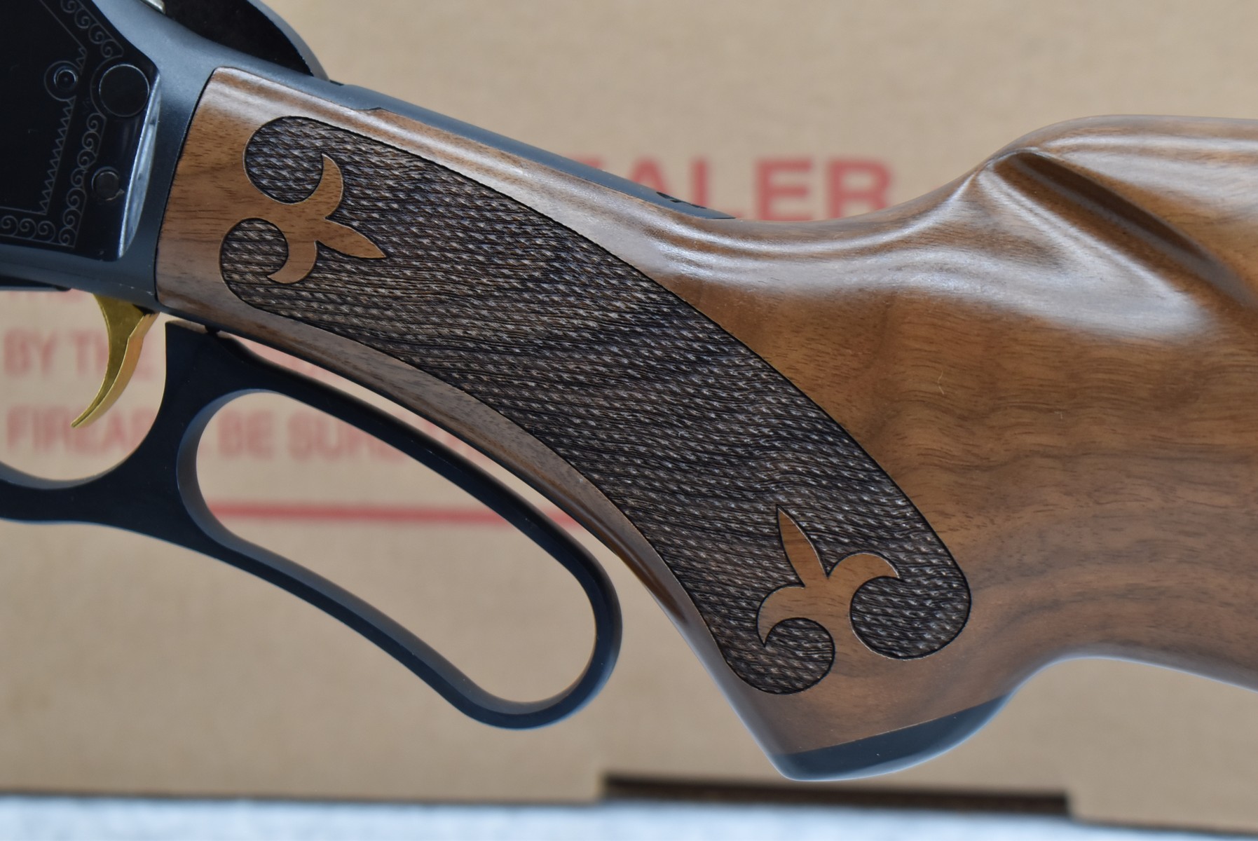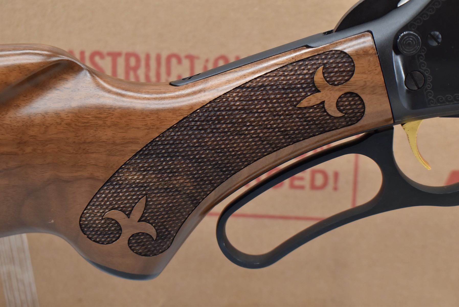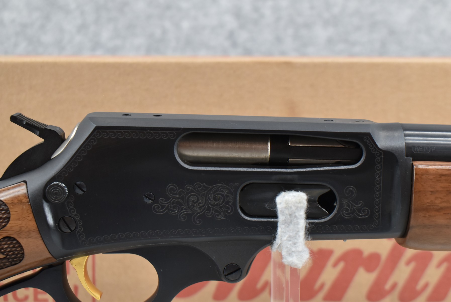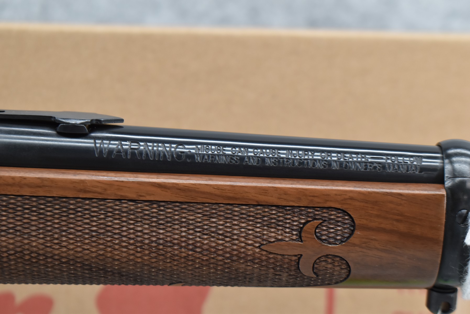 185R.     Marlin – Mod. 336C – 2014 Limited Edition – 30-30 Win. Cal. Lever Action Rifle – w/20” Barrel w/Hooded Front & Buckhorn Adj. Rear Sights – Blued Finish – w/Scroll Engraved Receiver w/24K Gold Marlin Horse & Rider Inlay on Left Side of Receiver – w/Fleur de Lis Checkered Capped Pistol Grip Walnut Stocks w/Factory Recoil Pad – New & Unfired w/Factory Box & Manual – Limited Number Mfg. in 2014 Only!