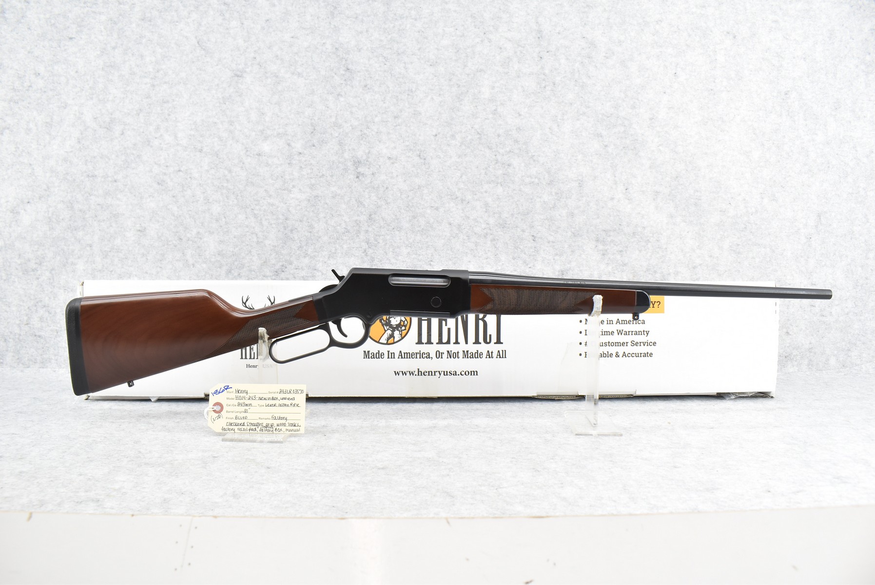 186R. Henry – Mod. H014-243 – 243 Win. Cal. Lever Action Rifle – w/20” Barrel – Blued Finish – w/Factory Checkered Straight Grip Wood Stocks w/Factory Recoil Pad – Unfired w/Factory Box & Manual