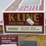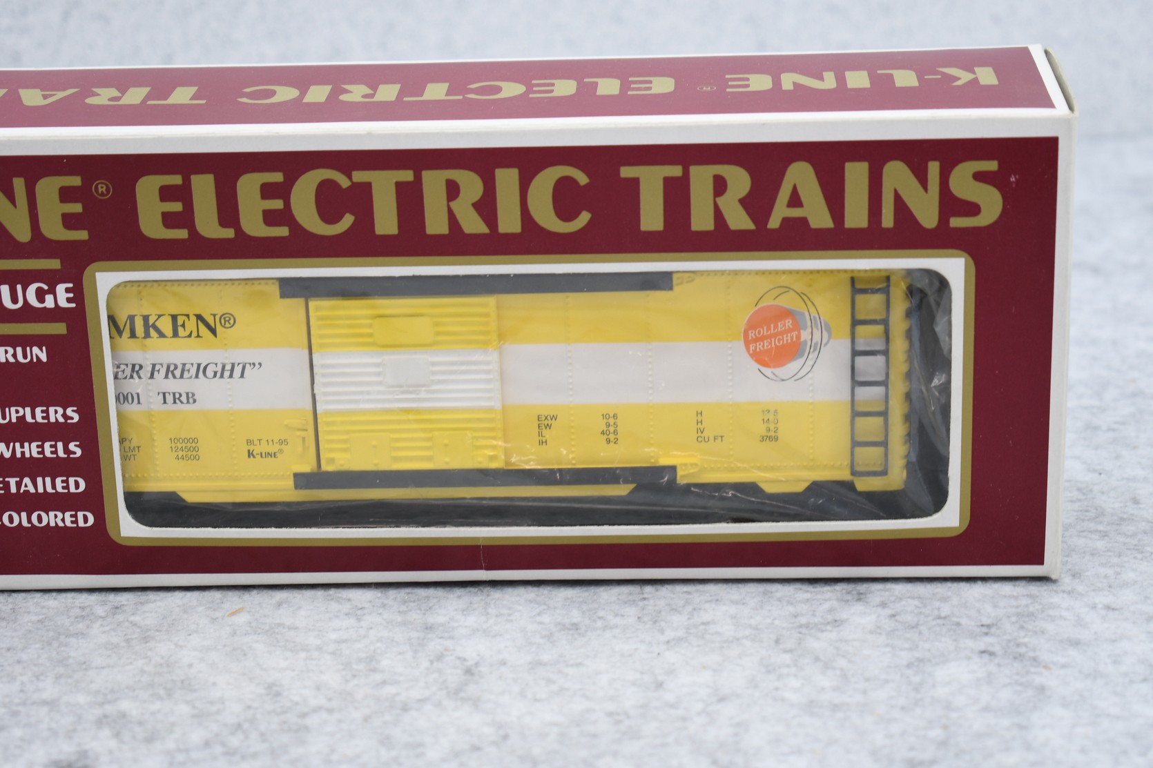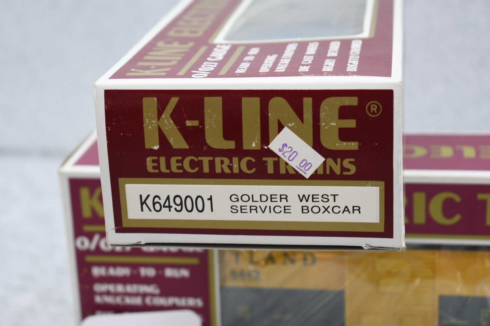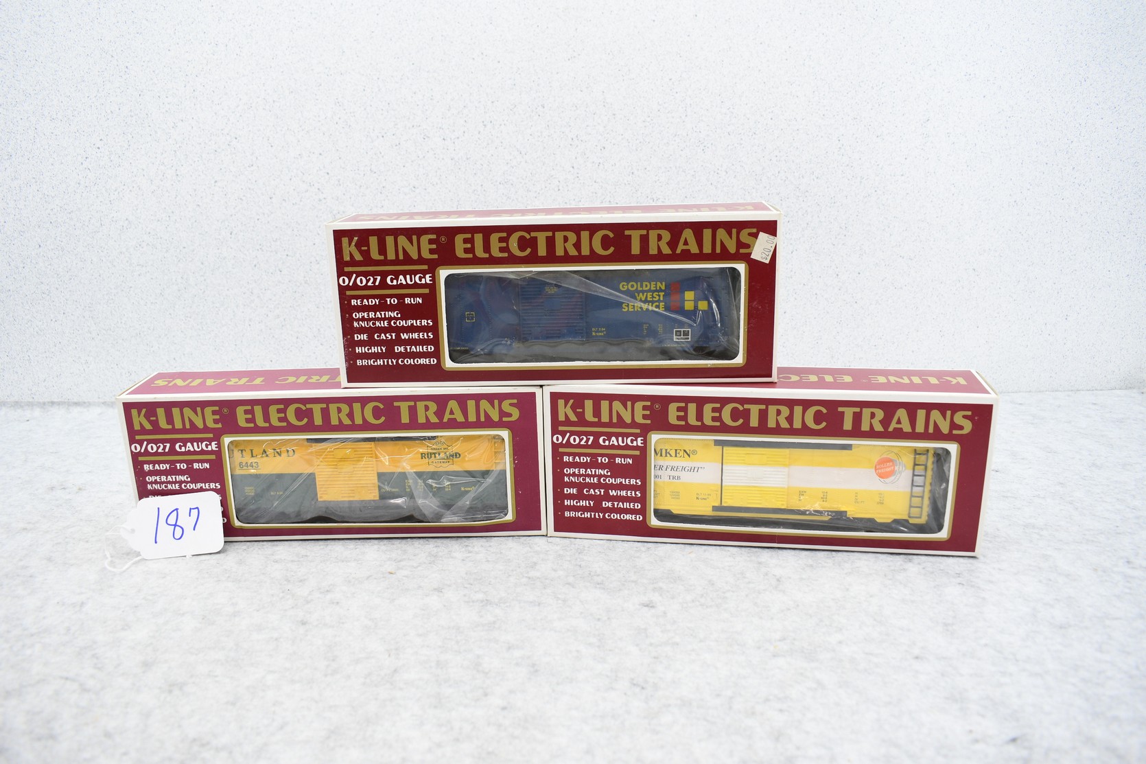 187. Lot of 3 K Line O Gauge train cars including K649001 Golden West Boxcar, K-6443 Rutland Classic boxcar and K641-0001 Timken Classic boxcar, all with boxes