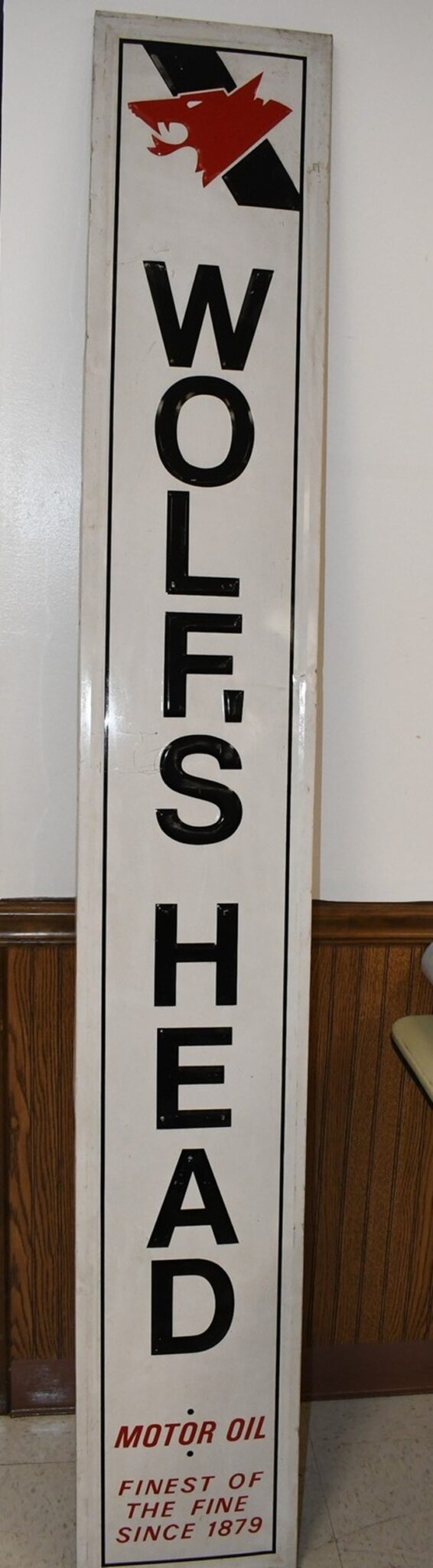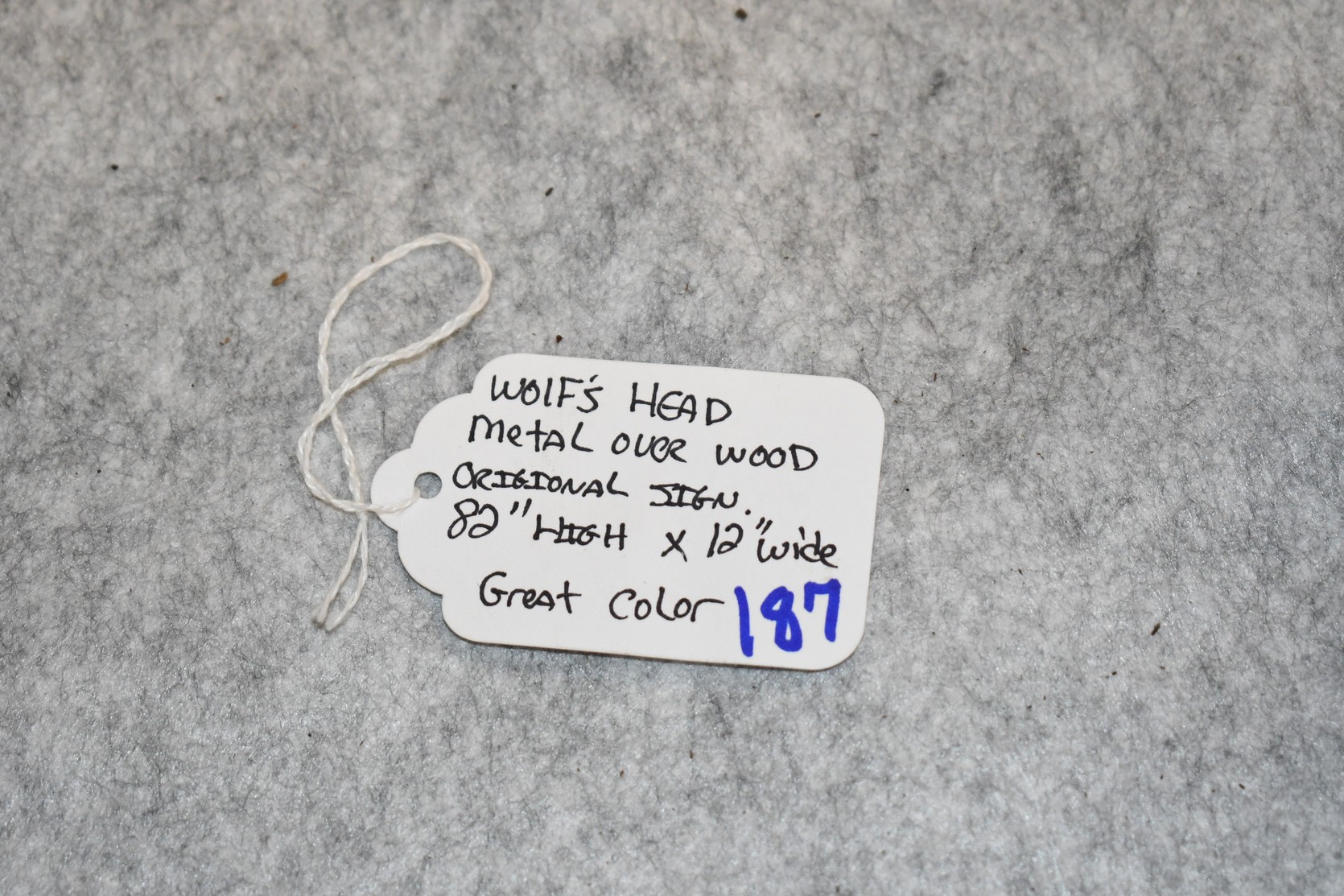 187. Wolf’s Head Metal Over Wood Original Sign – Measures 82” High x 12’ Wide – Has Great Color