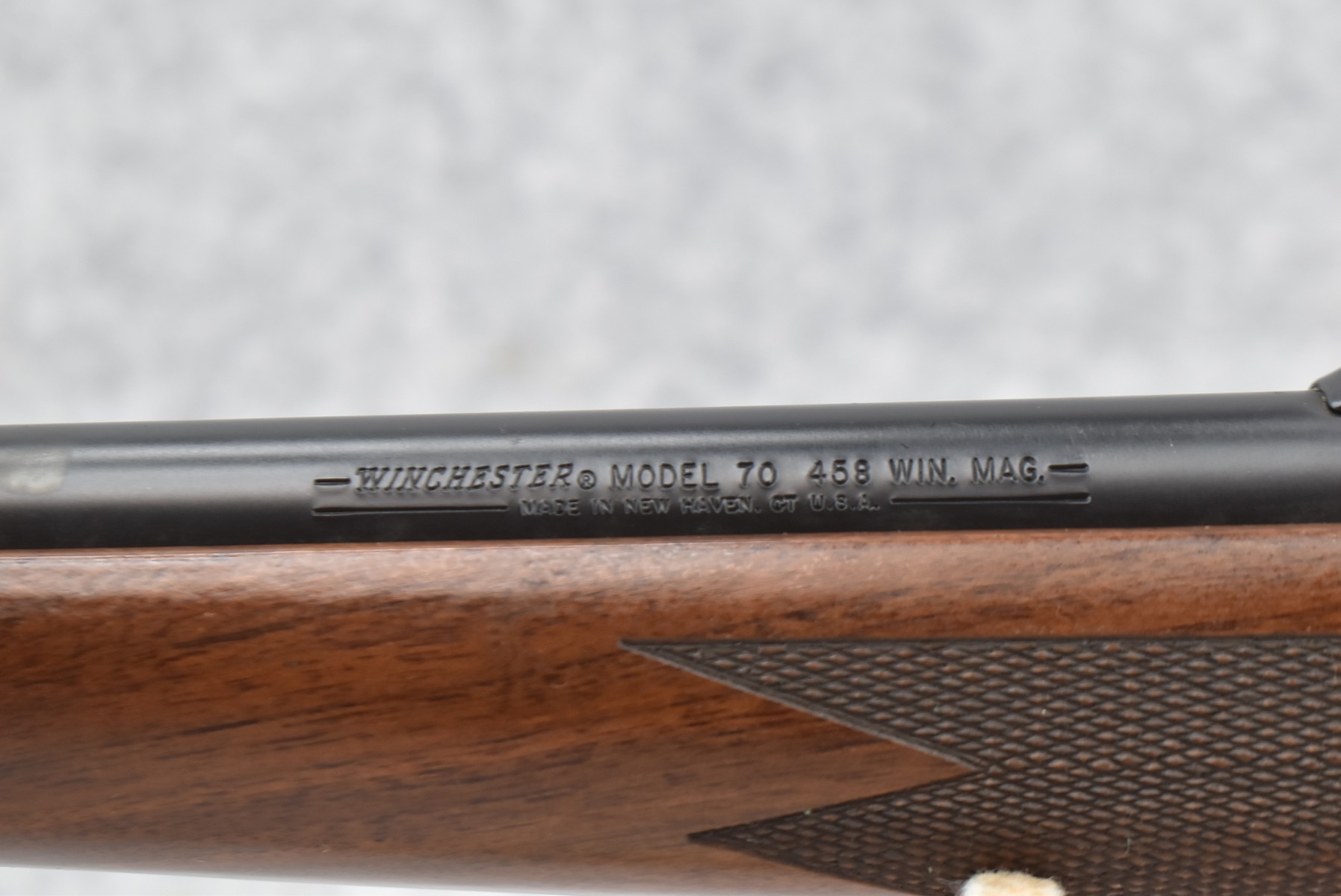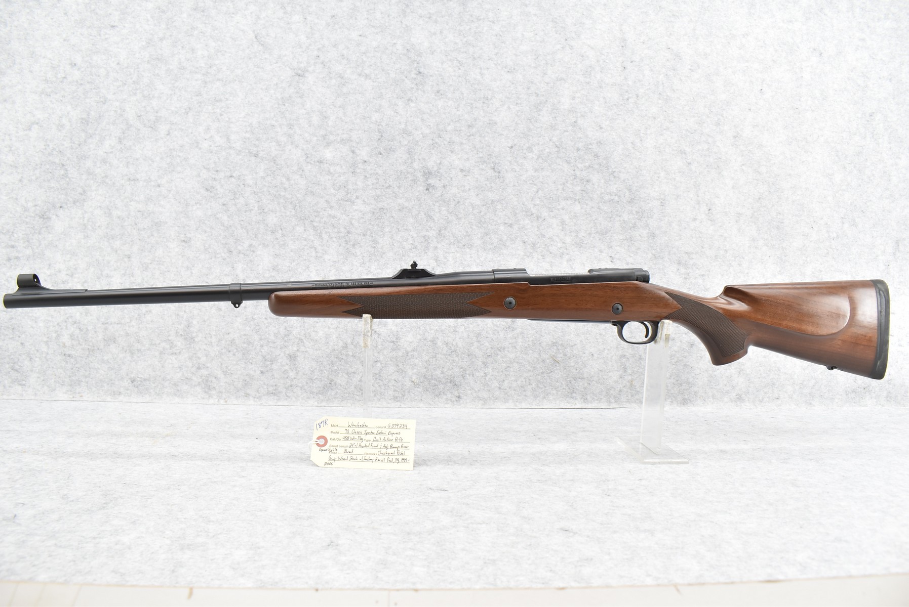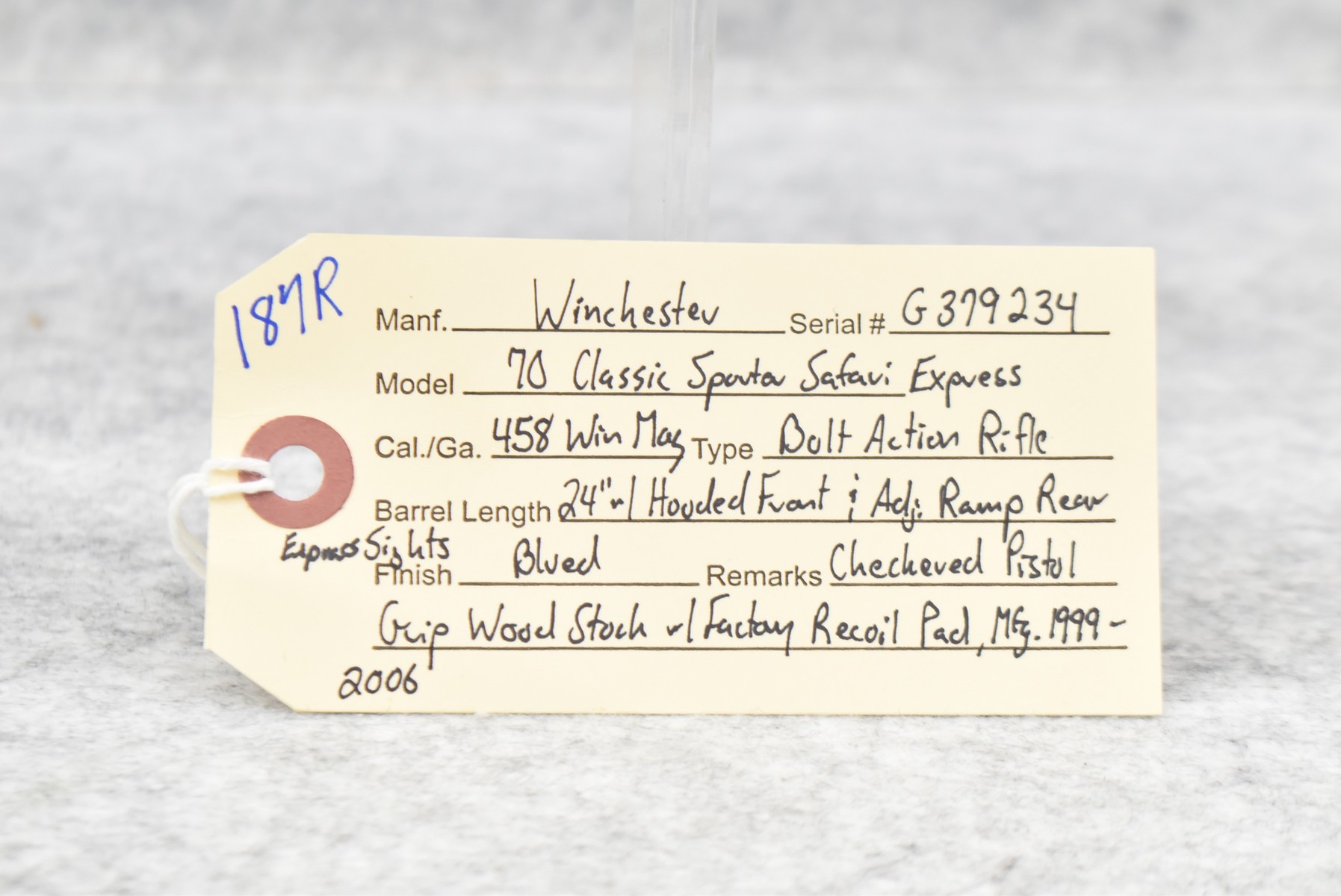 187R. Winchester – Mod. 70 Classic Sporter Safari Express – 458 Win. Mag. Cal. Bolt Action Rifle – w/24” Barrel w/Hooded Front & Adj. Ramp Rear Express Sights – Blued Finish – w/Checkered Pistol Grip Wood Stock w/Factory Recoil Pad – Mfg. Between 1999-2006