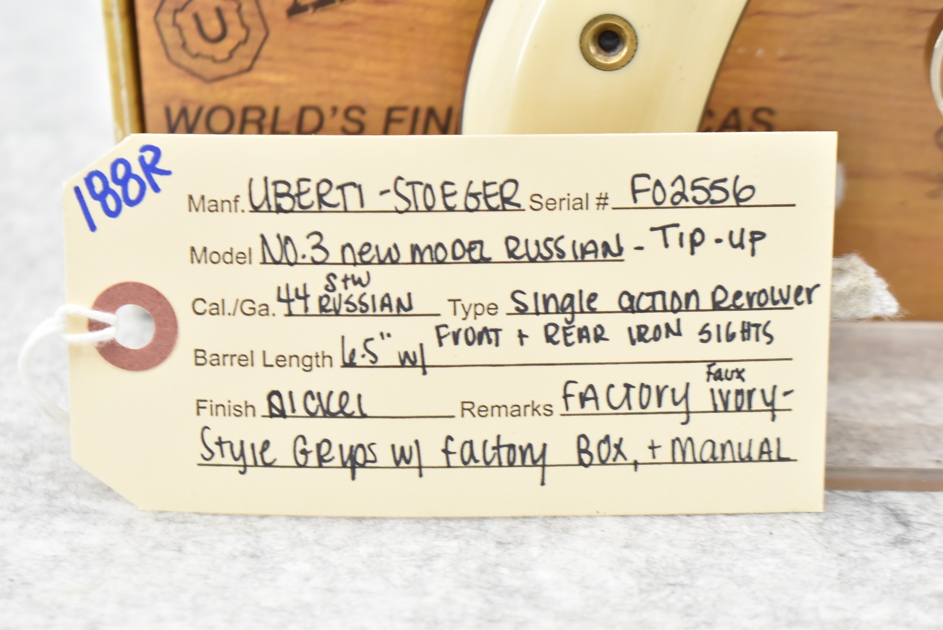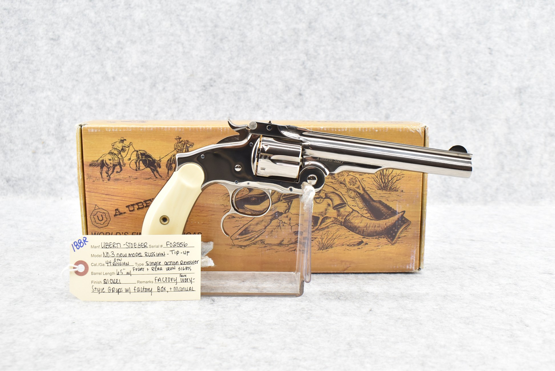 188R. Uberti-Stoeger – Mod. No. 3 New Model Russian – 44 S&W Russian Cal. Single Action Revolver – w/6½” Barrel w/Front and Rear Iron Sights – Nickel Finish – w/Factory Faux Ivory-Style Grips – Unfired w/Factory Box and Manual