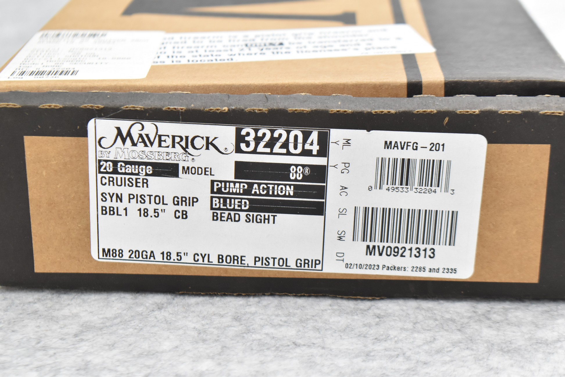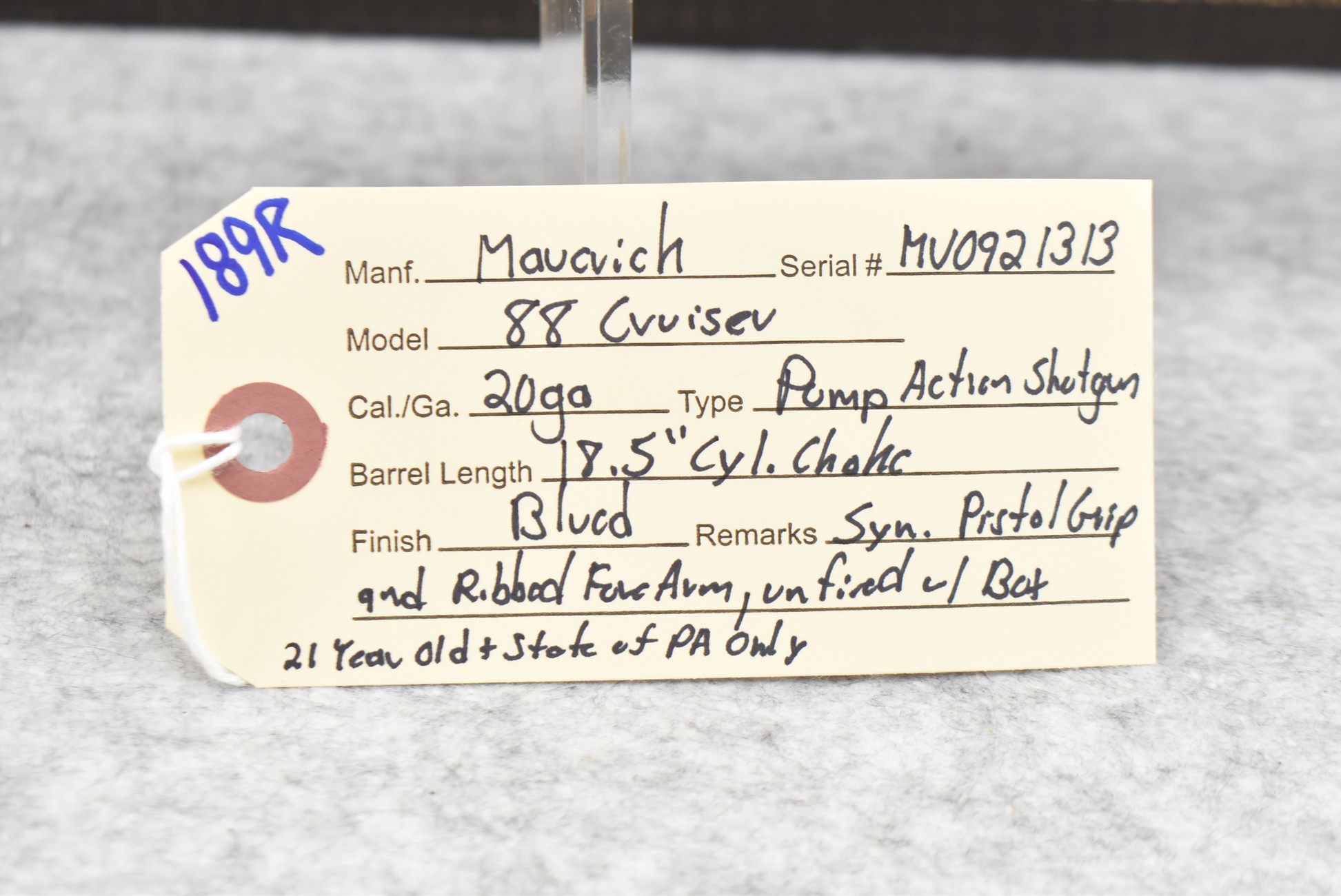 189R. Maverick – Mod. 88 Cruiser – 20ga. Pump Action Shotgun – w/18.5” Cyl Choke Barrel – Blued Finish – w/Synthetic Pistol Grip & Ribbed Forearm – Unfired w/Box – Must be 21 Years Old To Purchase & State of PA Resident – Registered As Handgun!!
