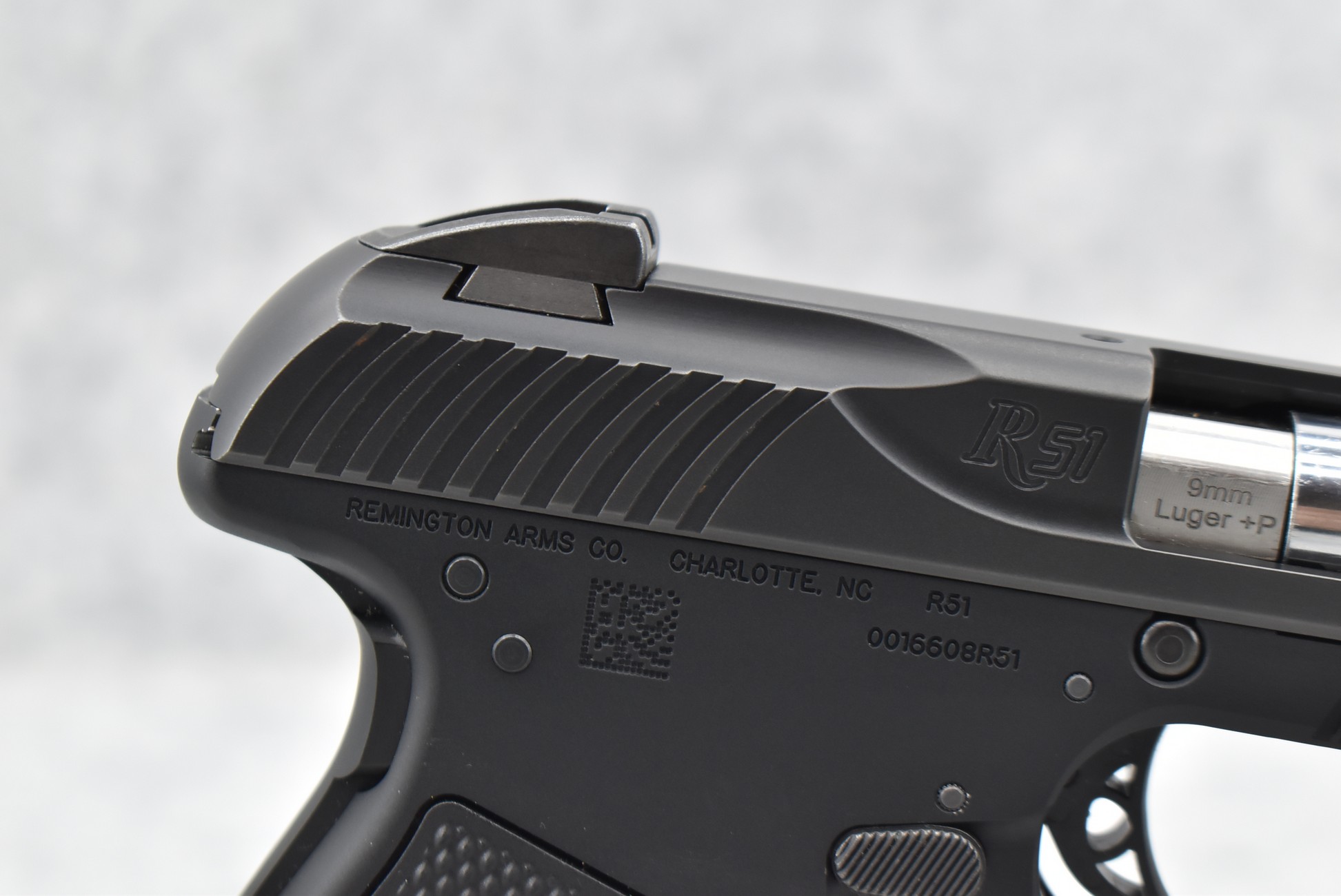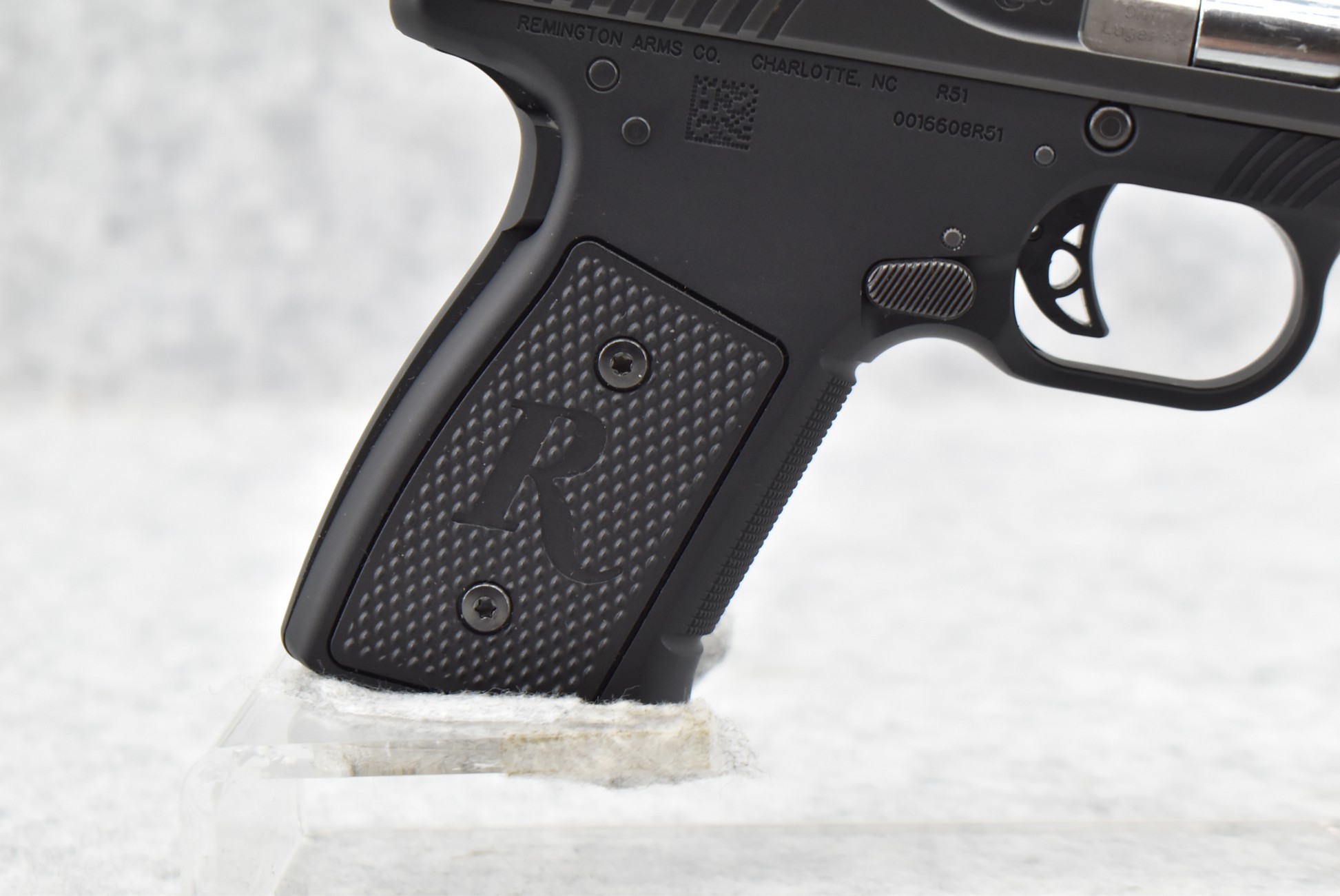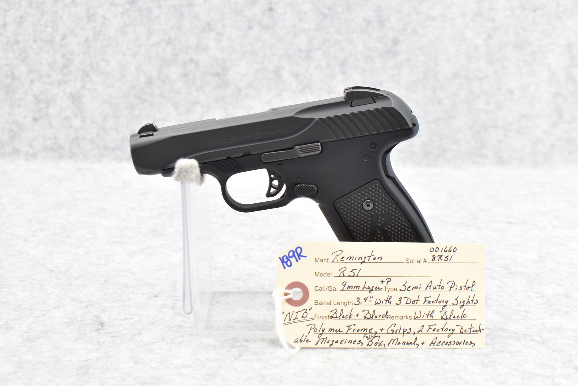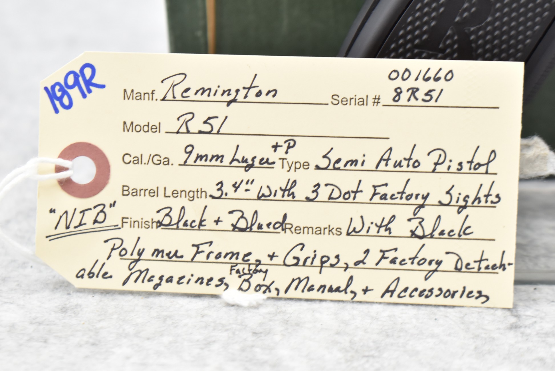 189R. Remington – Mod. R51 – 9mm Luger + P Cal. Semi-Auto Pistol – w/3.4” Barrel w/3-Dot Factory Sights – Matte Blued Finish – w/Black Polymer Frame and Grips – w/2 Factory Detachable Magazines – New in Factory Box w/Manual