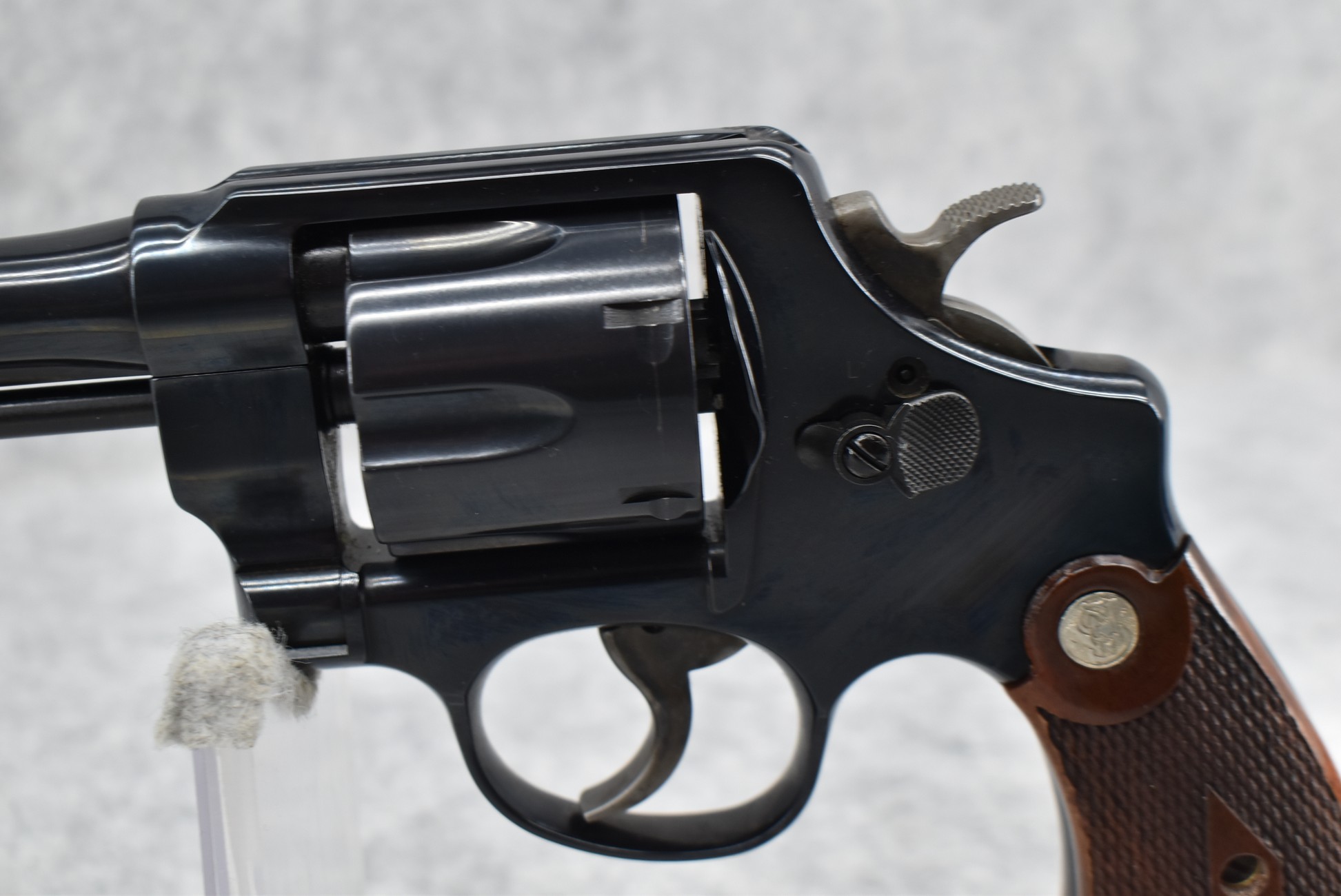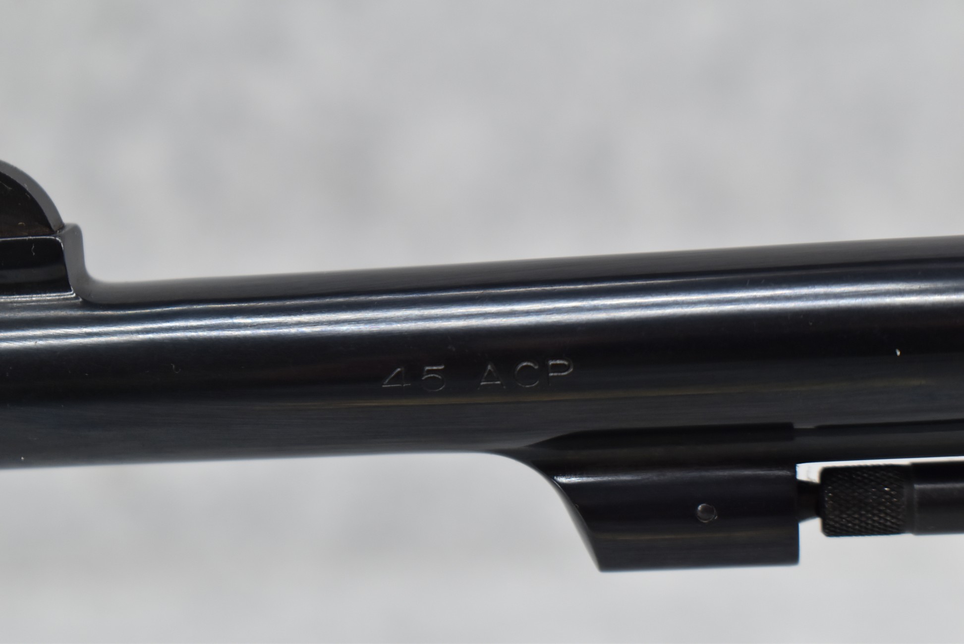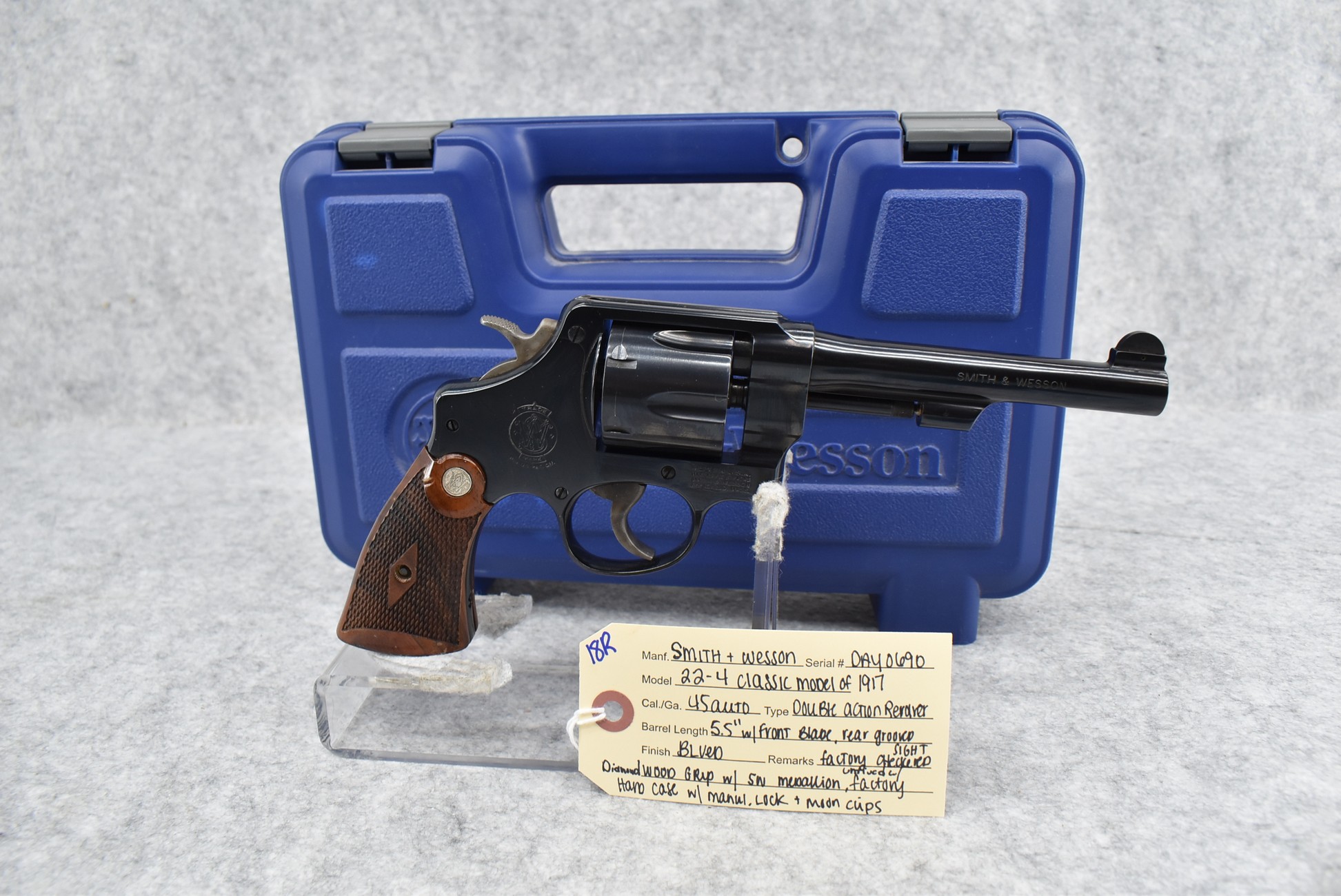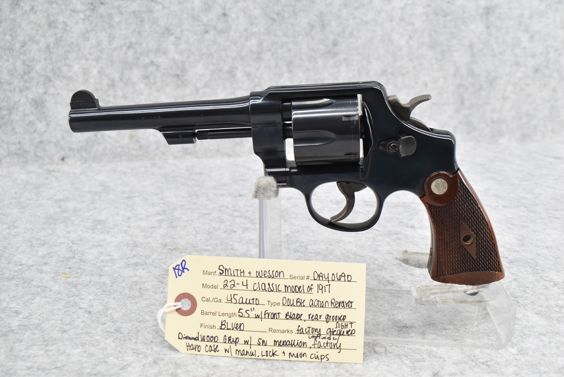 18R. Smith & Wesson – Mod. 22-4 Classic Model of 1917 – 45 Auto Cal. Double Action Revolver – w/5.5” Barrel w/Front Blade & Rear Grooved Sights – Blued Finish – w/Factory Checkered Diamond Wood Grip w/S&W Medallion – Unfired w/Factory Hard Case, Moon Clips & Manual