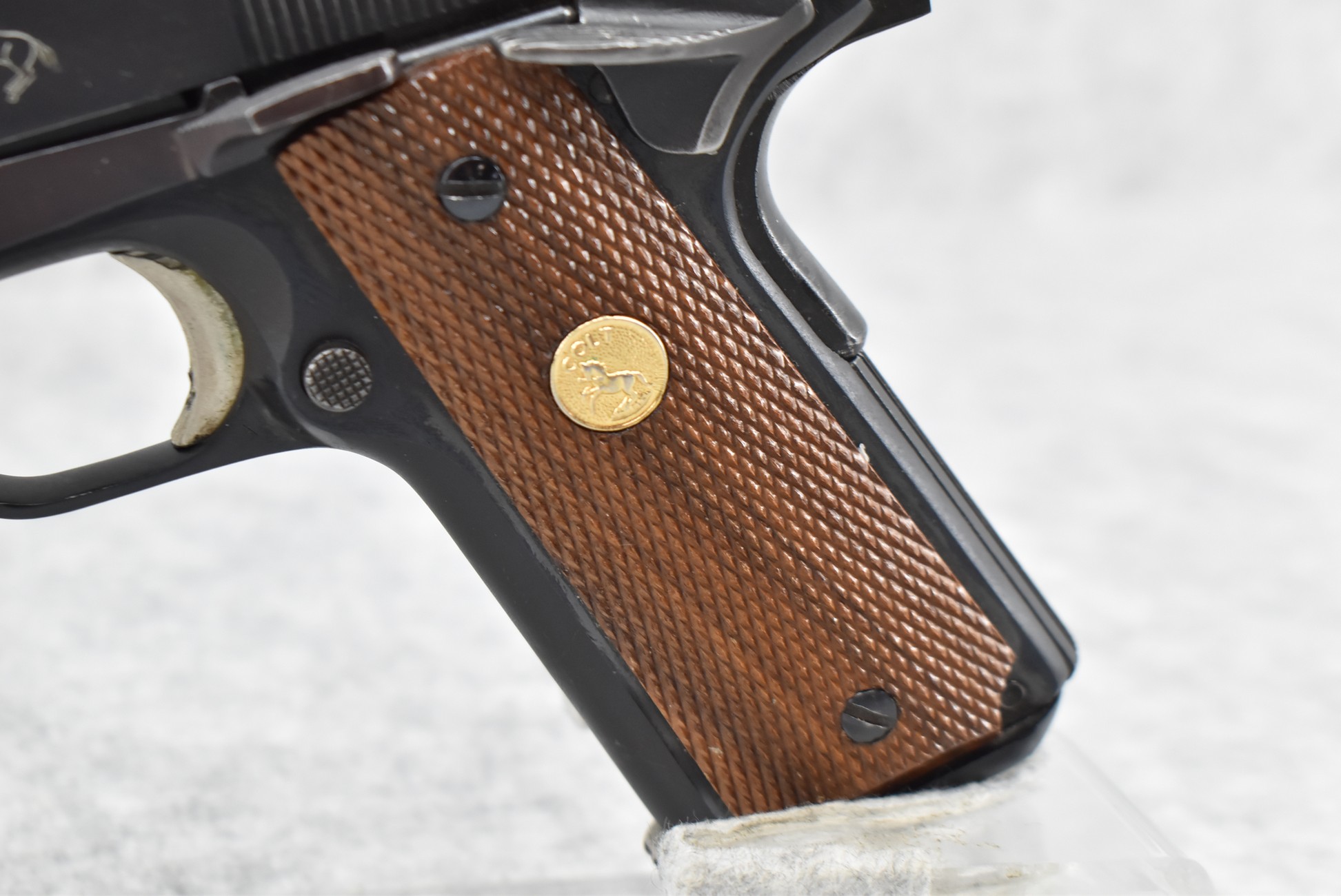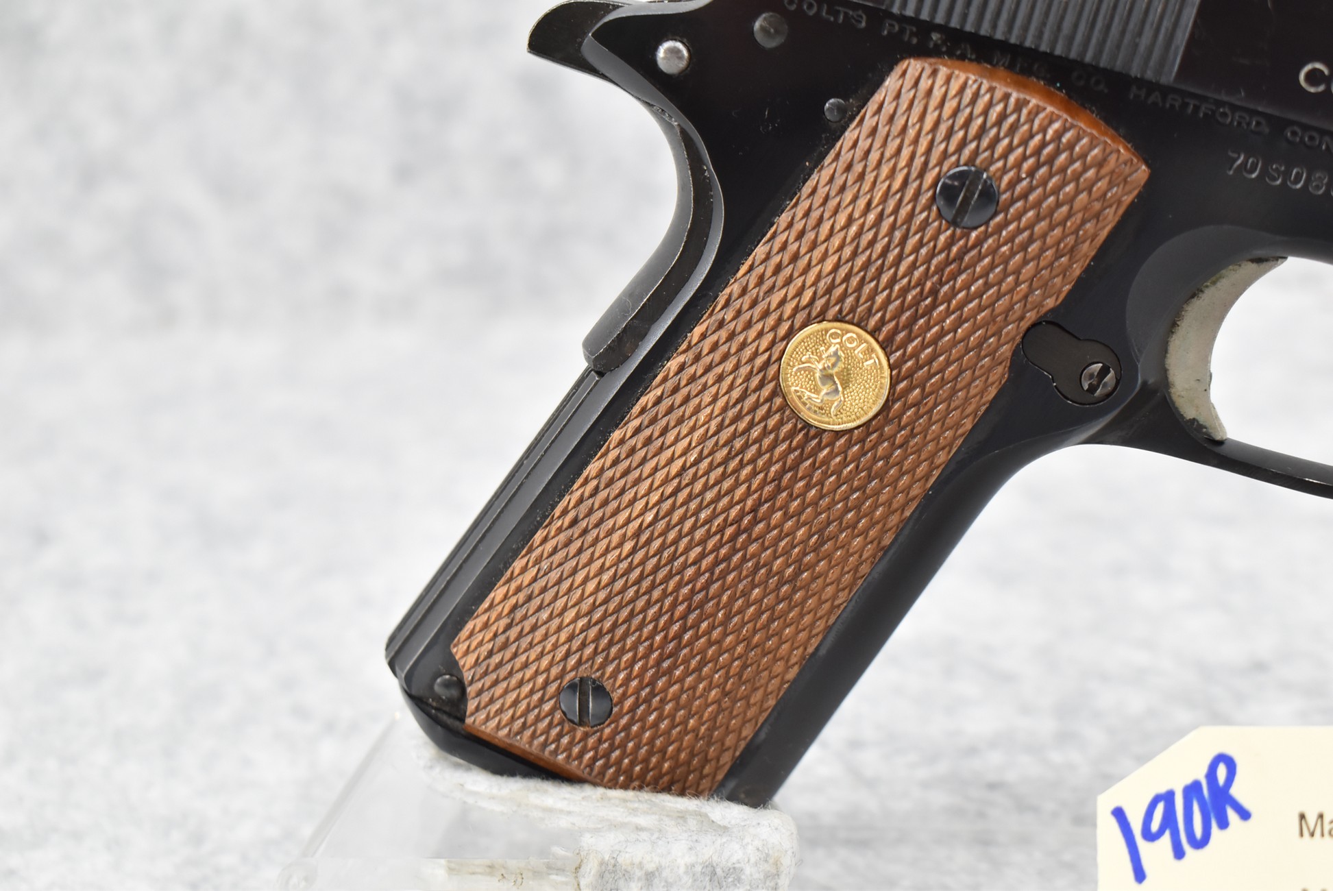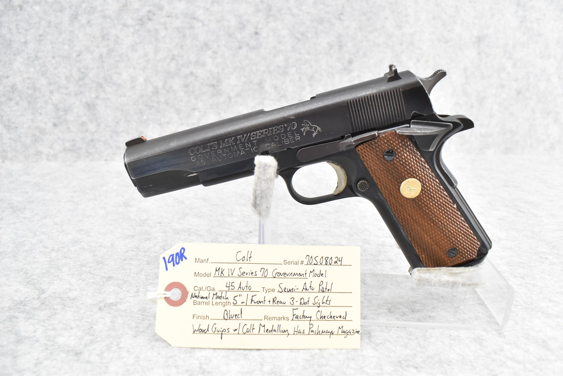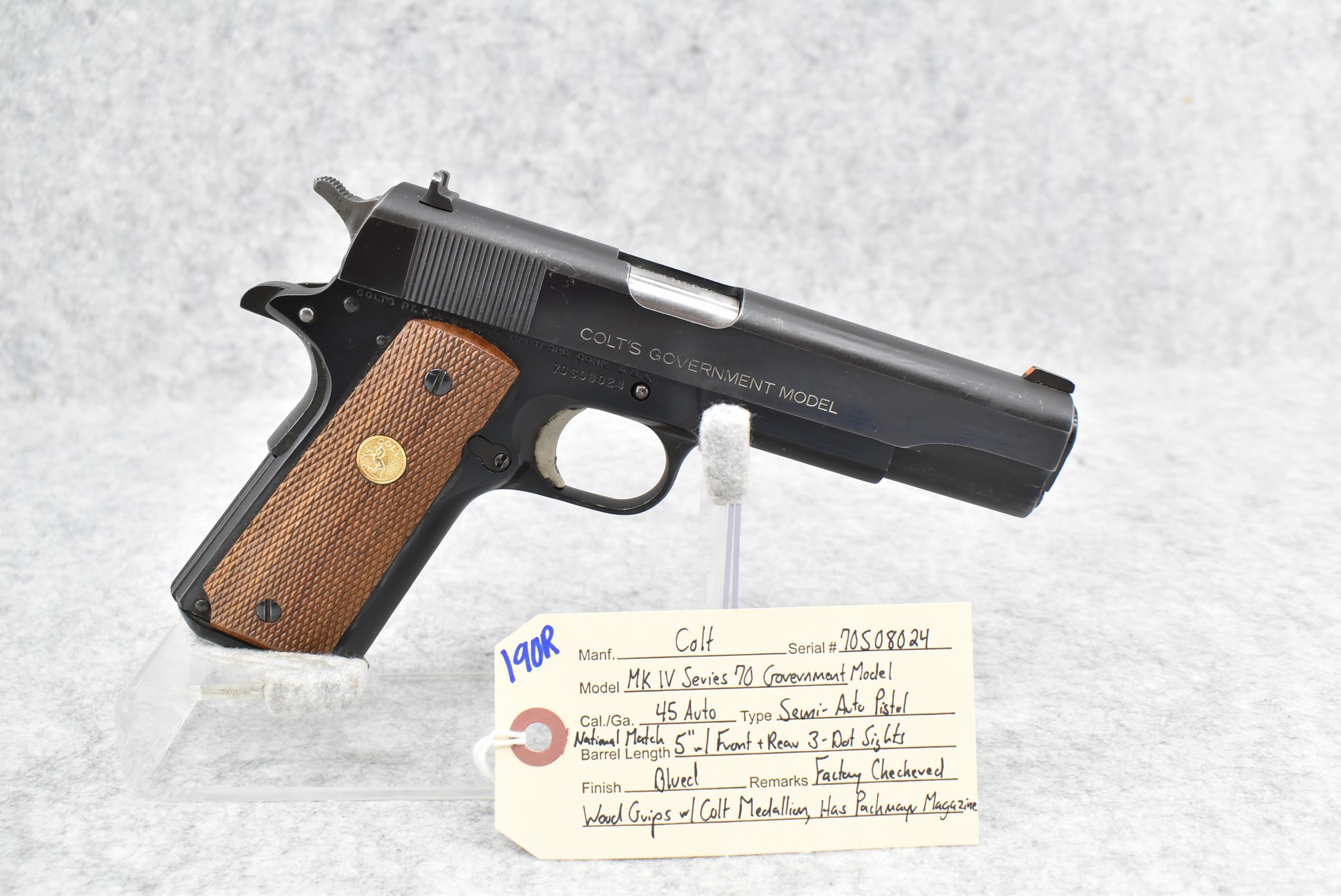 190R. Colt – Mod. MKIV Series 70 Government Model – 45 Auto Cal. Semi-Auto Pistol – w/5” National Match Barrel w/Front & Rear 3-Dot Sights – Blued Finish – w/Factory Checkered Wood Grips w/Colt Medallion – w/Pachmayr Magazine