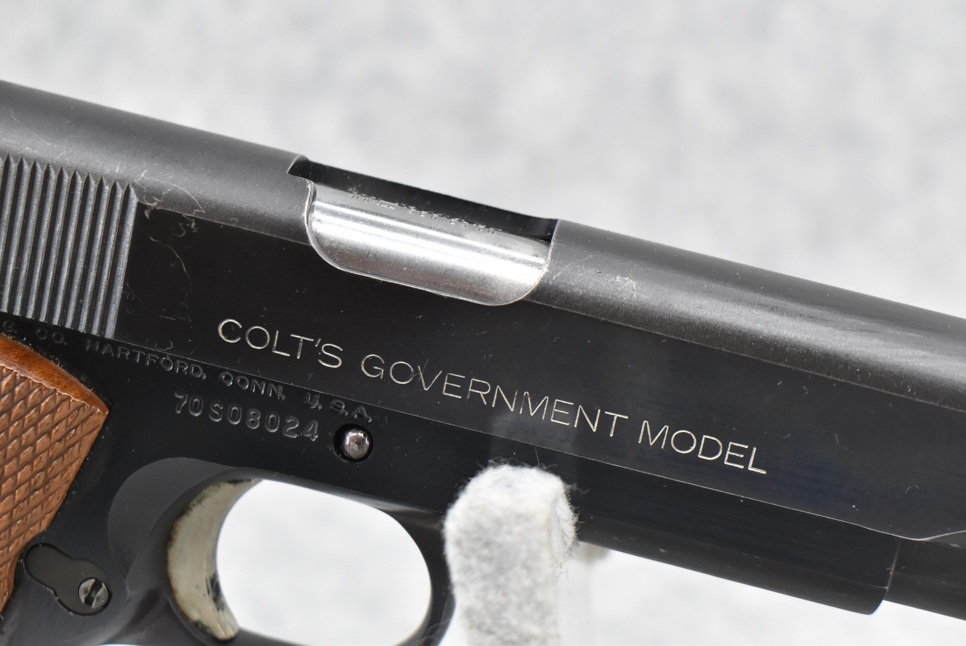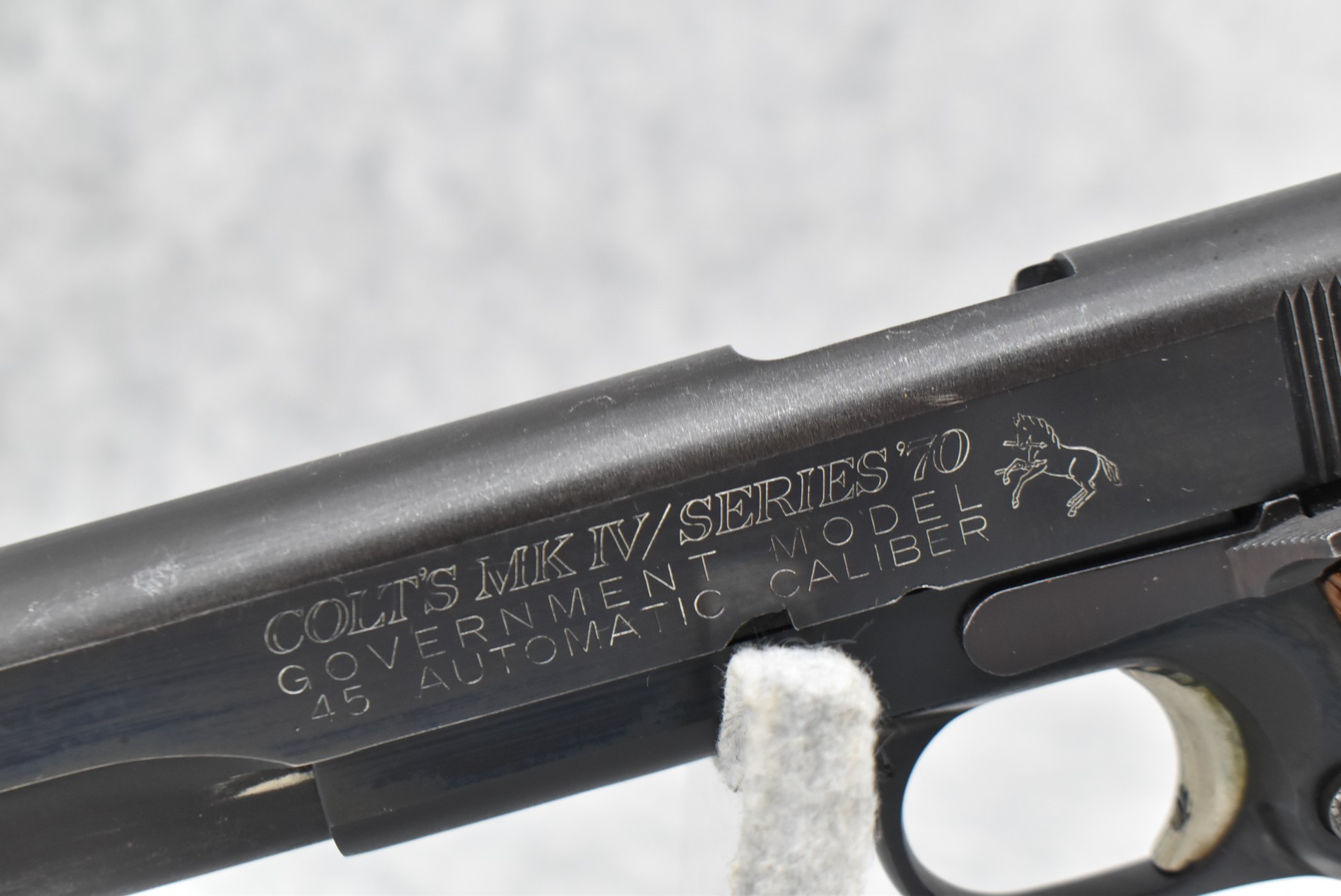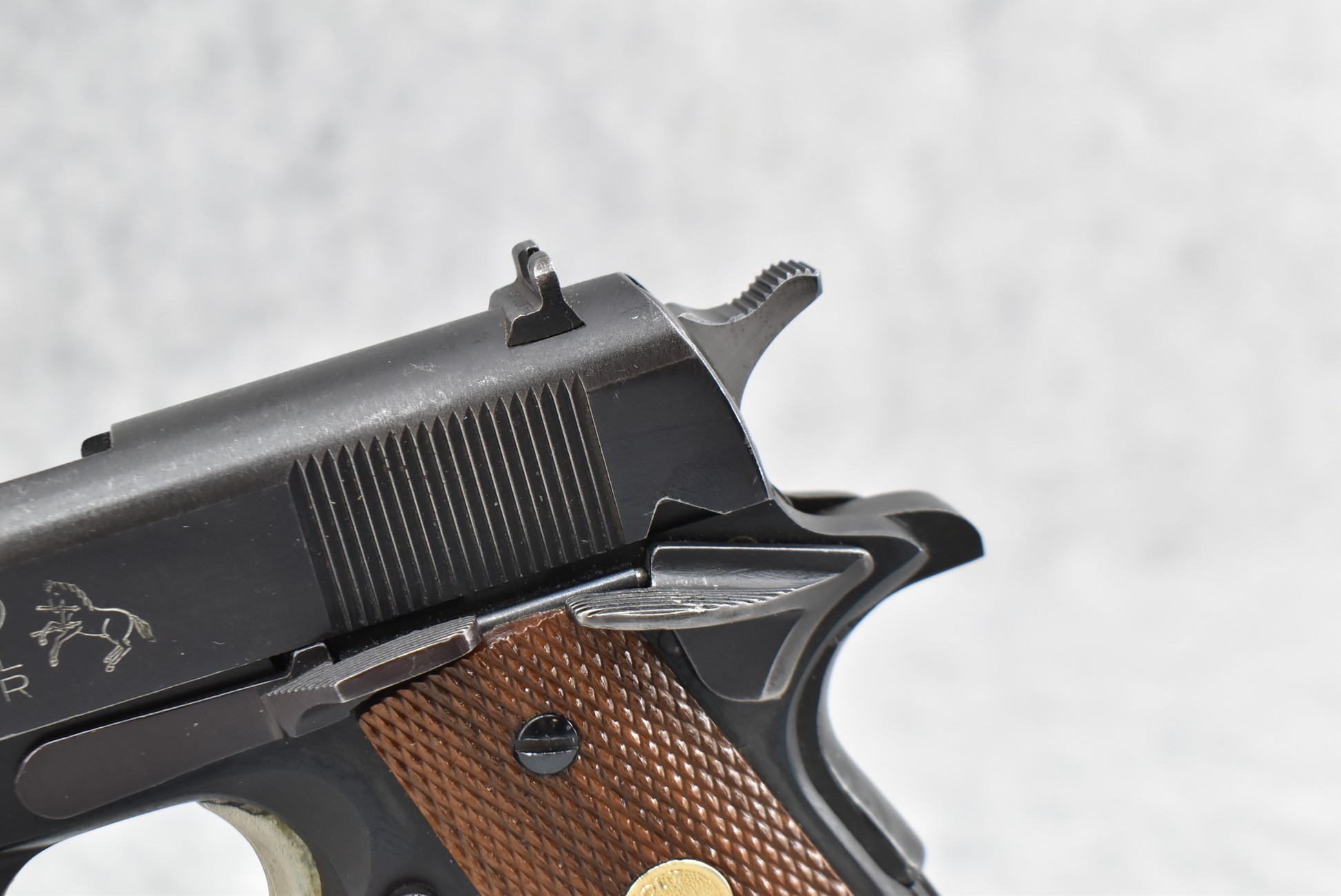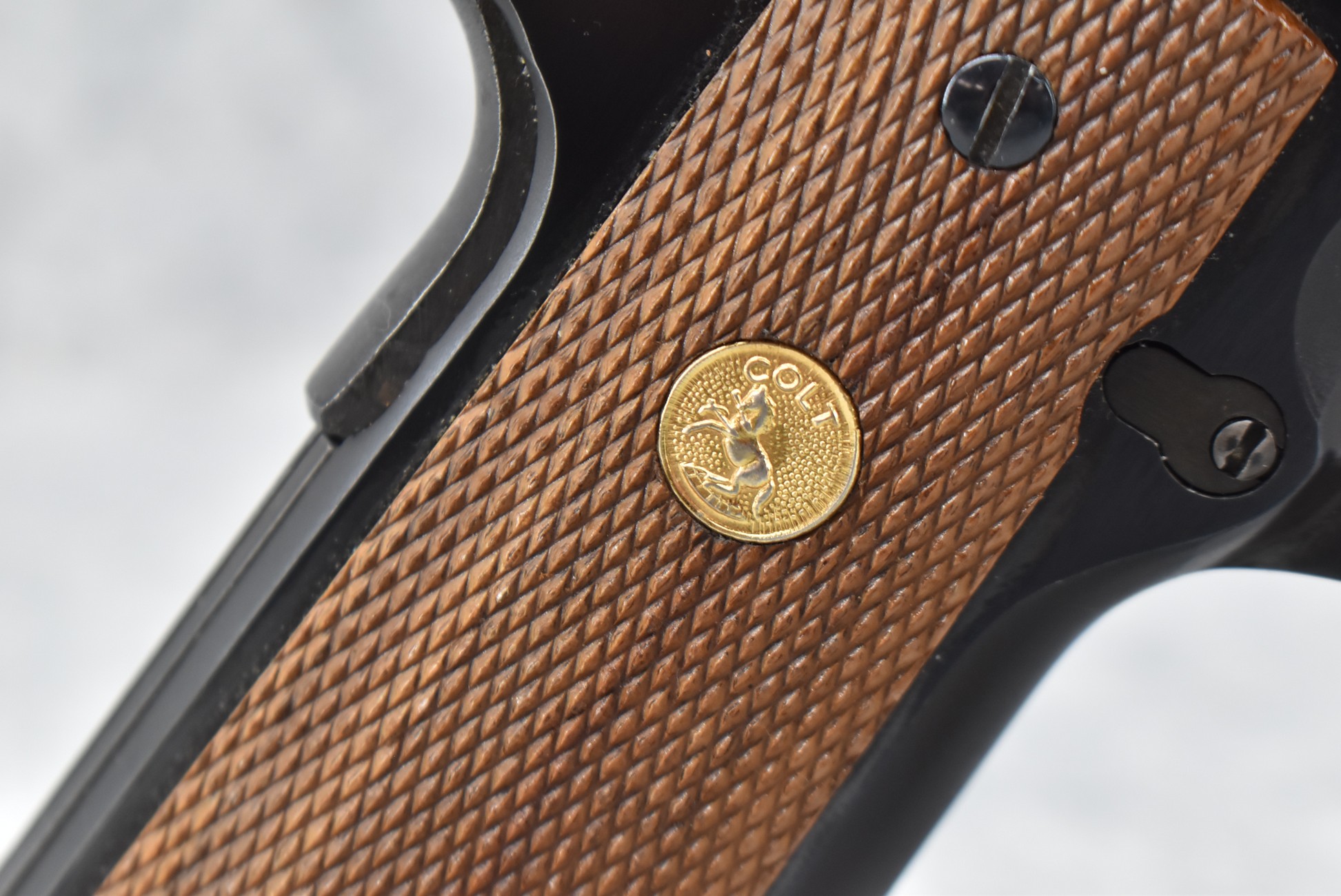 190R. Colt – Mod. MKIV Series 70 Government Model – 45 Auto Cal. Semi-Auto Pistol – w/5” National Match Barrel w/Front & Rear 3-Dot Sights – Blued Finish – w/Factory Checkered Wood Grips w/Colt Medallion – w/Pachmayr Magazine