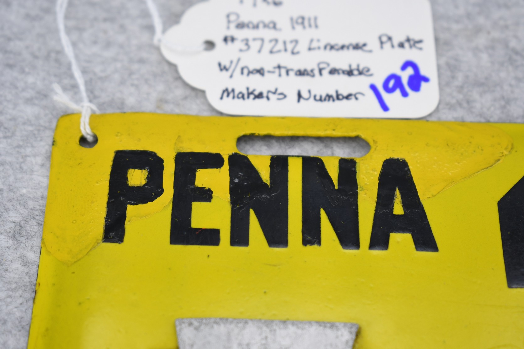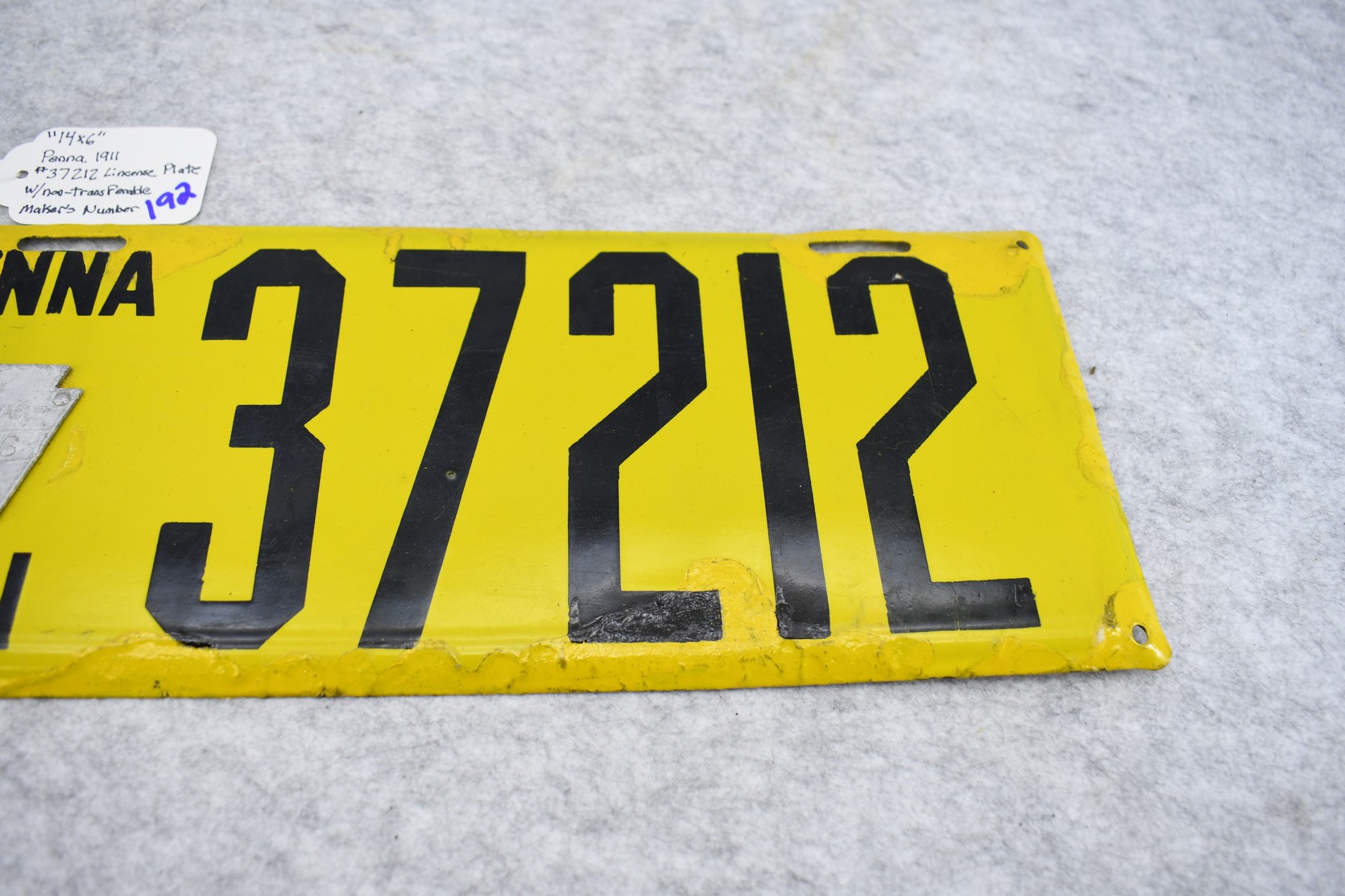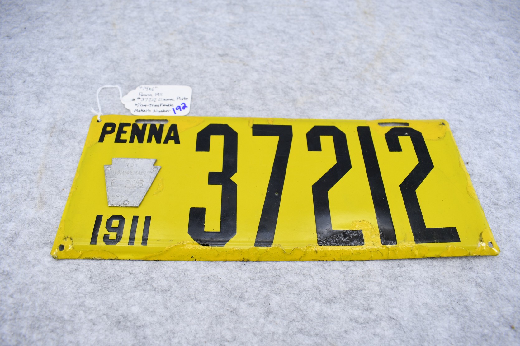 192. Penna. 1911 Porcelain Keystone License Plate – Plate has Nontransferable Makers Number – Plate has been Touched Up