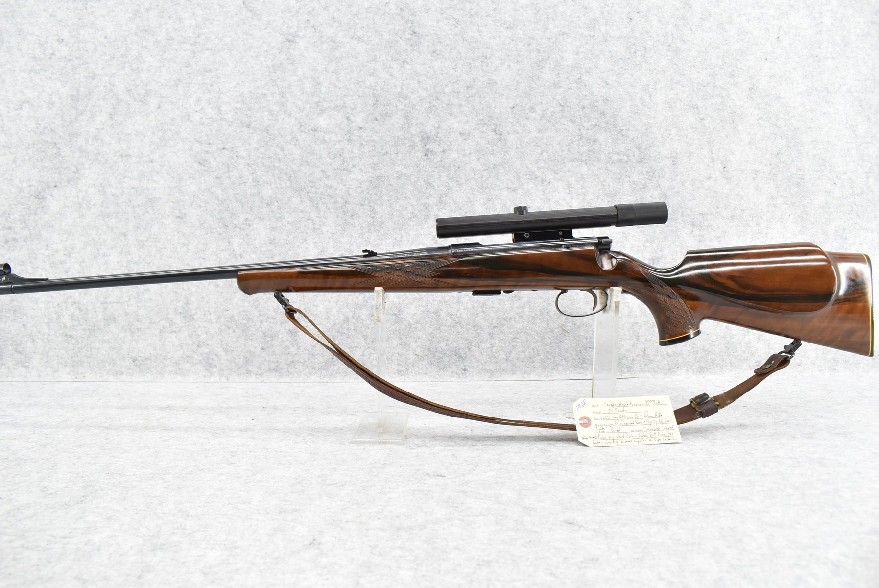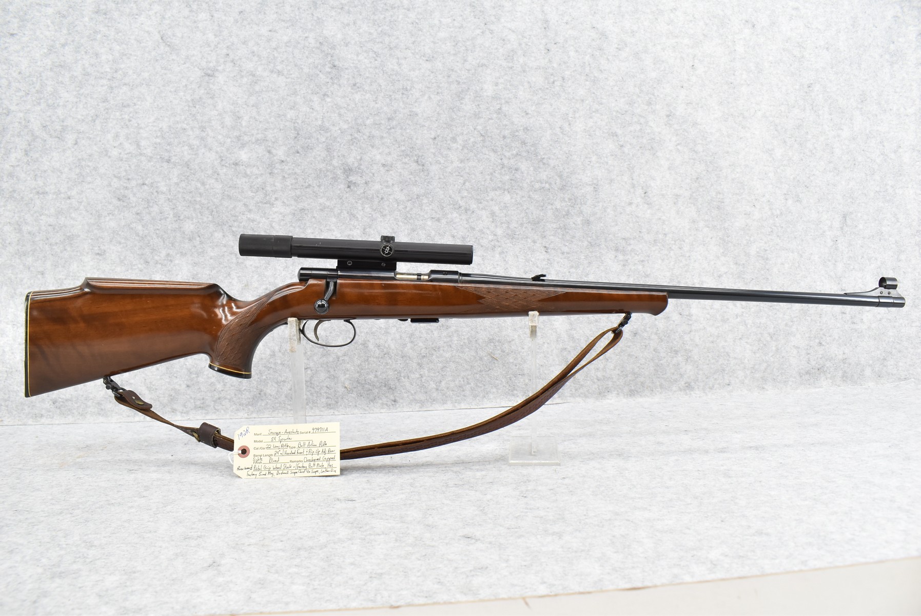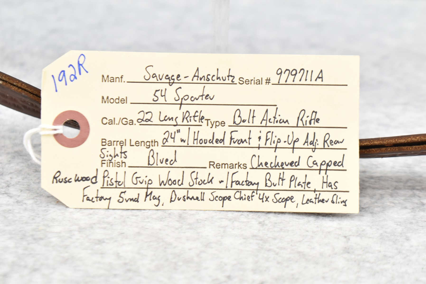 192R. Savage-Anchutz – Mod. 54 Sporter – 22 Long Rifle Cal. Bolt Action Rifle – w/24” Barrel w/Hooded Front & Flip-Up Adj. Rear Sights – Blued Finish – w/Checkered Capped Rosewood Pistol Grip Wood Stock w/Factory Butt Plate – w/Factory 5Rd Mag – w/Leather Sling – w/Bushnell Scope Chief 4x Scope