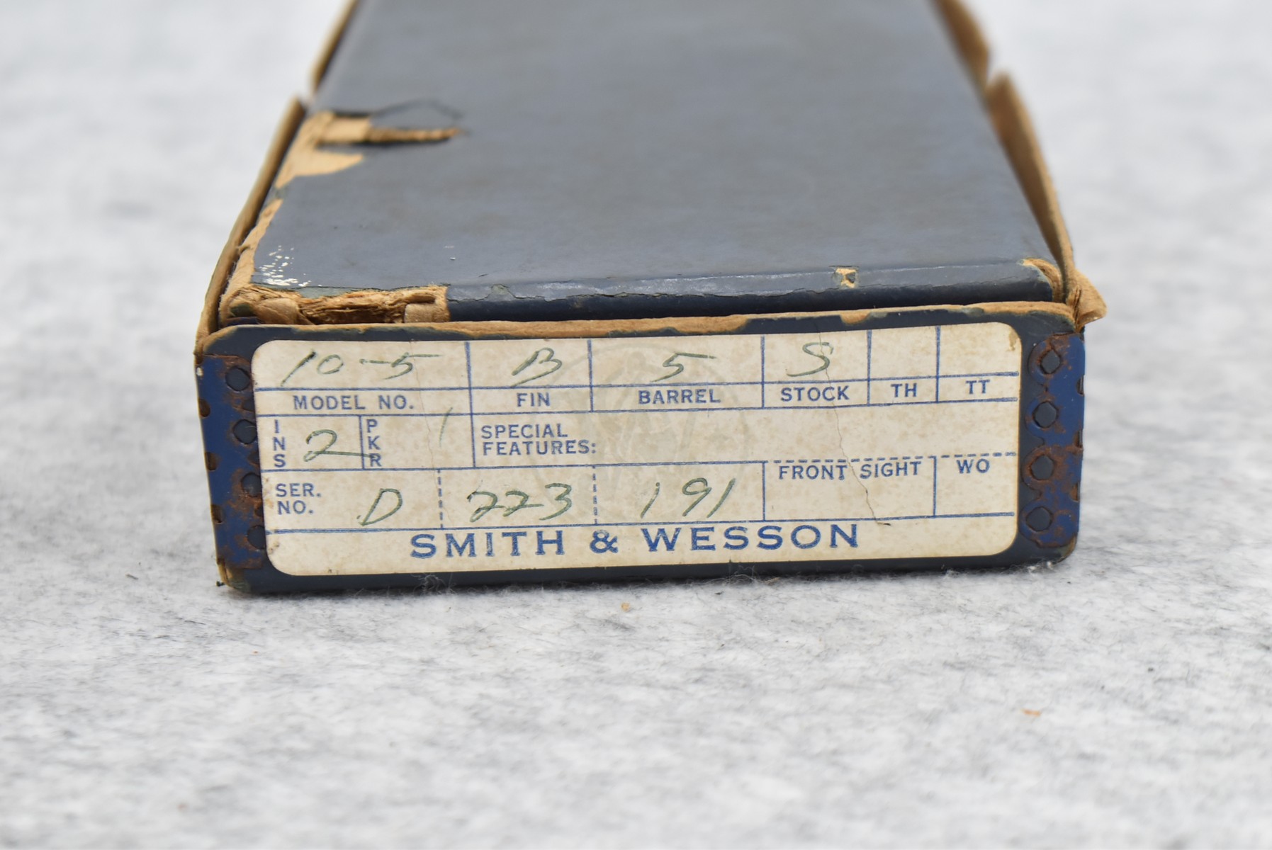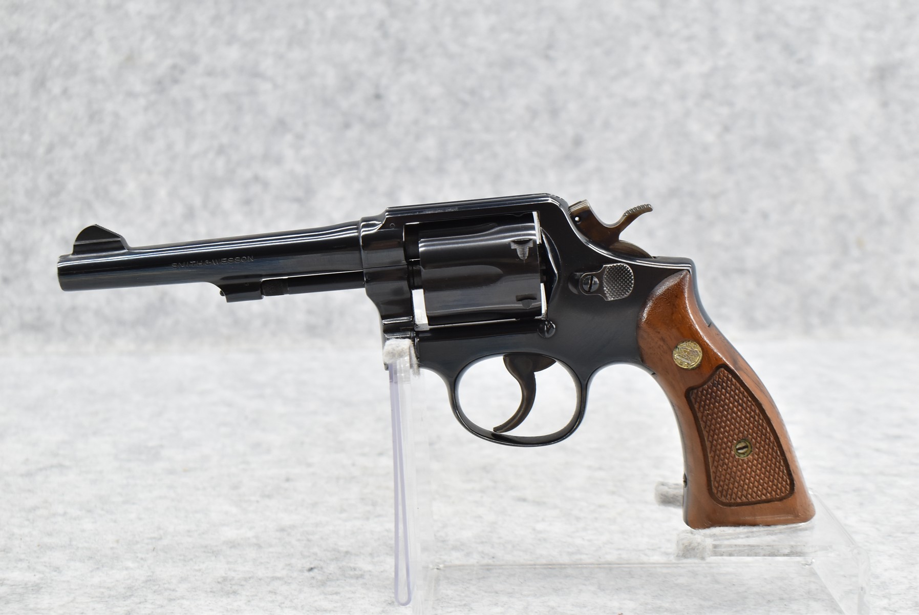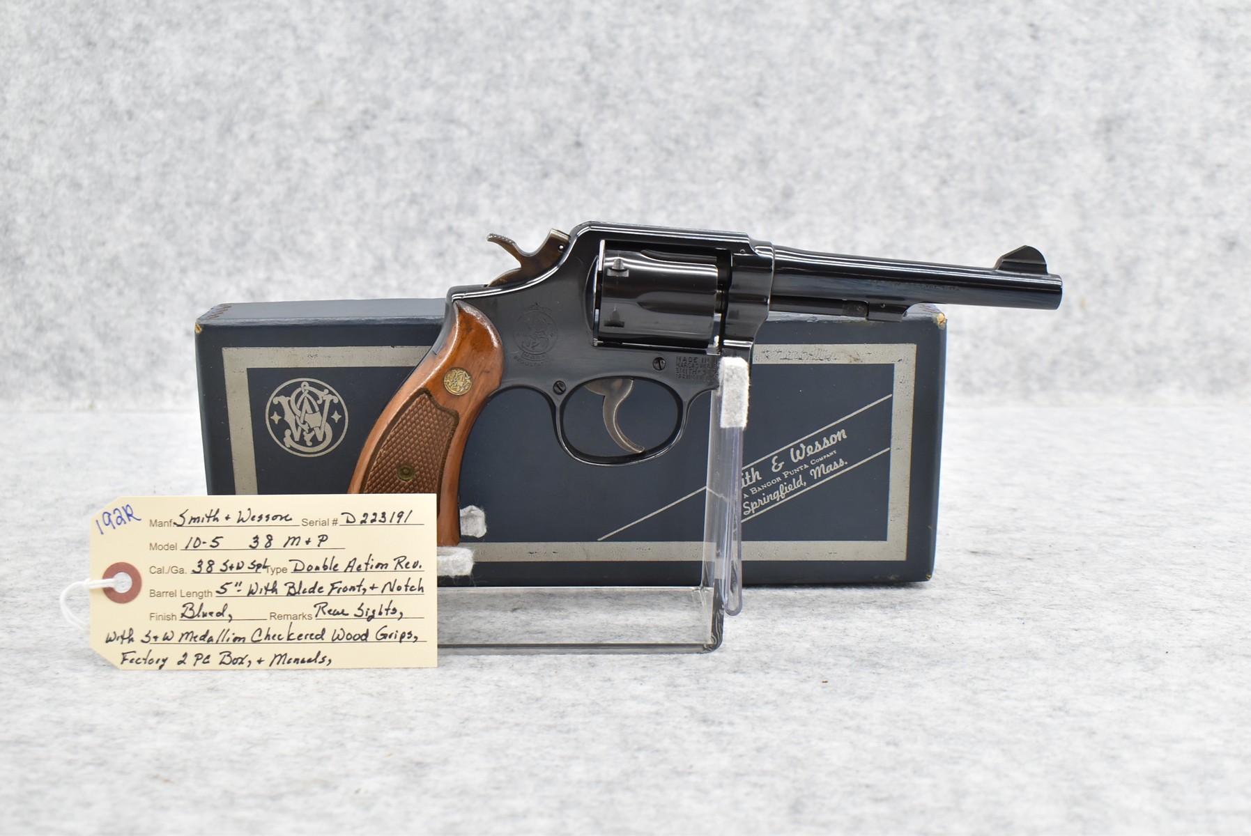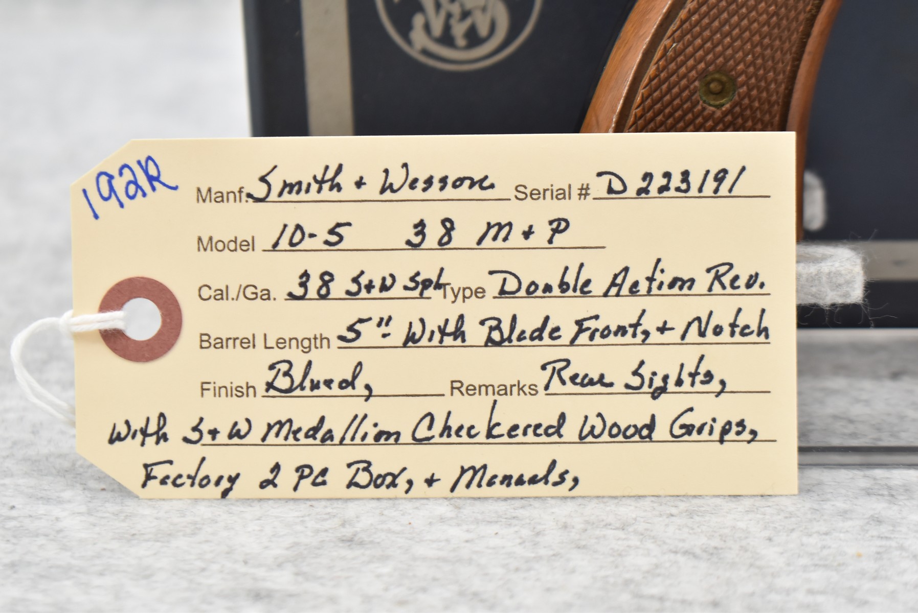 192R. Smith & Wesson – Mod. 10-5 (38 M&P) – 38 S&W Spl. Cal. Double Action Revolver – w/5” Barrel w/Blade Front & Notch Rear Sights – Blued Finish – w/S&W Medallion Checkered Wood Grips – w/Factory 2pc. Box & Manuals