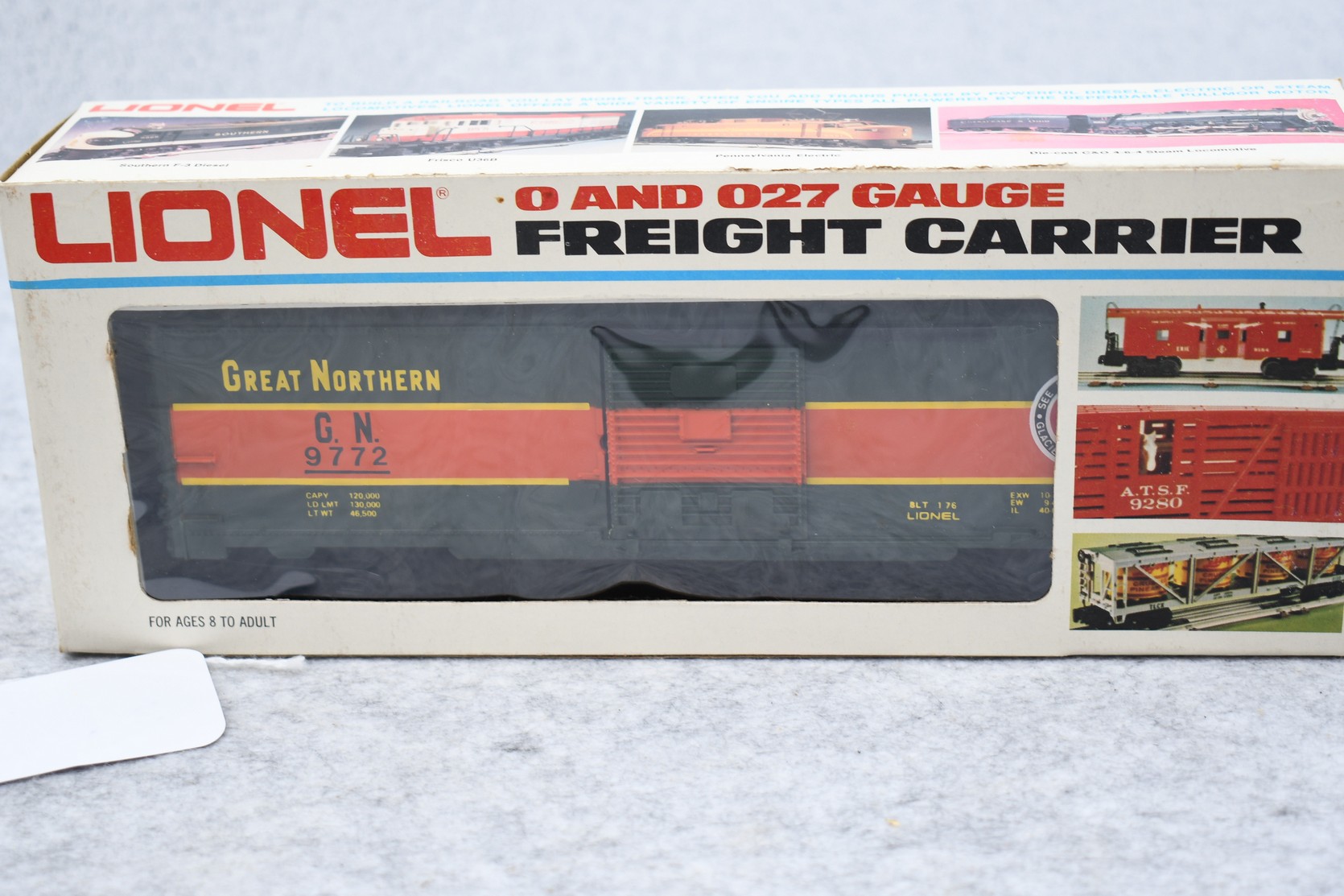 193. lot of 3 Lionel train cars including 6-9354 Pennzoil tank car, 6-9307 Animated Gondola, Great Northern boxcar, all in boxes