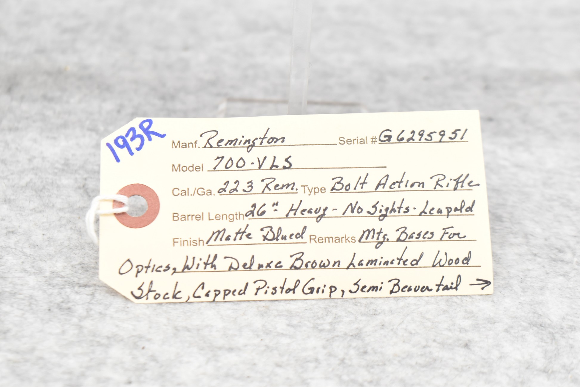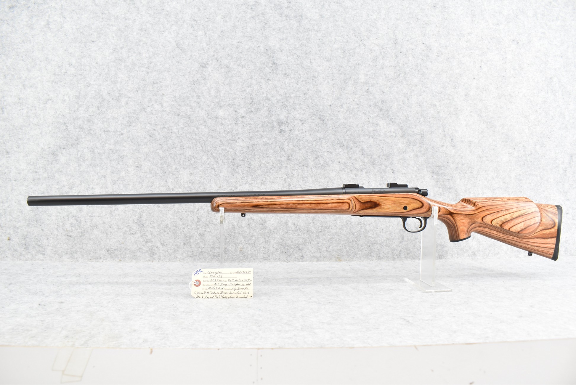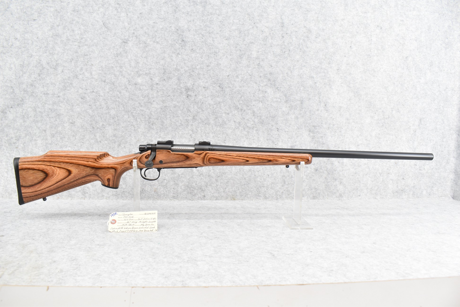 193R. Remington – Mod. 700-VLS – 223 Rem. Cal. Bolt Action Rifle – w/26” Heavy Barrel – Matte Blued Finish – w/Pistol Grip Capped Brown Laminated Wood Stock w/Factory Butt Pad – w/Leupold Bases