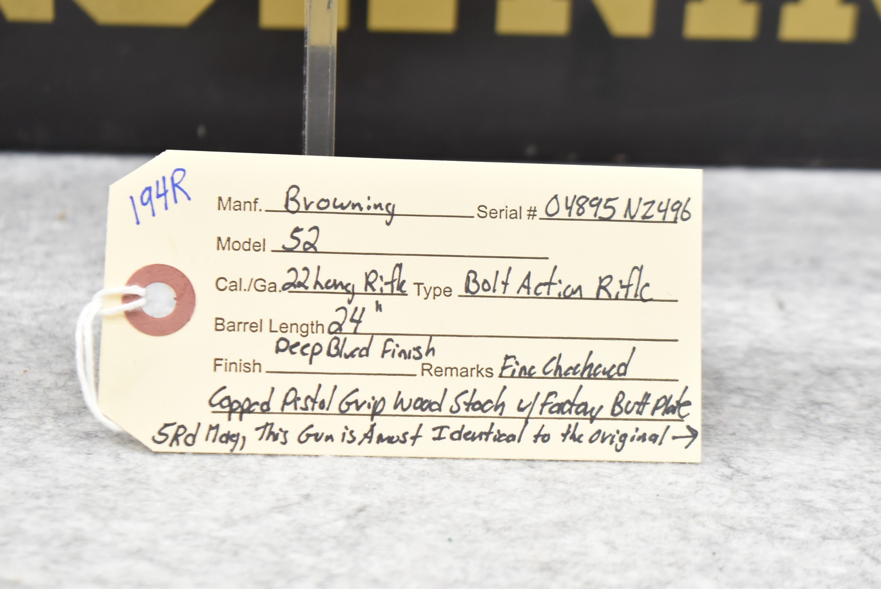194R. Browning – Mod. 52 – 22 Long Rifle Cal. Bolt Action Rifle – w/24” Barrel – Deep Blued Finish – w/Fine Checkered Capped Pistol Grip Wood Stock w/Factory Butt Plate – w/5Rd Mag – This Gun is Almost Identical to the Original Winchester 52C Sporter – Unfired w/Factory Box & Manuals – Only 5,000 Made Between 1991-1992
