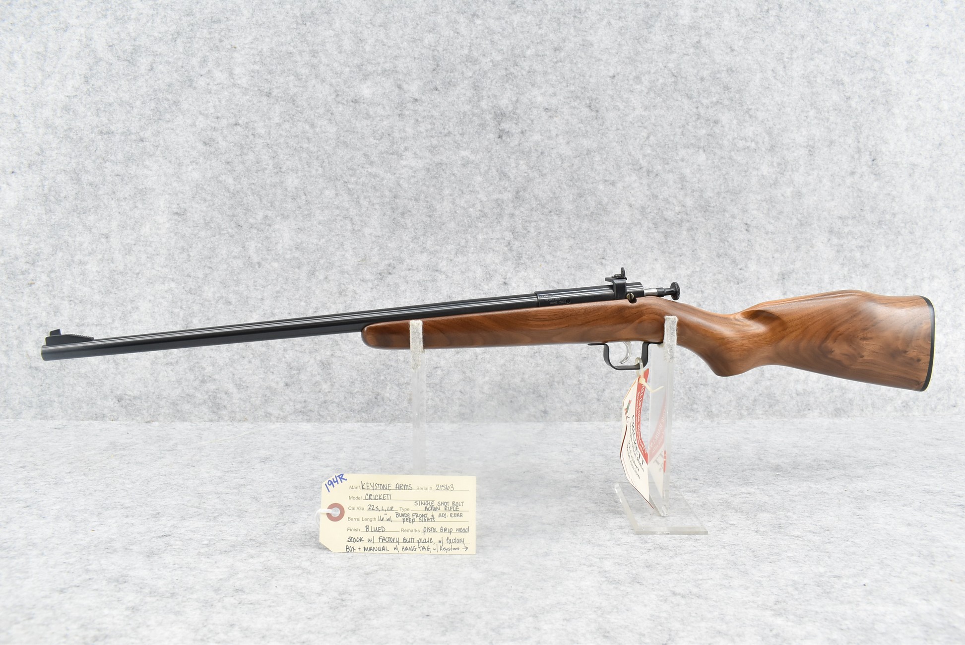 194R. Keystone Arms – Mod. Crickett – 22 Cal. Single Shot Bolt Action Rifle – w/16” Barrel w/Blade Front & Adj. Rear Peep Sights – Blued Finish – w/Pistol Grip Wood Stock w/Factory Butt Plate – w/Factory Box, Manual, Hang Tag & Plush Crickett Mascot in Original Box
