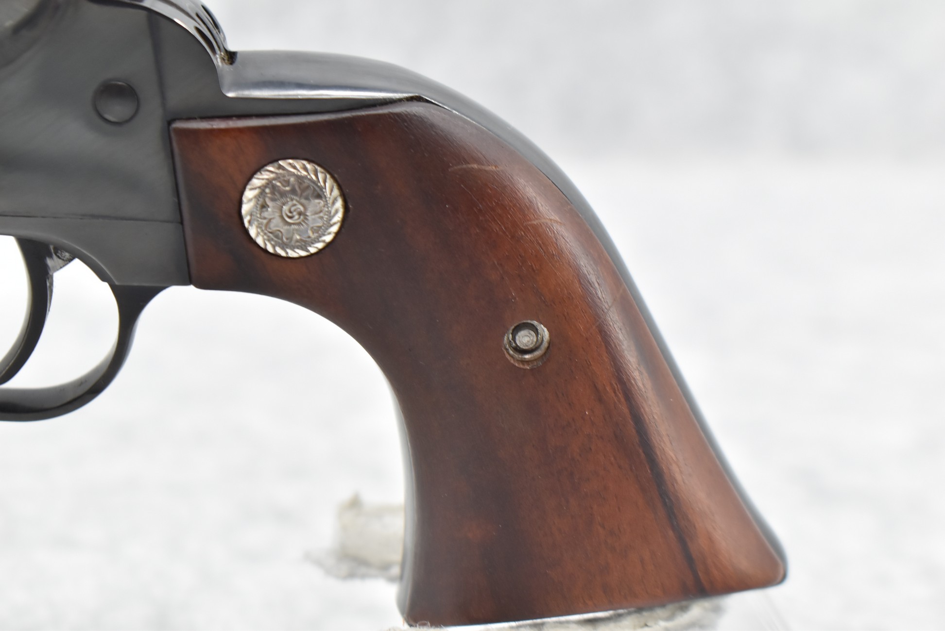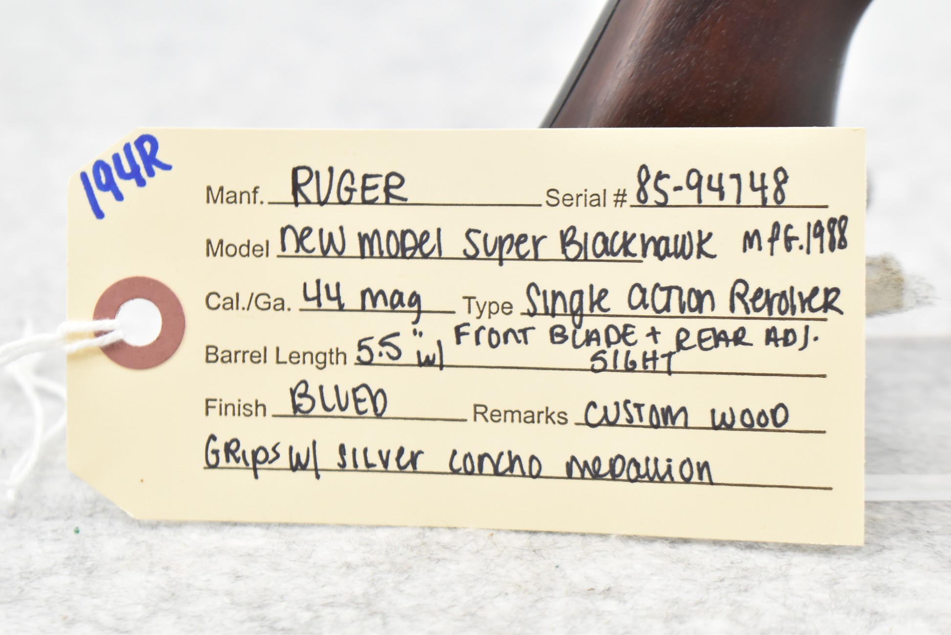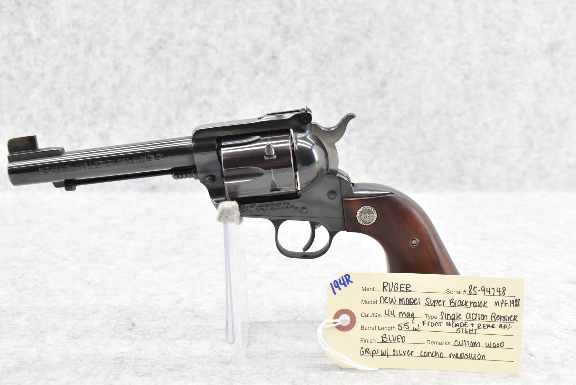 194R. Ruger – New Model Super Blackhawk – 44 Mag. Cal. Single Action Revolver – w/5.5” Barrel w/Front Blade & Rear Adj. Sights – Blued Finish – w/Custom Wood Grips w/Silver Concho Medallion – Mfg. 1988