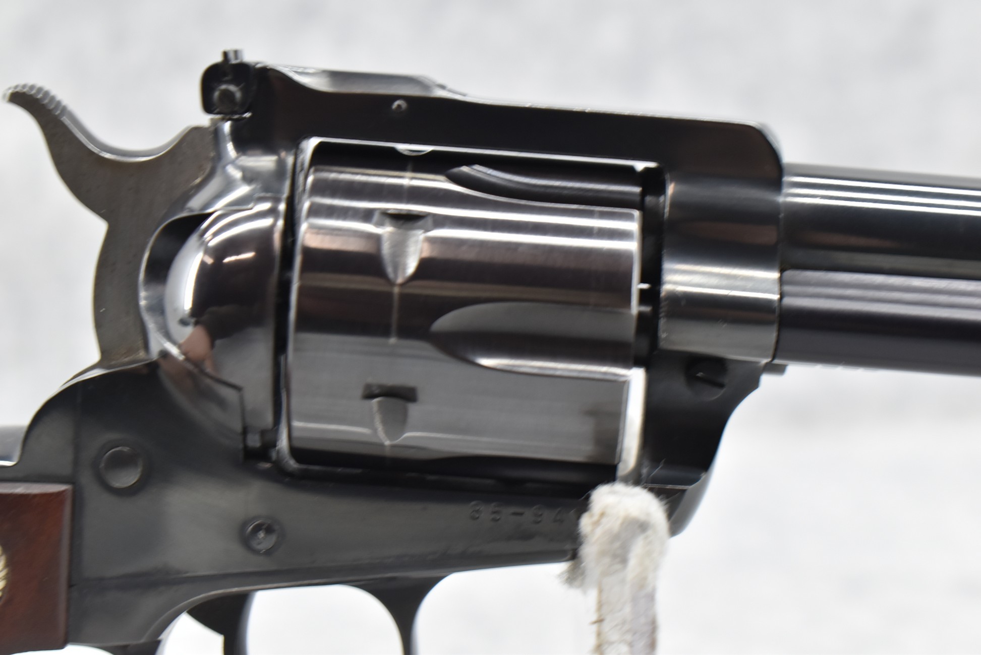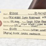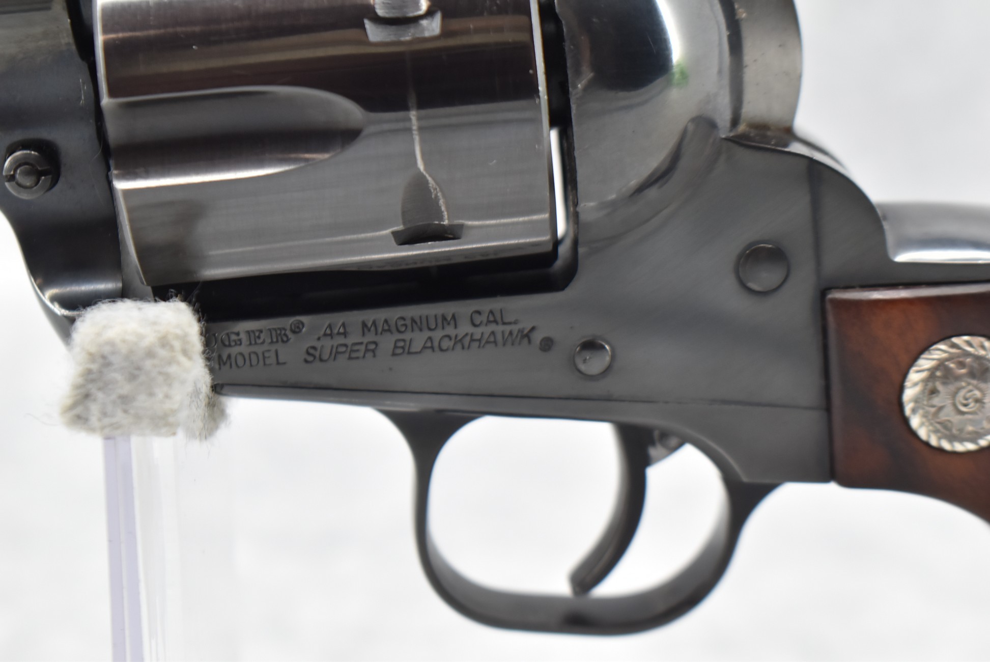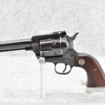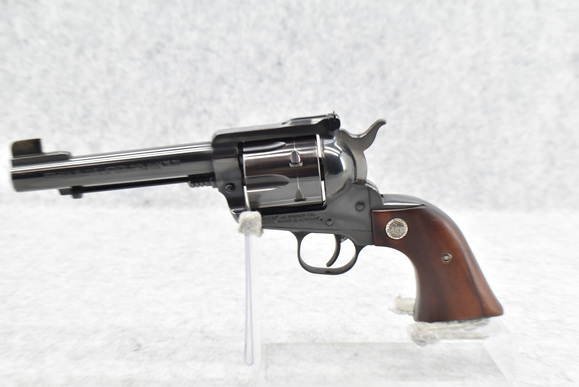 194R. Ruger – New Model Super Blackhawk – 44 Mag. Cal. Single Action Revolver – w/5.5” Barrel w/Front Blade & Rear Adj. Sights – Blued Finish – w/Custom Wood Grips w/Silver Concho Medallion – Mfg. 1988