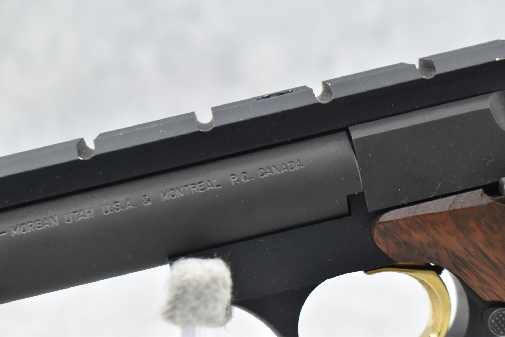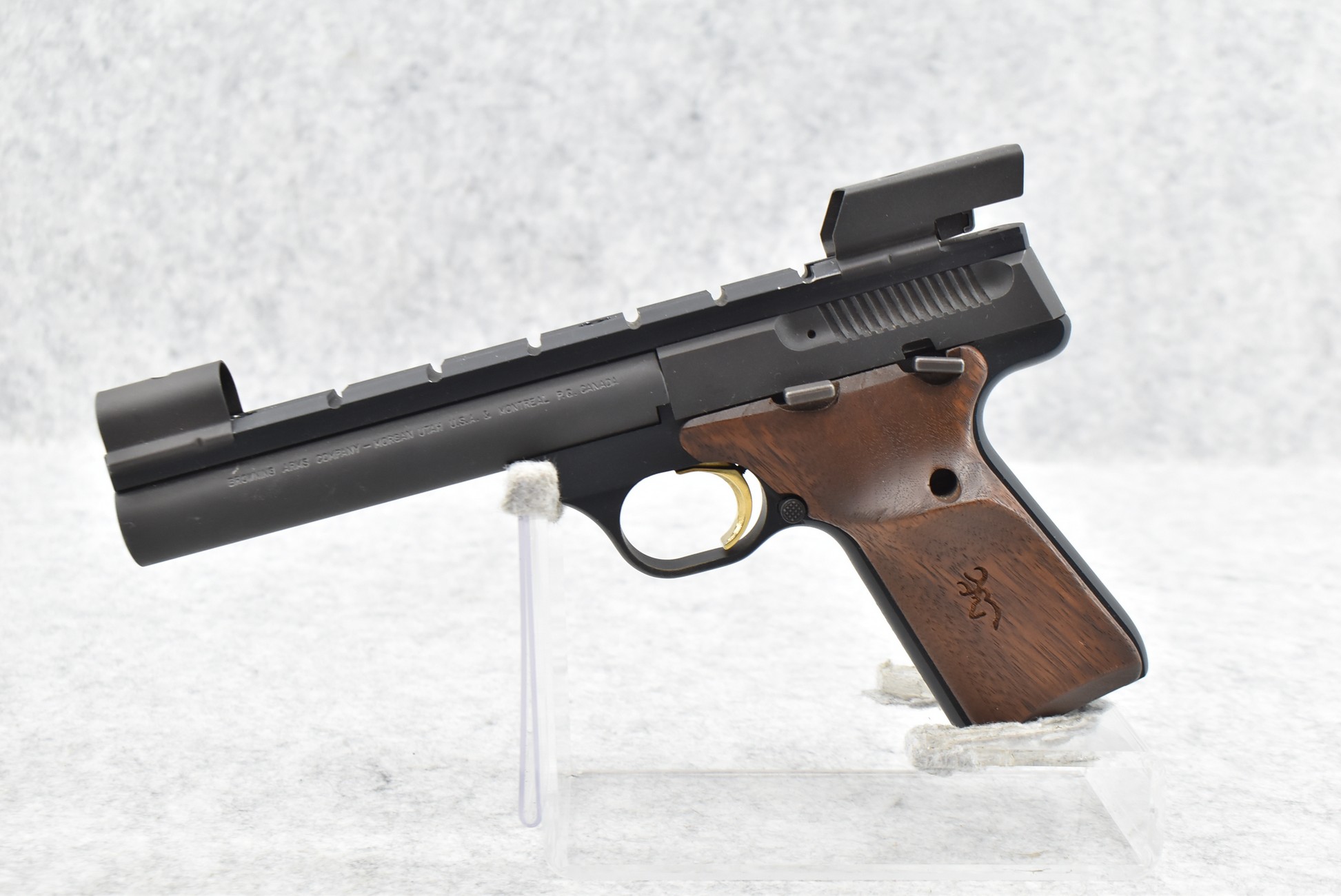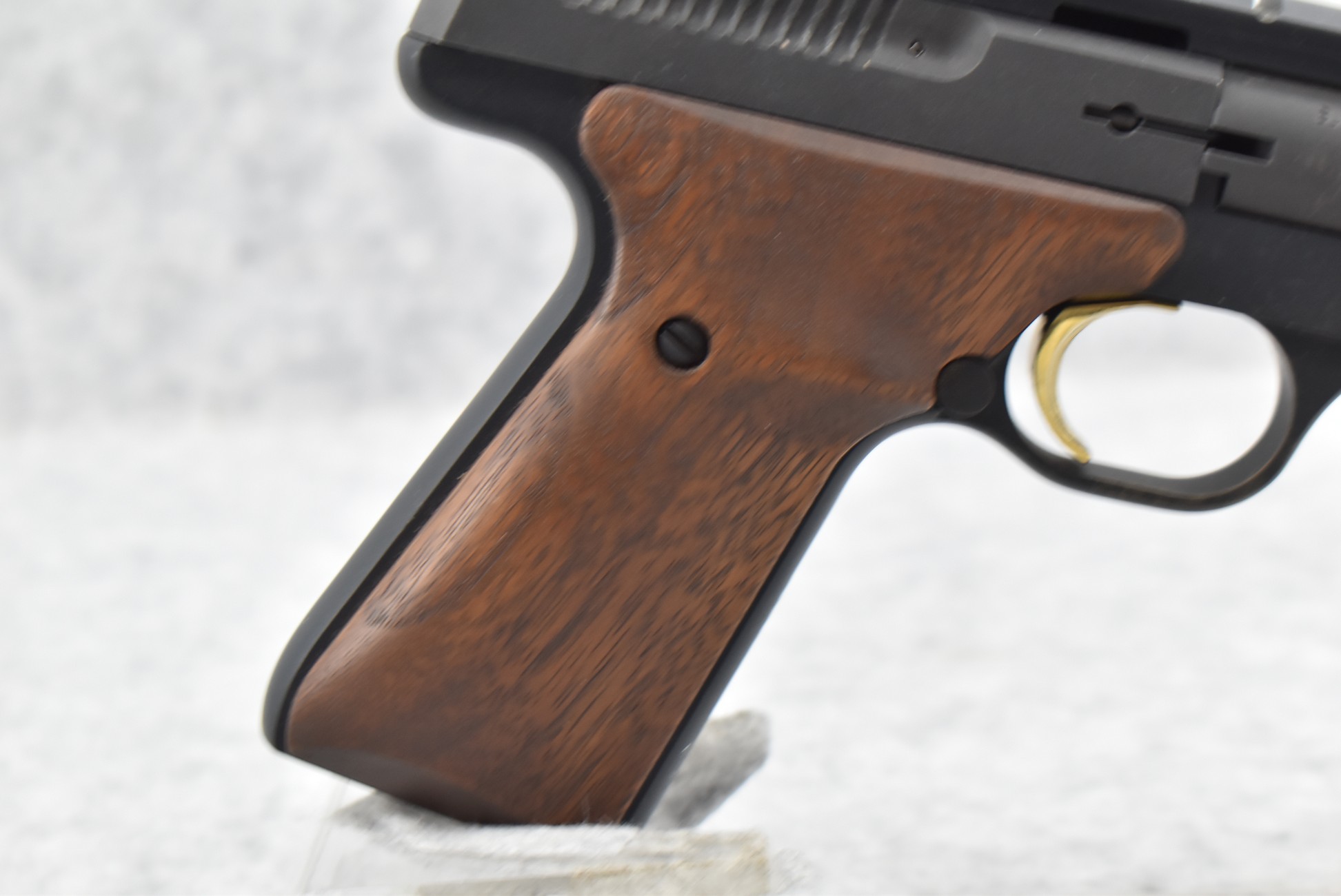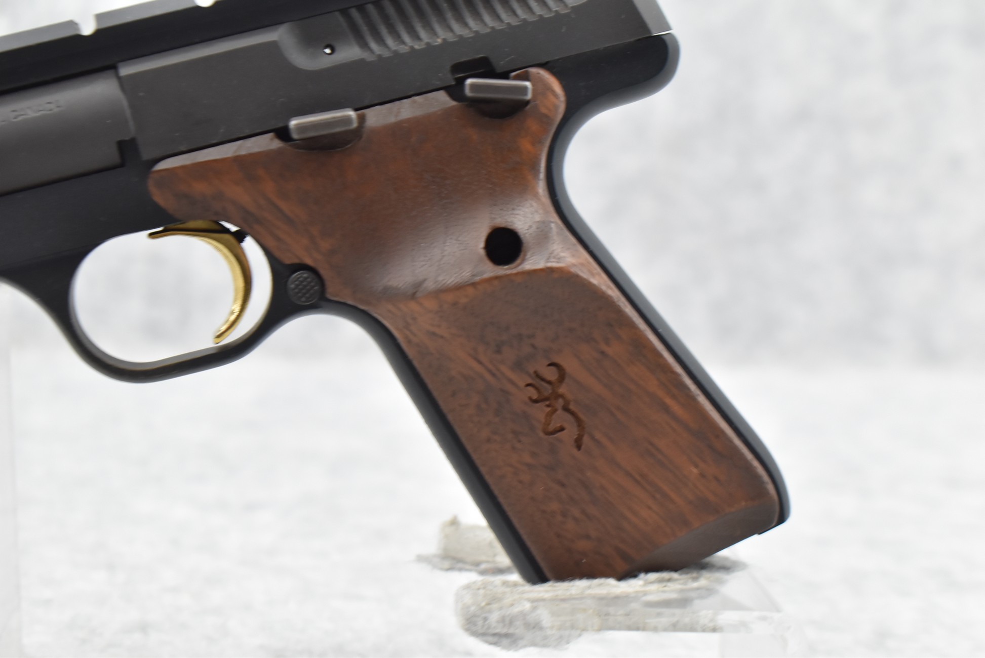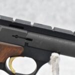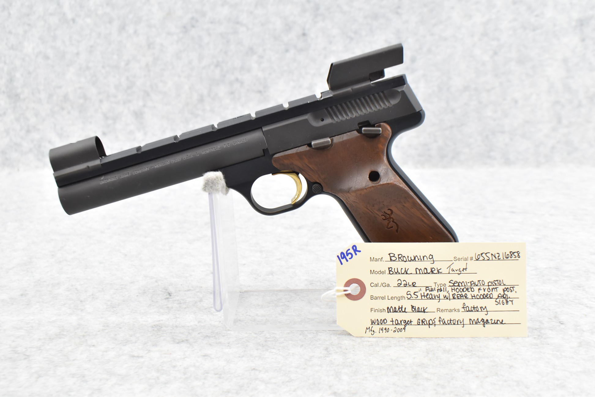 195R. Browning – Mod. Buckmark Target – 22LR Cal. Semi-Auto Pistol – w/5.5” Heavy Barrel w/Full Mount Rail w/Hooded Front Post & Rear Hooded Adj. Sights – Matte Black Finish – w/Factory Wood Target Grips – w/Factory Magazine