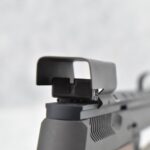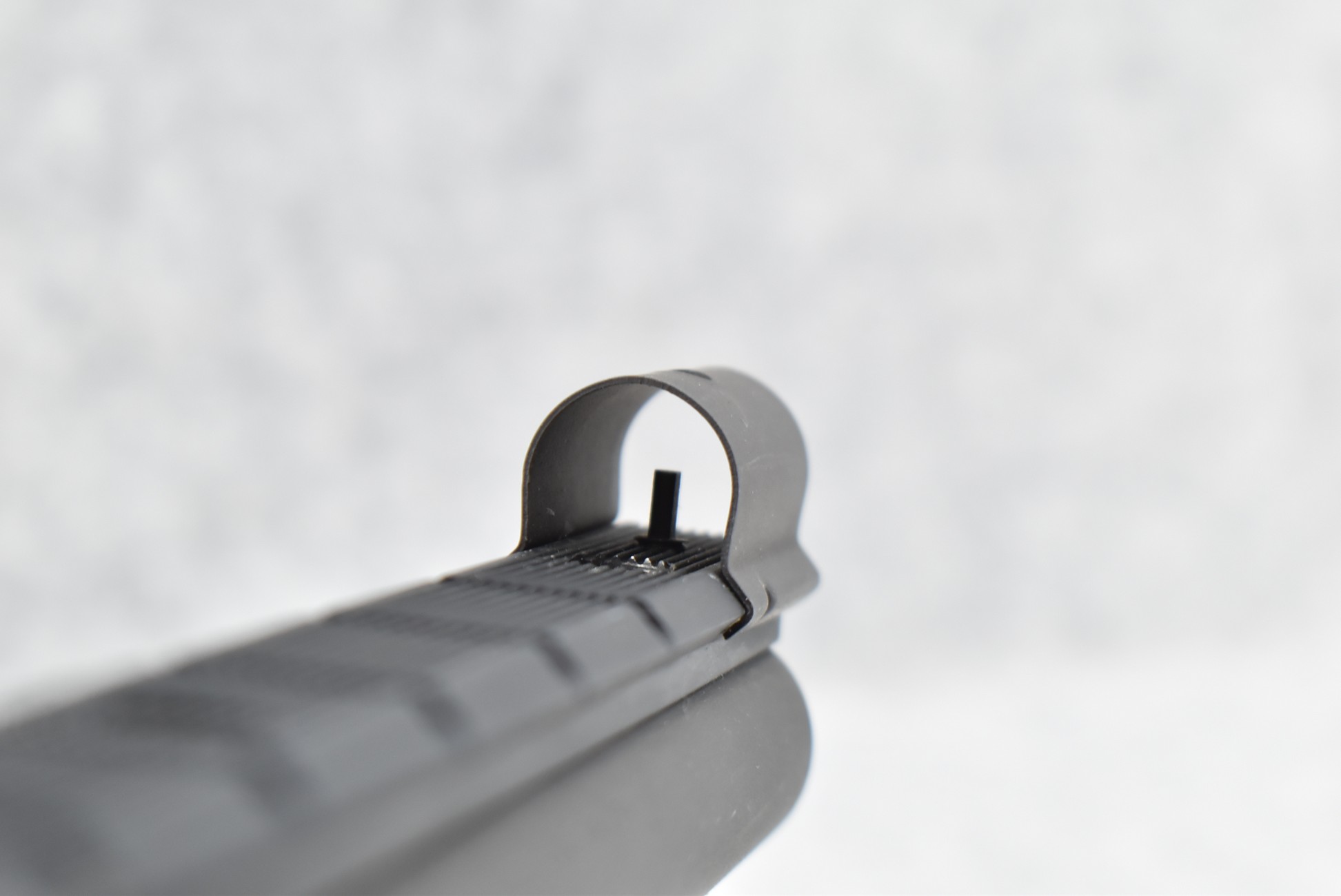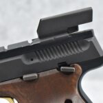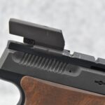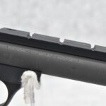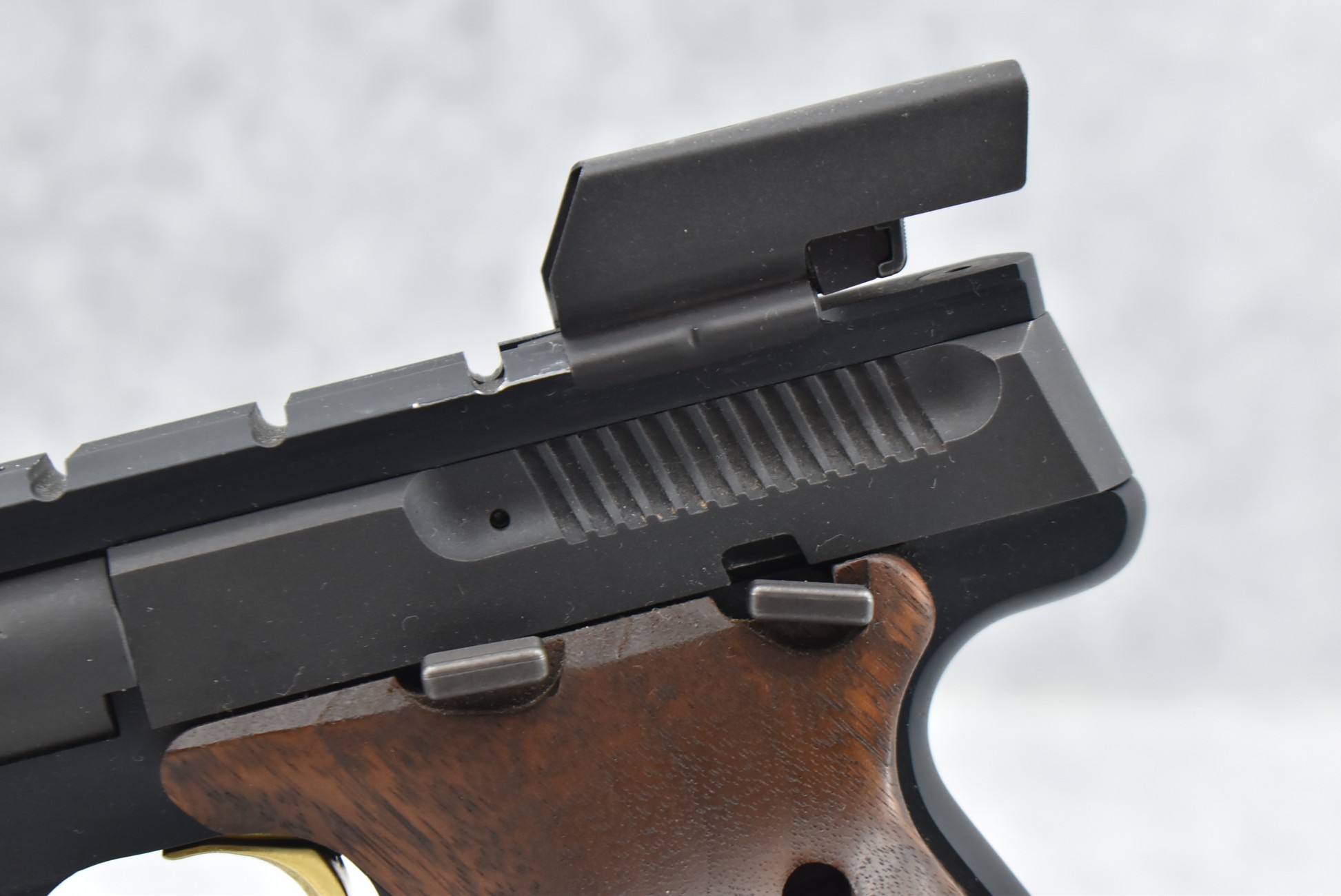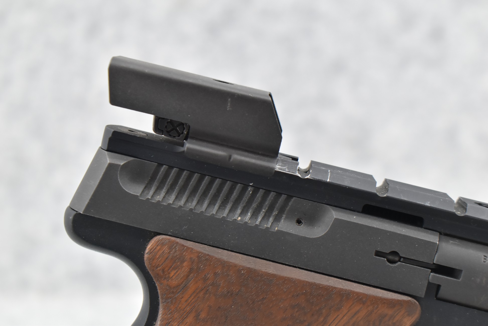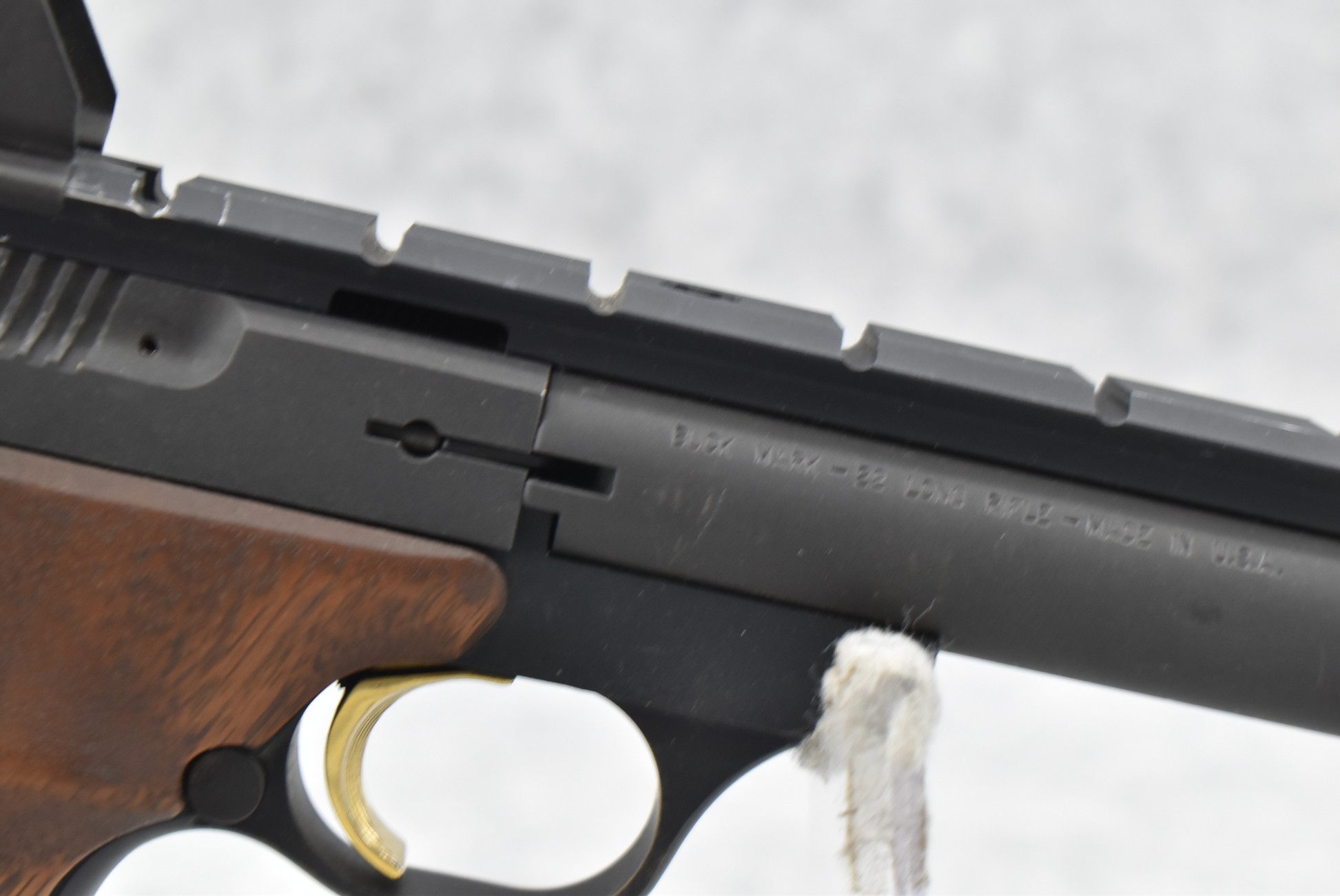 195R. Browning – Mod. Buckmark Target – 22LR Cal. Semi-Auto Pistol – w/5.5” Heavy Barrel w/Full Mount Rail w/Hooded Front Post & Rear Hooded Adj. Sights – Matte Black Finish – w/Factory Wood Target Grips – w/Factory Magazine
