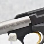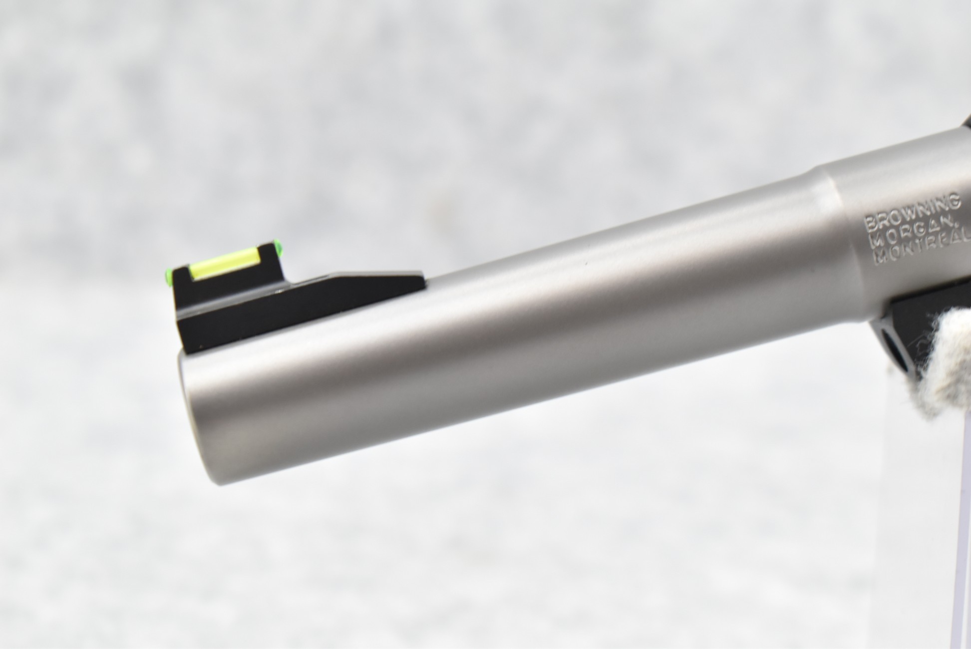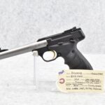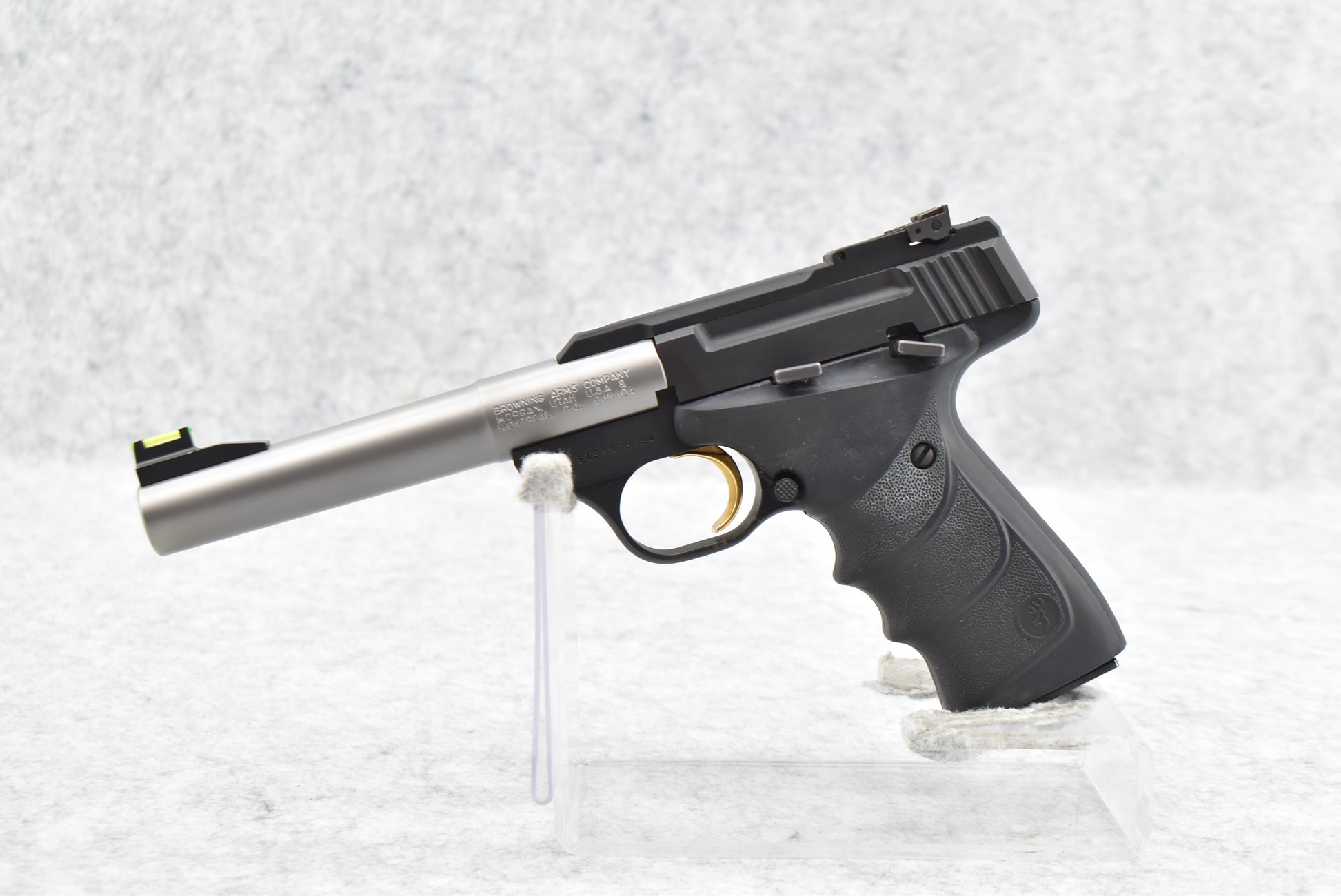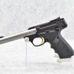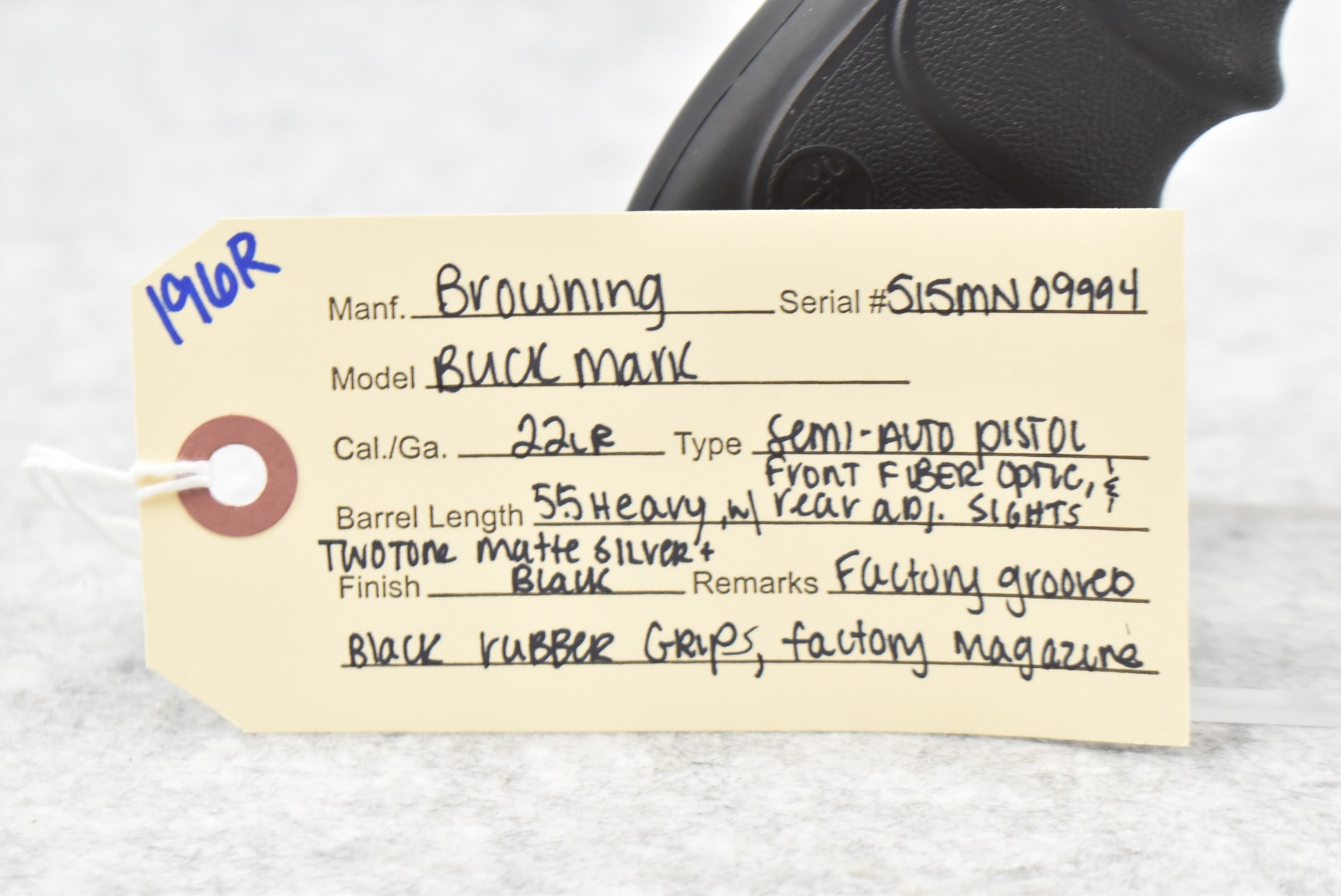 196R. Browning – Mod. Buckmark – 22LR Cal. Semi-Auto Pistol – w/5.5” Heavy Barrel w/Front Fiber Optic & Rear Adj. Sights – Matte Silver & Black Two-Tone Finish – w/Factory Grooved Black Rubber Grips – w/Factory Magazine
