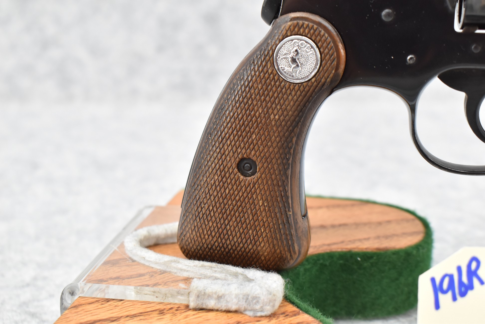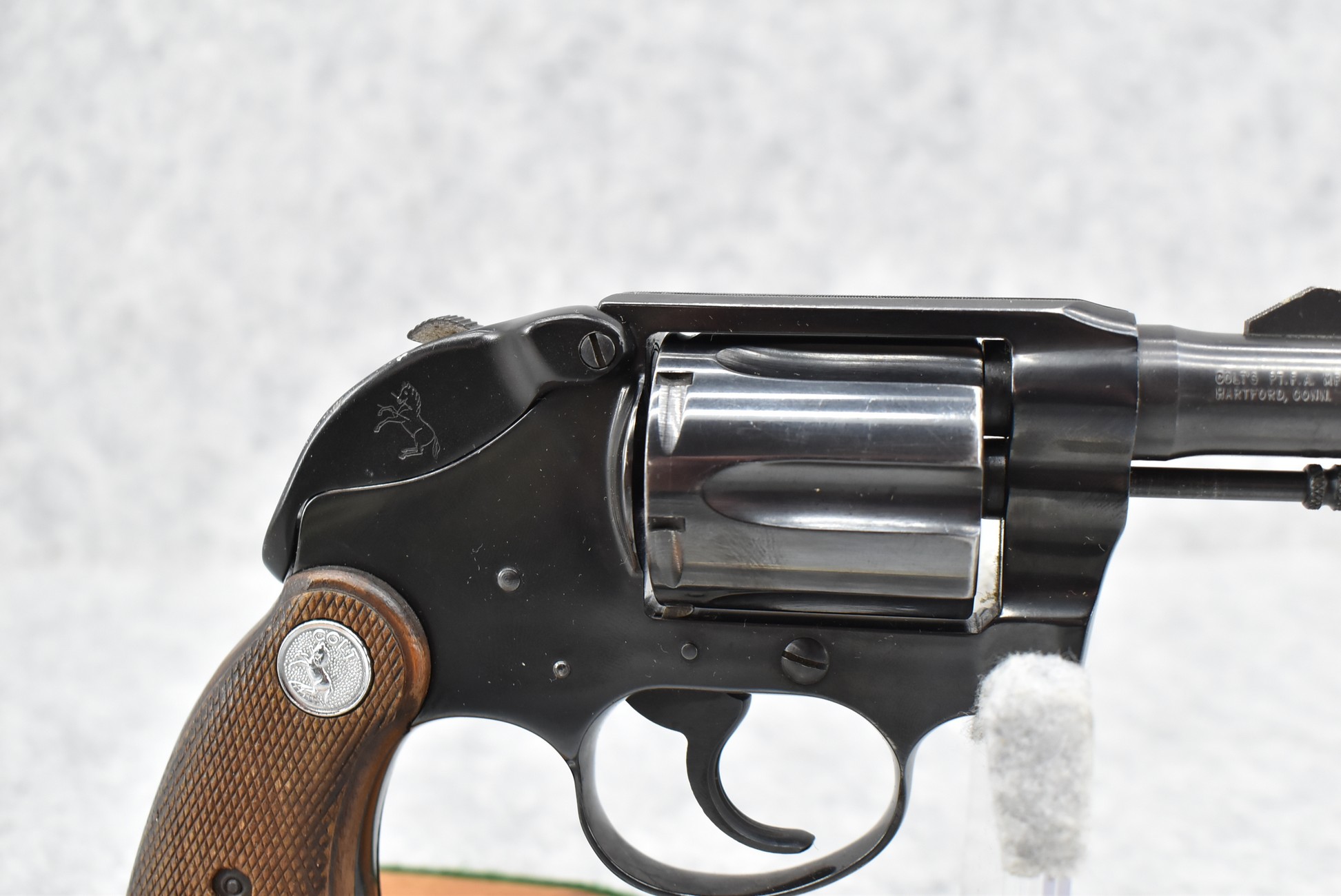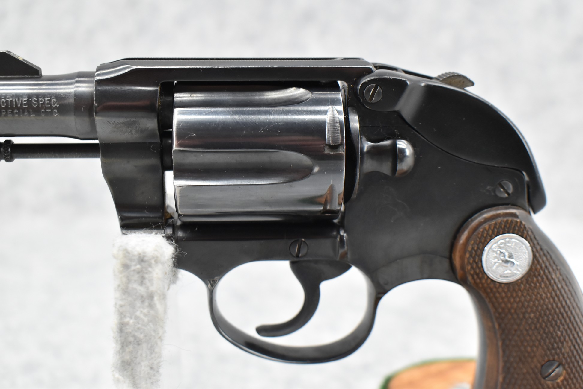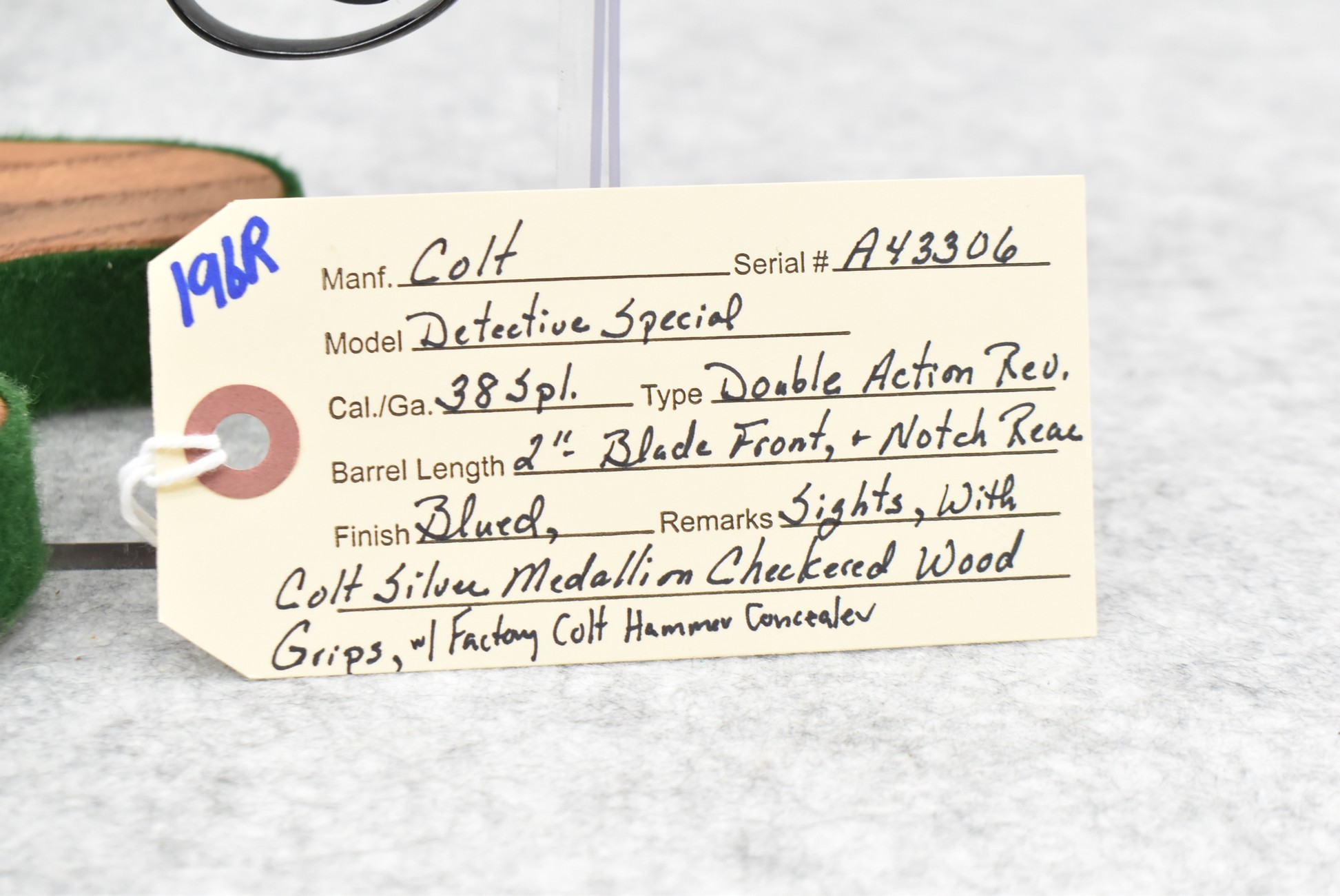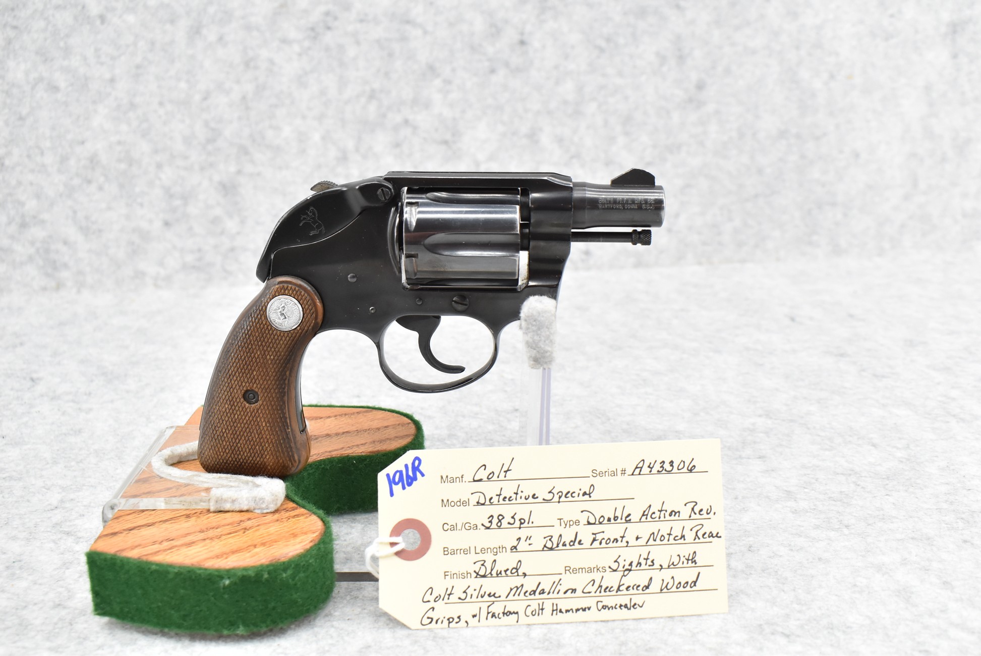 196R. Colt – Mod. Detective Special – 38 Spl. Cal. Double Action Revolver – w/2” Barrel w/Blade Front & Notch Rear Sights – Blued Finish – w/Colt Silver Medallion Checkered Wood Grips – w/Factory Colt Hammer Conceal Adapter