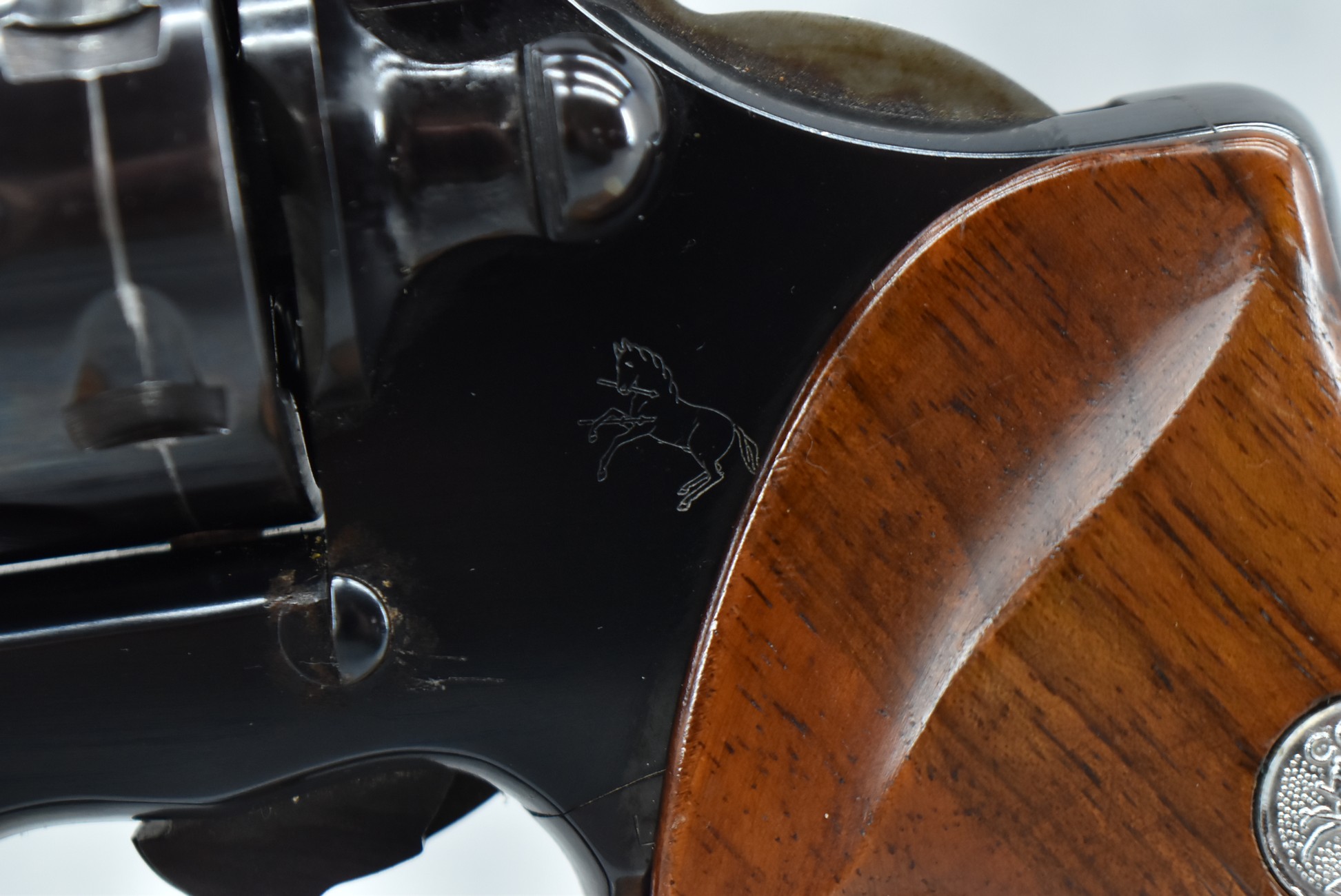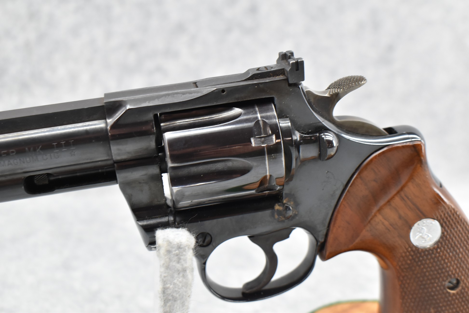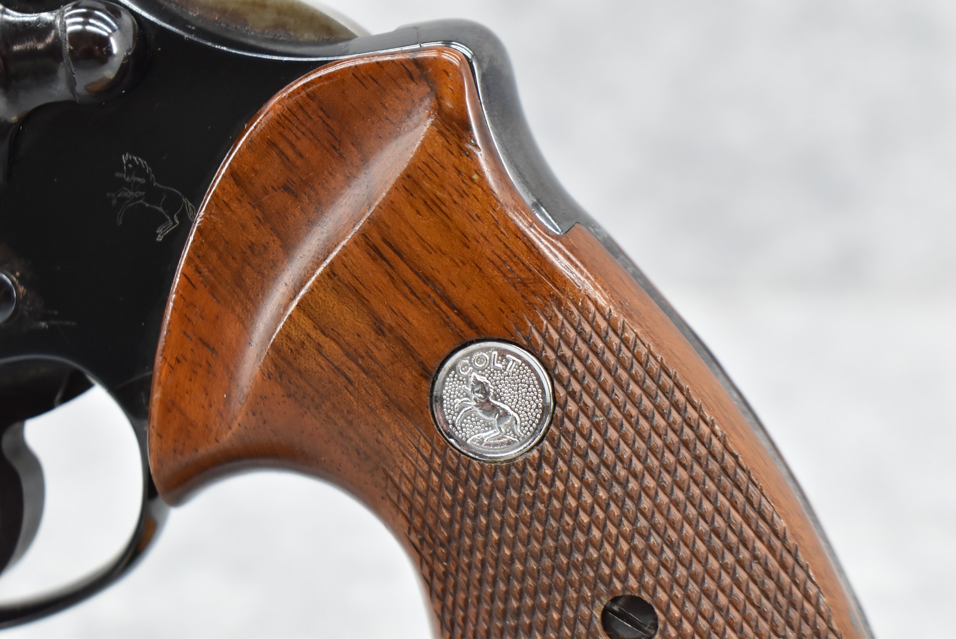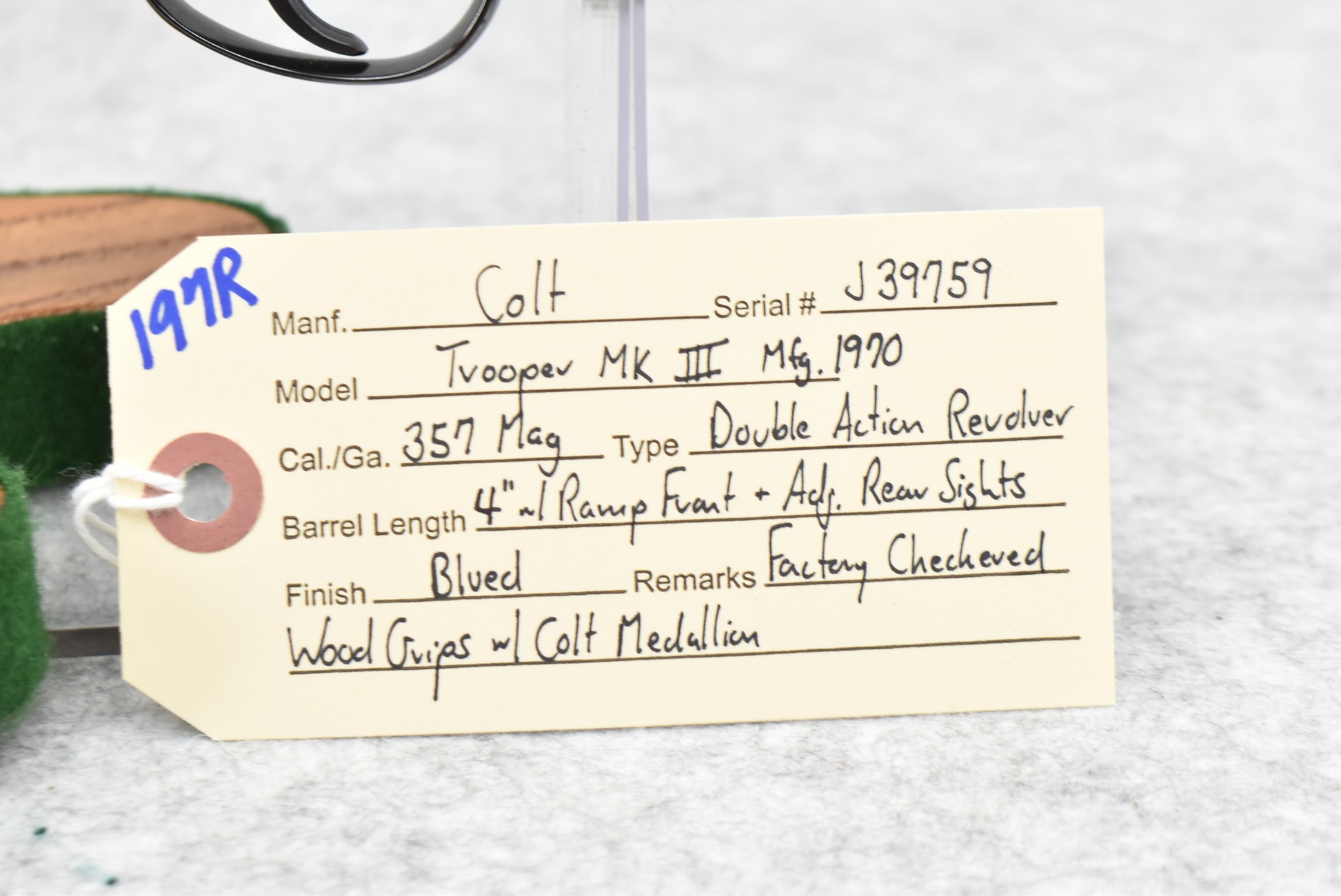 197R. Colt – Mod. Trooper MK III – 357 Mag. Cal. Double Action Revolver – w/4” Barrel w/Ramp Front & Adj. Rear Sights – Blued Finish – w/Factory Checkered Wood Grips w/Colt Medallion – Mfg. 1970