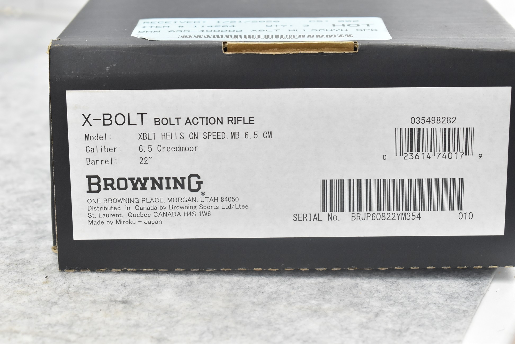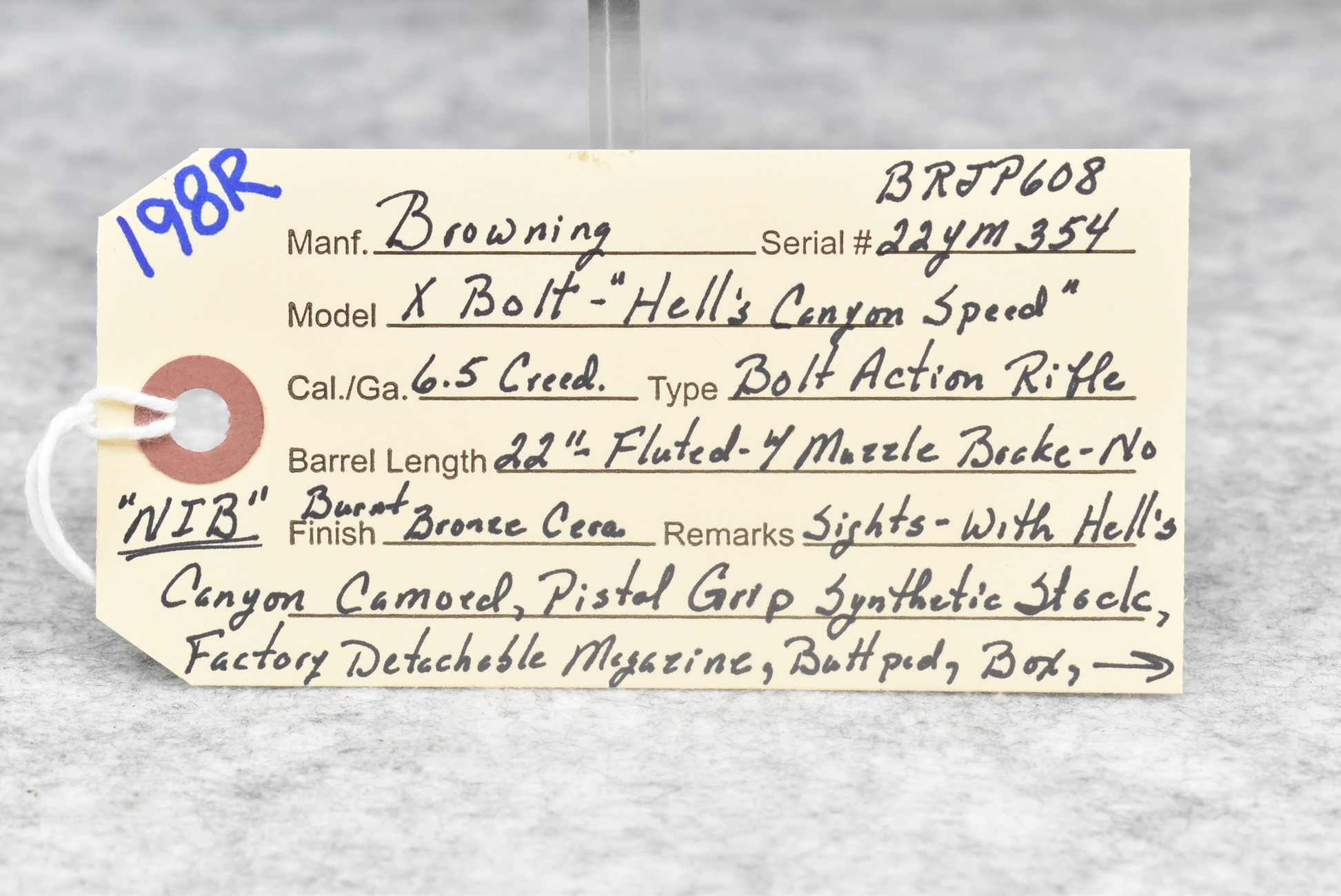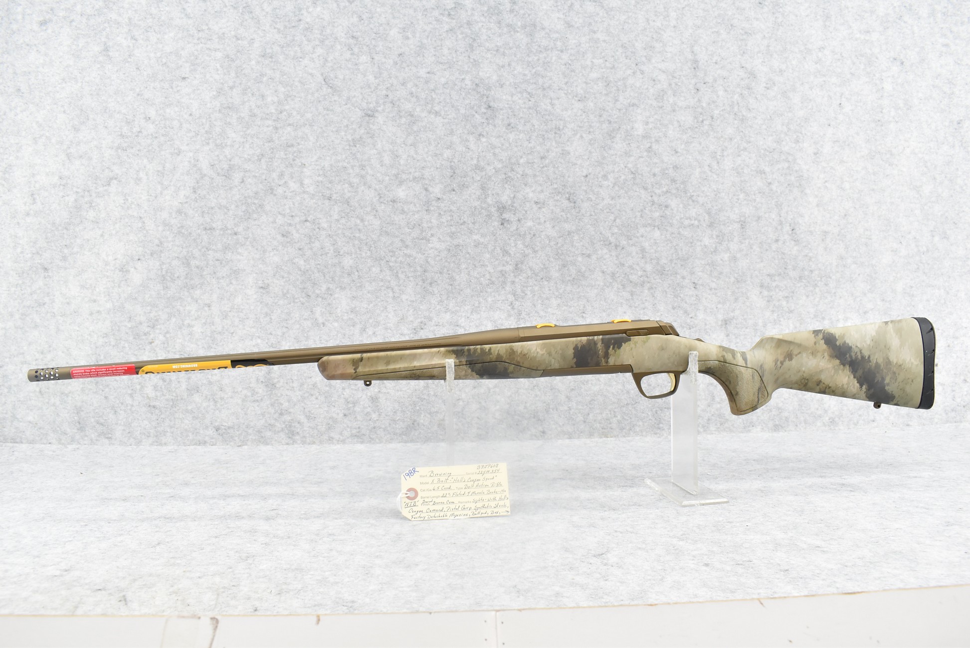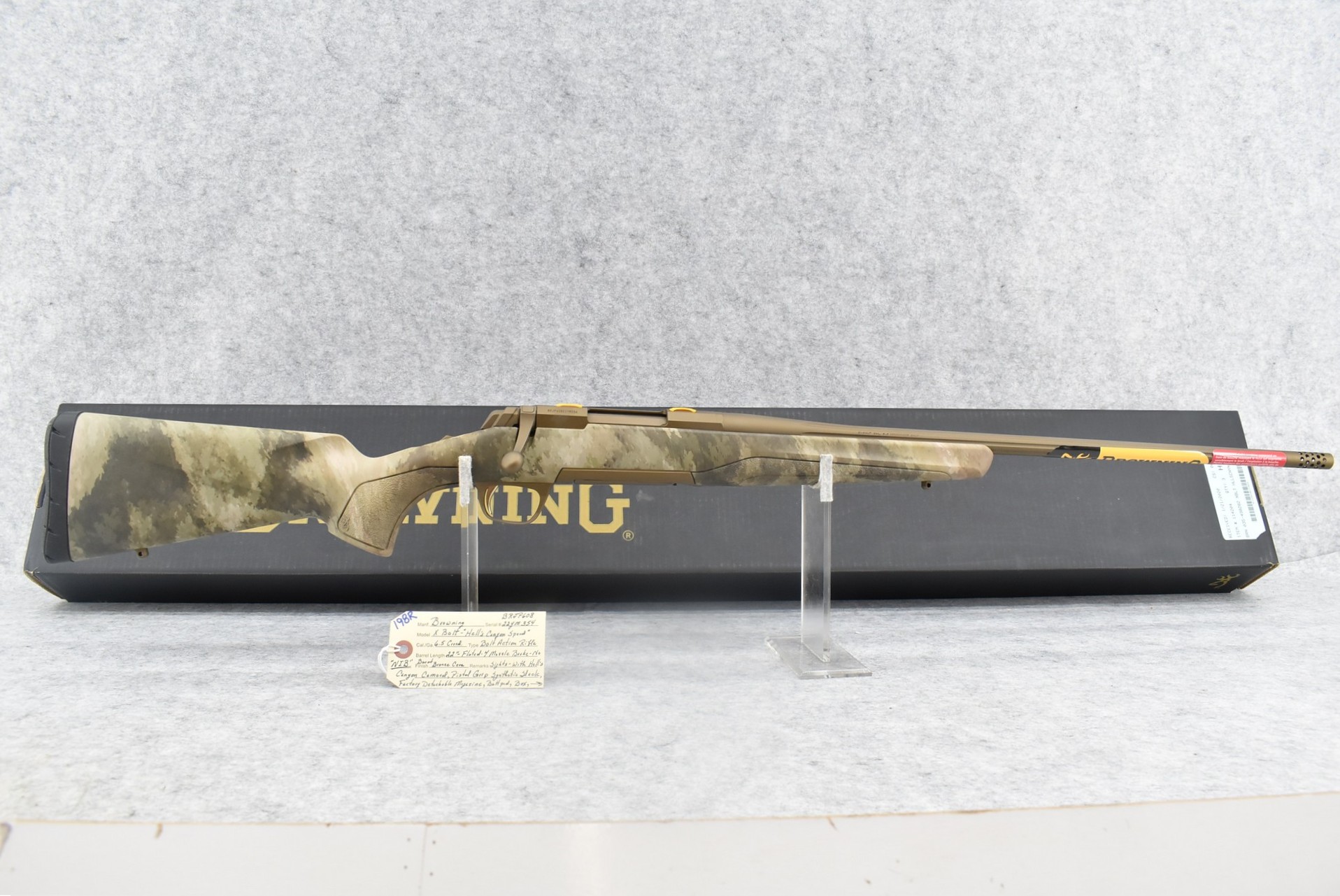 198R. Browning – Mod. X Bolt – Hell’s Canyon Special – 6.5 Creedmoor Cal. Bolt Action Rifle – w/22” Fluted Barrel w/Muzzle Brake – Burnt Bronze Cerakote Finish – w/Hell’s Canyon Camoed Pistol Grip Synthetic Stock w/Factory Butt Pad – w/Factory Detachable Magazine – New w/Factory Box, Manual & Accessories