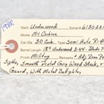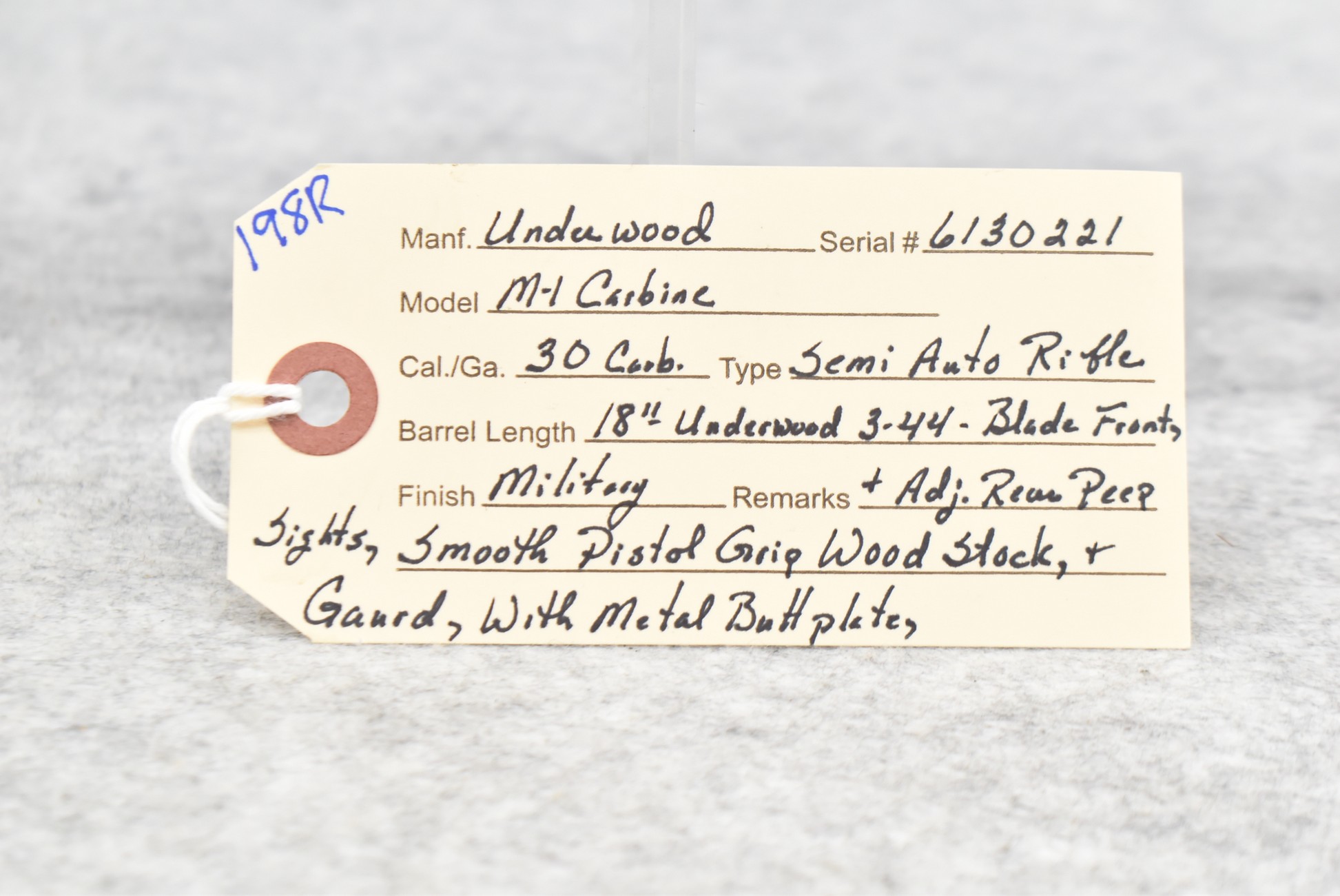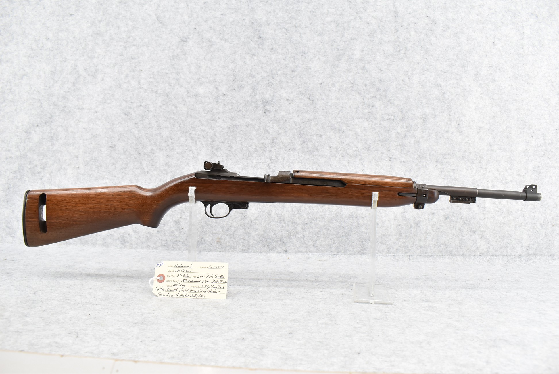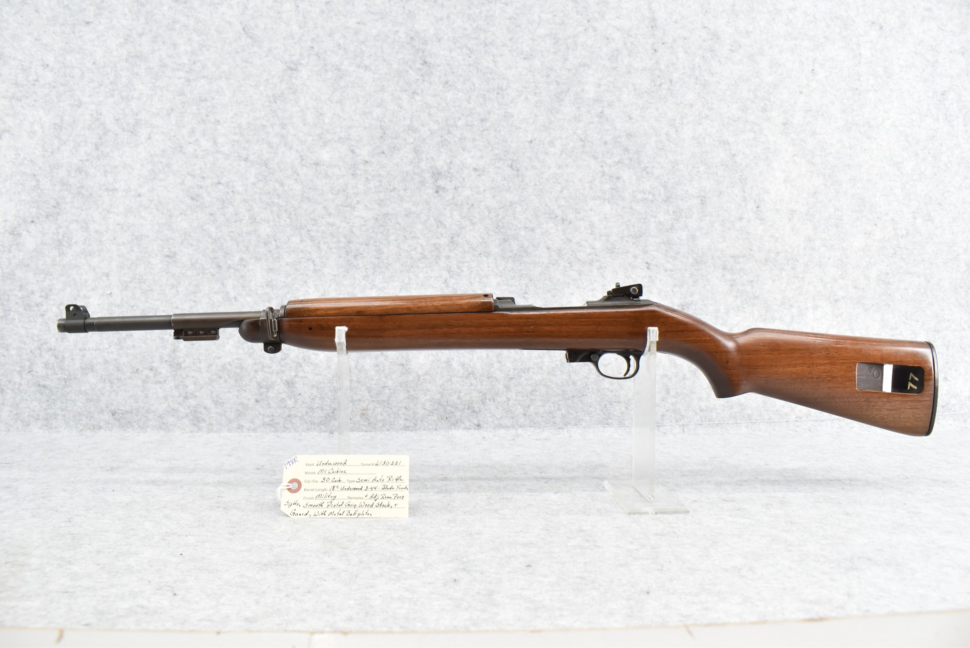 198R. Underwood – Mod. M1 Carbine – 30 Carbine Cal. Semi-Auto Rifle – w/18” Underwood 3-44 Dated Barrel w/Blade Front & Adj. Rear Peep Sights – Military Finish – w/Smooth Pistol Grip Wood Stocks w/Metal Butt Plate