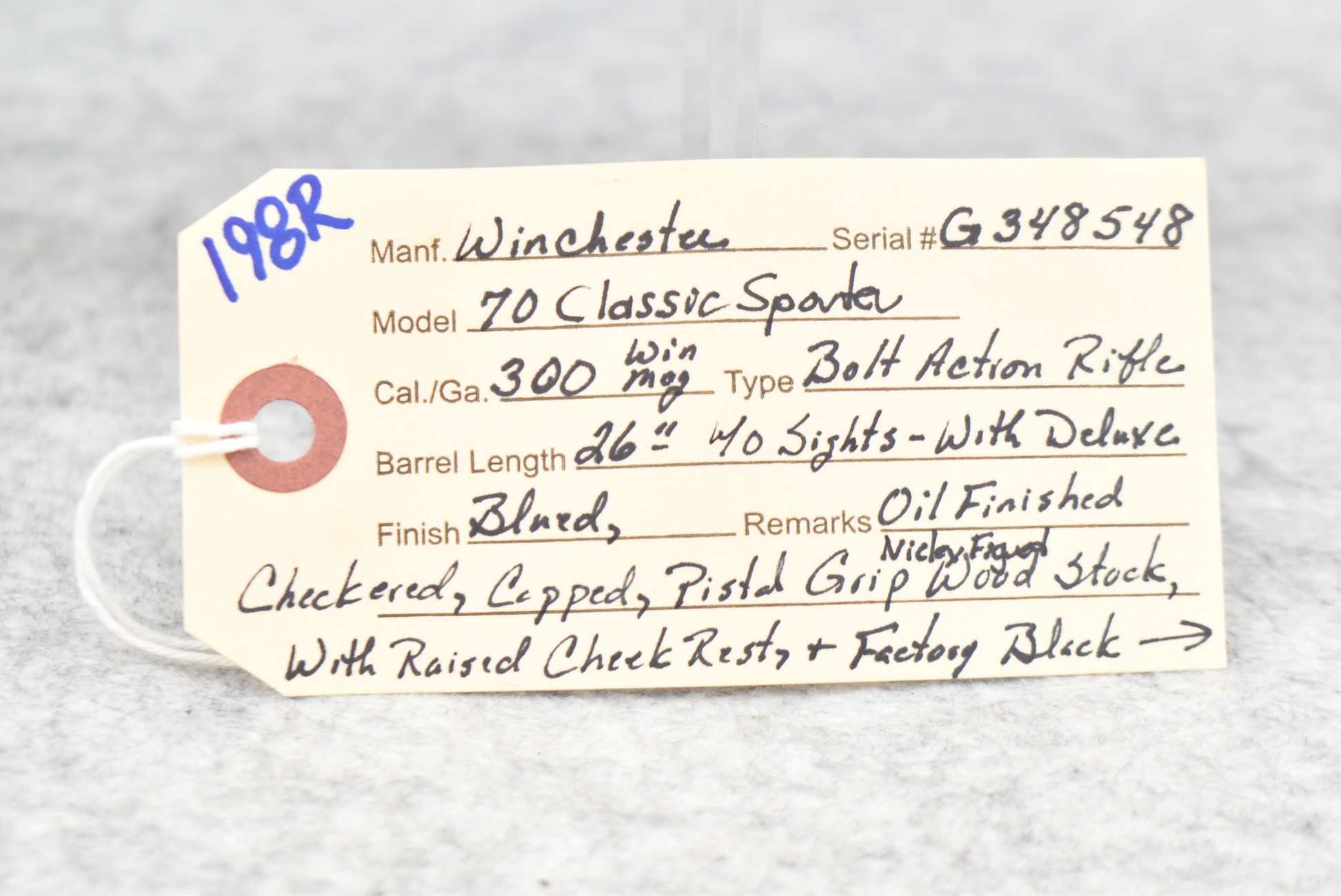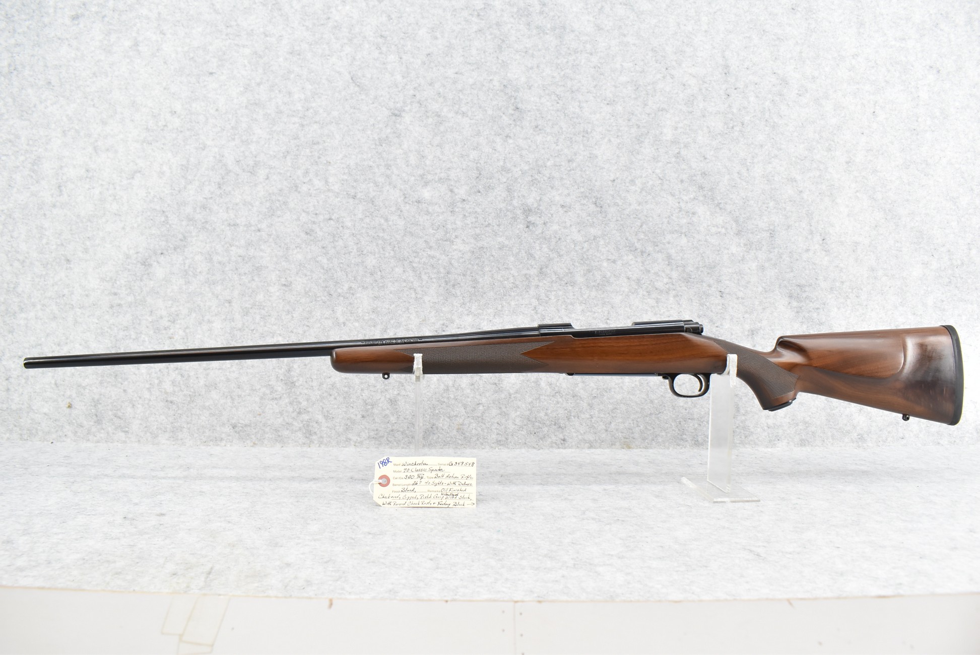 198R. Winchester – Mod. 70 Classic Sporter – 300 Win. Mag. Cal. Bolt Action Rifle – w/26” Barrel – Blued Finish – w/Deluxe Oil Finished Checkered Capped Pistol Grip Nicely Figured Wood Stock w/Raised Cheek Piece w/Factory Butt Pad