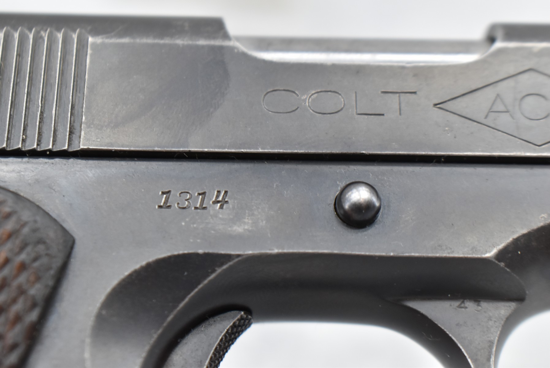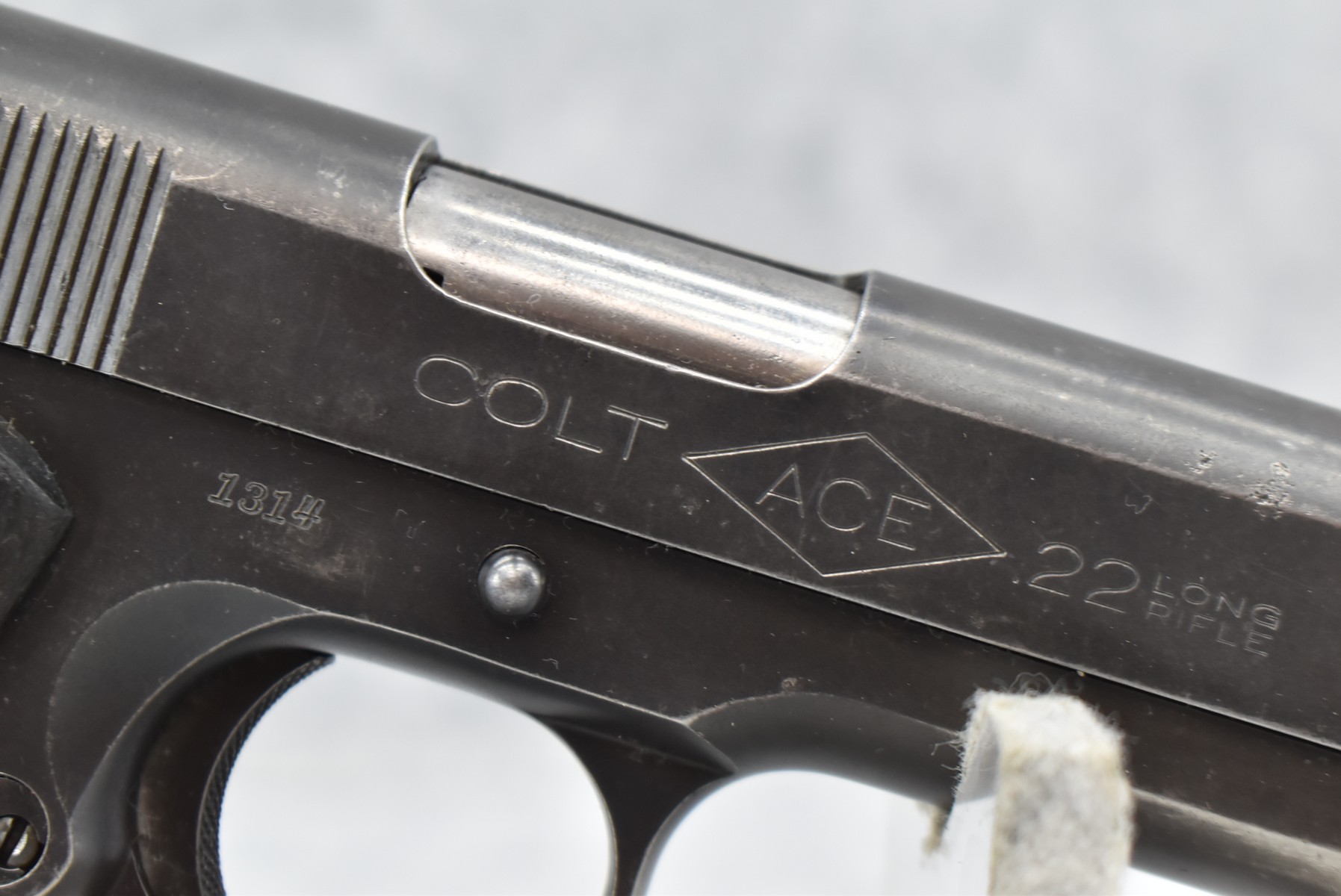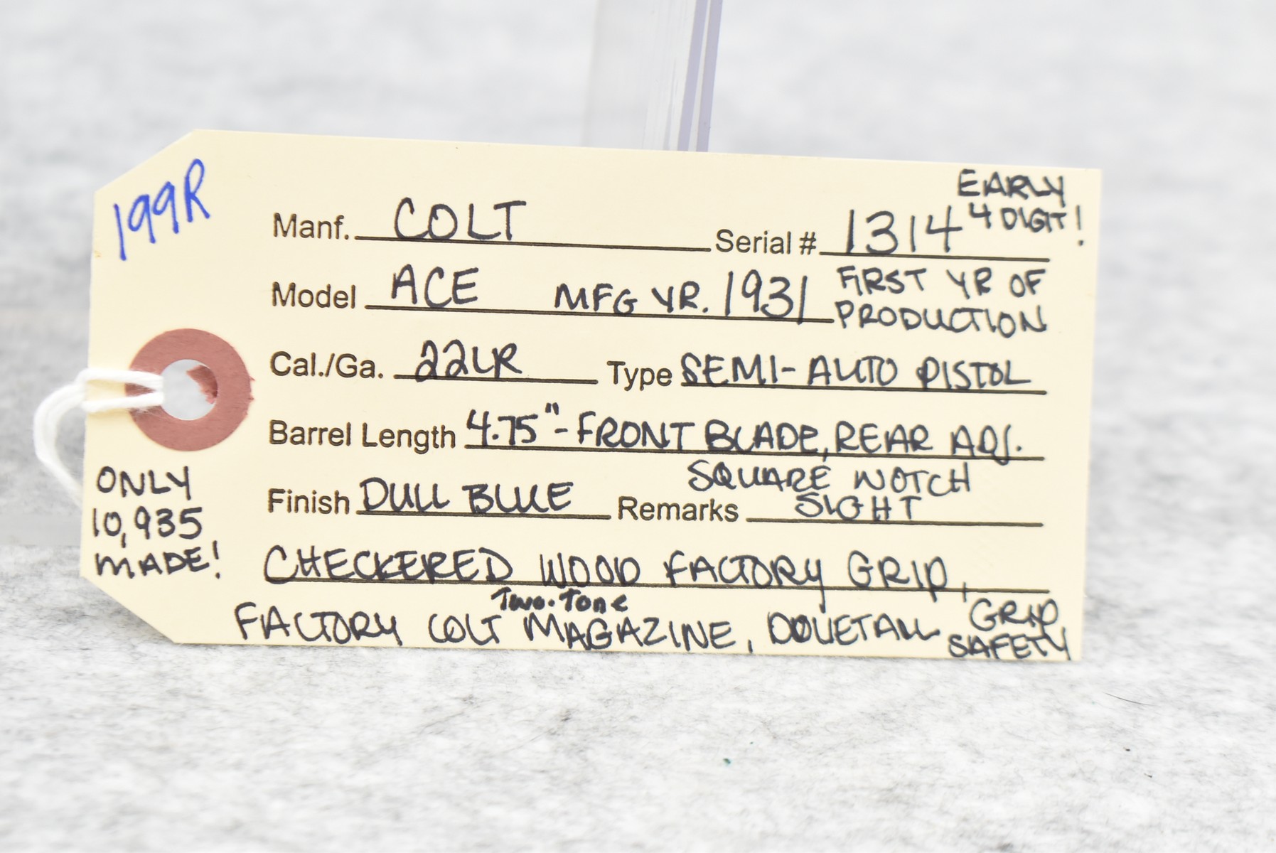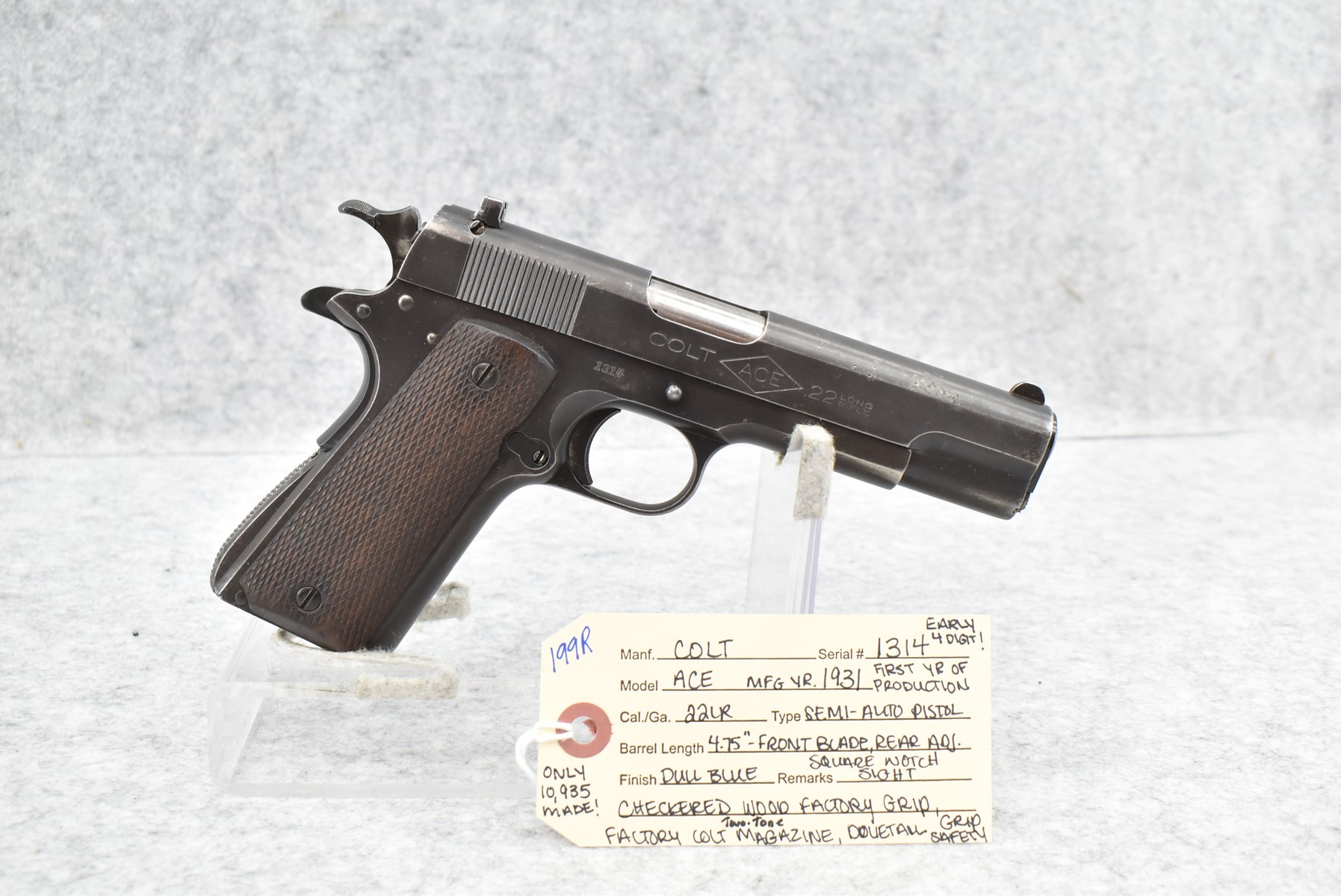 199R. Colt – Mod. ACE – 22LR Cal. Semi-Auto Pistol – w/4.75” Barrel w/Front Blade & Rear Adj. Square Notch Sight – Blued Finish – w/Checkered Wood Factory Grip – w/Factory Colt Two-Tone Magazine – w/Dovetail Grip Safety – Early 4 Digit Serial #1314, Mfg. 1931 First Year of Production – Only 10,935 Made!