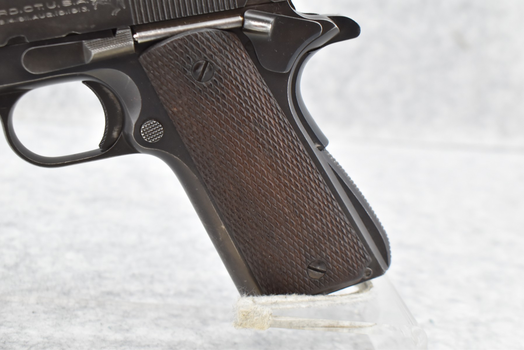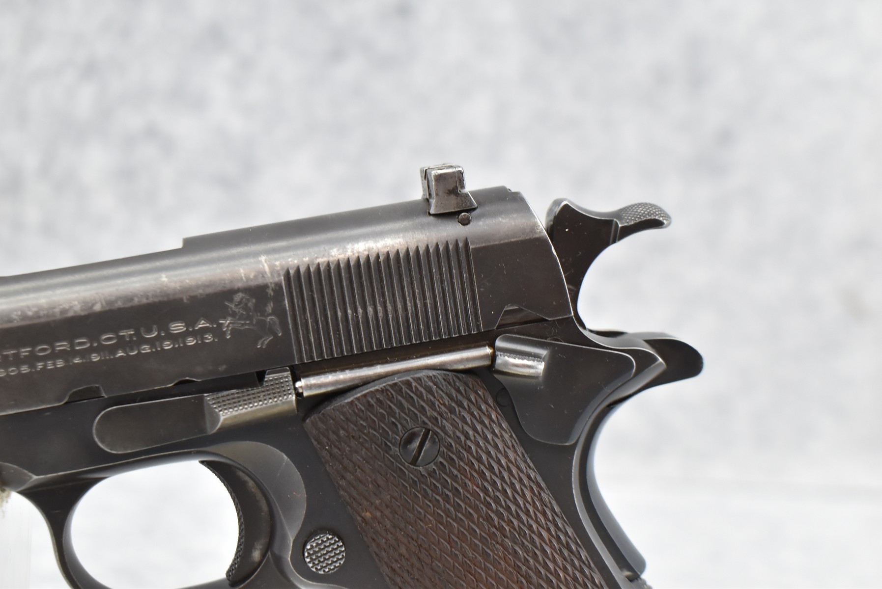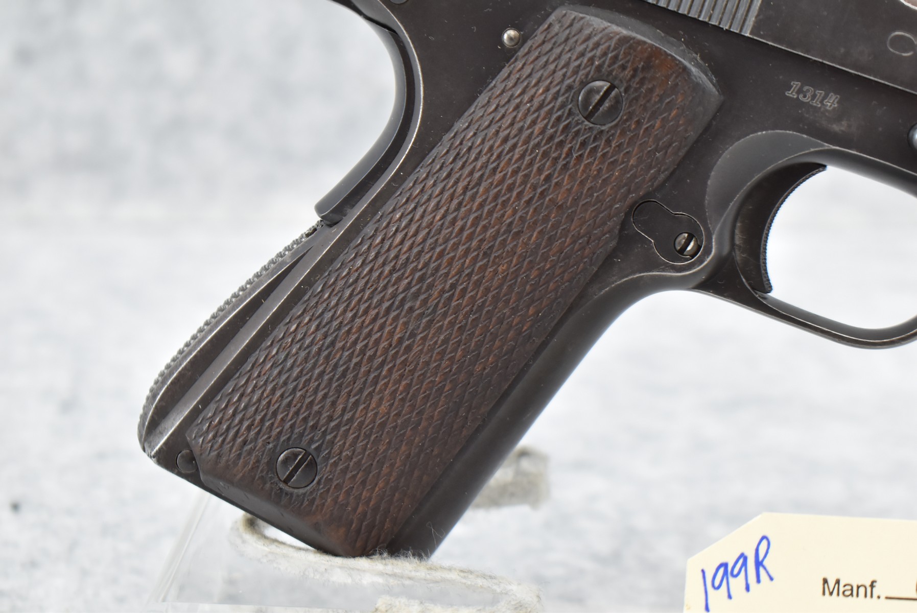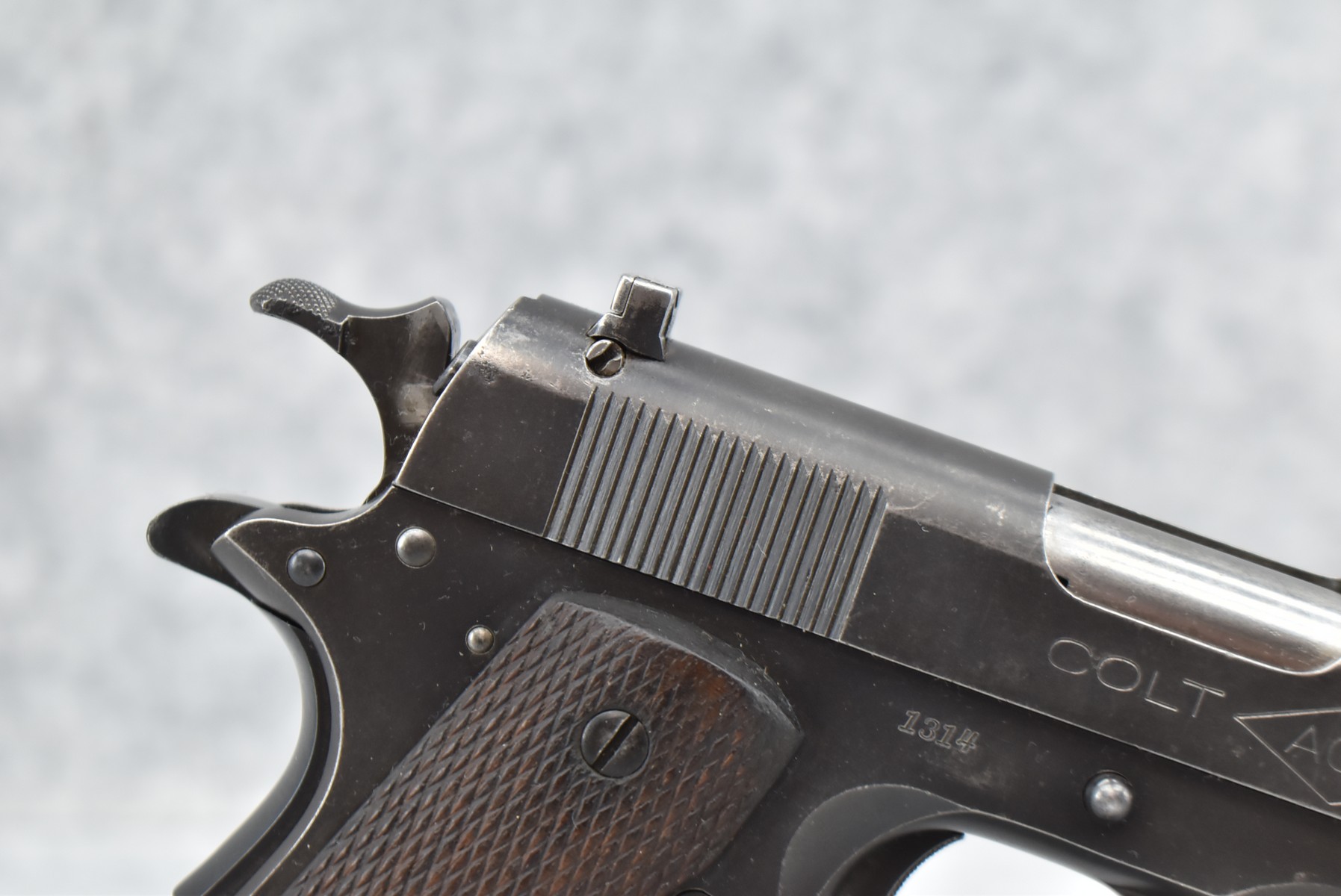 199R. Colt – Mod. ACE – 22LR Cal. Semi-Auto Pistol – w/4.75” Barrel w/Front Blade & Rear Adj. Square Notch Sight – Blued Finish – w/Checkered Wood Factory Grip – w/Factory Colt Two-Tone Magazine – w/Dovetail Grip Safety – Early 4 Digit Serial #1314, Mfg. 1931 First Year of Production – Only 10,935 Made!